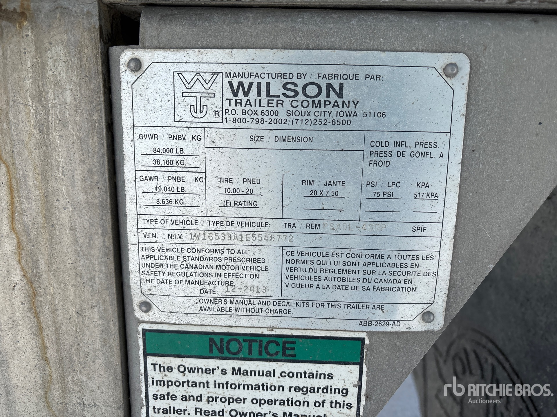 Les Informations détaillées de l’équipement sont d’une portée limitée, et les Encans Ritchie Bros. n’ont inspecté aucun autre aspect ou composant de l’équipement que ceux présentés expressément. Sauf indication précise, nous n’offrons aucune représentation ou garantie, officielle ou implicite, sur l’équipement ou ses composants, sans aucune limite de représentation ou de garantie en ce qui concerne la fonctionnalité, la conformité à toute norme de sécurité ou l’exigence de toute autorité ou agence de régulation en vigueur, l’adaptation à un quelconque usage, ou la valeur commerciale. Il vous est fortement conseillé d’effectuer votre propre inspection détaillée de l’équipement avant d’enchérir.