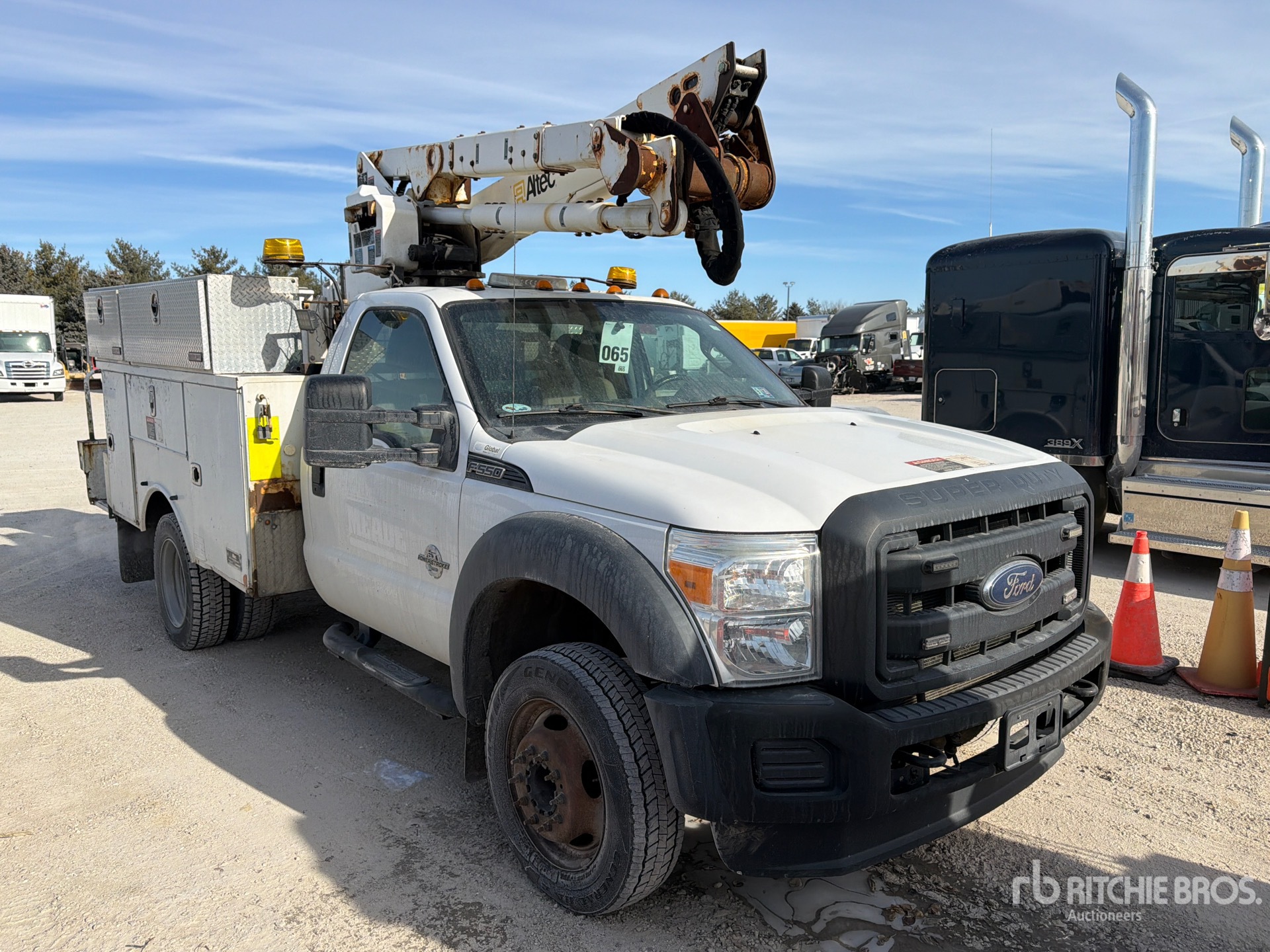 Moteur diesel V8 de 6,7 L, homologué EPA 2015, transmission automatique, essieu avant de 3 175 kg, essieux arrière de 6 175 kg, PTAC de 8 165 kg, pneus 225/70R19.5, suspension à ressorts, empattement de 3,58 m, prise de force centrale, flèche télescopique articulée monoplace, benne utilitaire de 3,76 m x 2,39 m