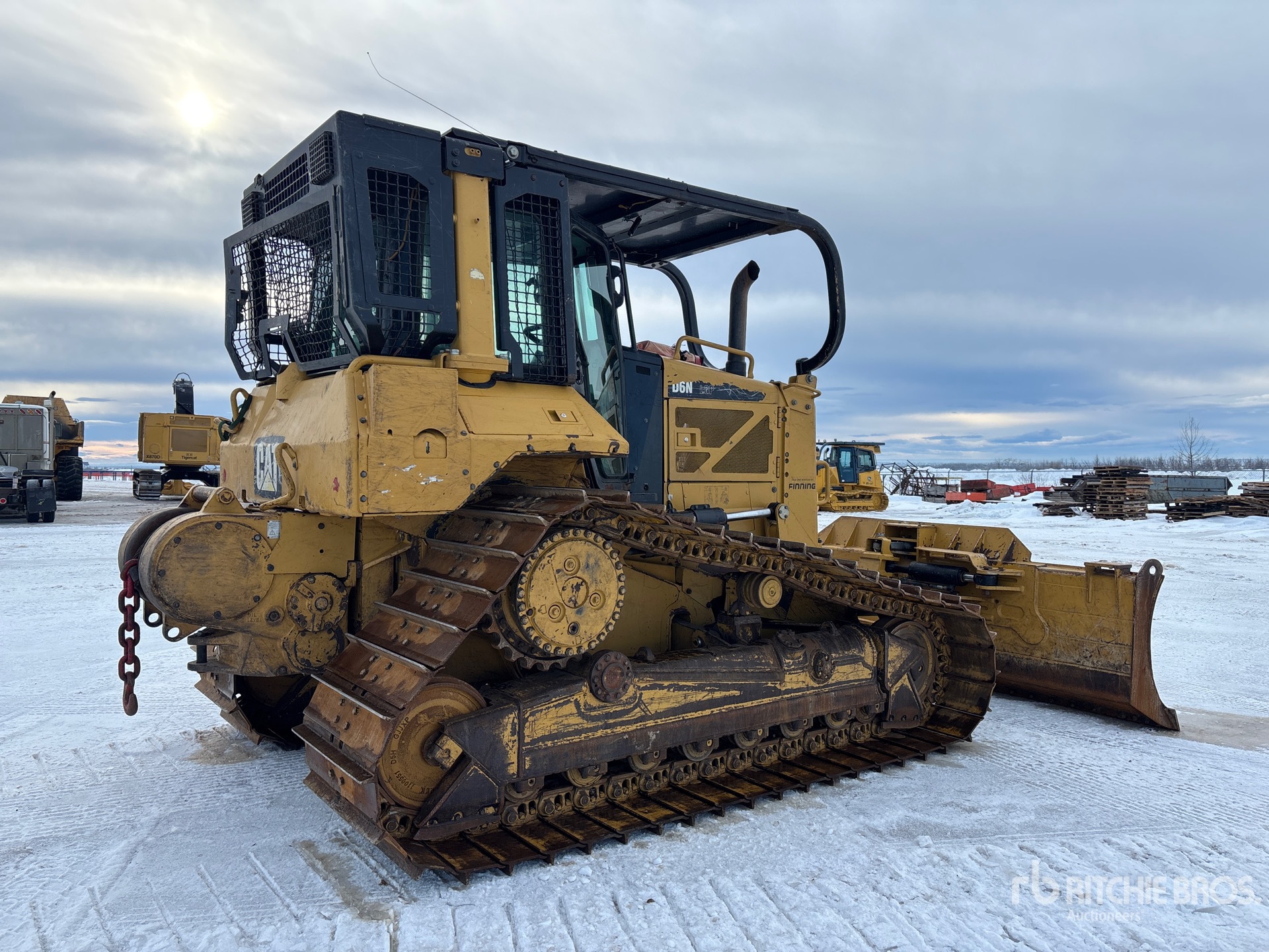 Cabine fermée, climatisation, précâblé pour le contrôle de nivellement, homologation EPA américaine 2014, conforme aux normes CARB, vanne d'arrêt d'air positive, balayeuses, lame droite de 156 po de large avec double inclinaison, chenilles à crampons simples de 34 po, treuil Carco 50BRS, contrôleur Top Con MC-R3