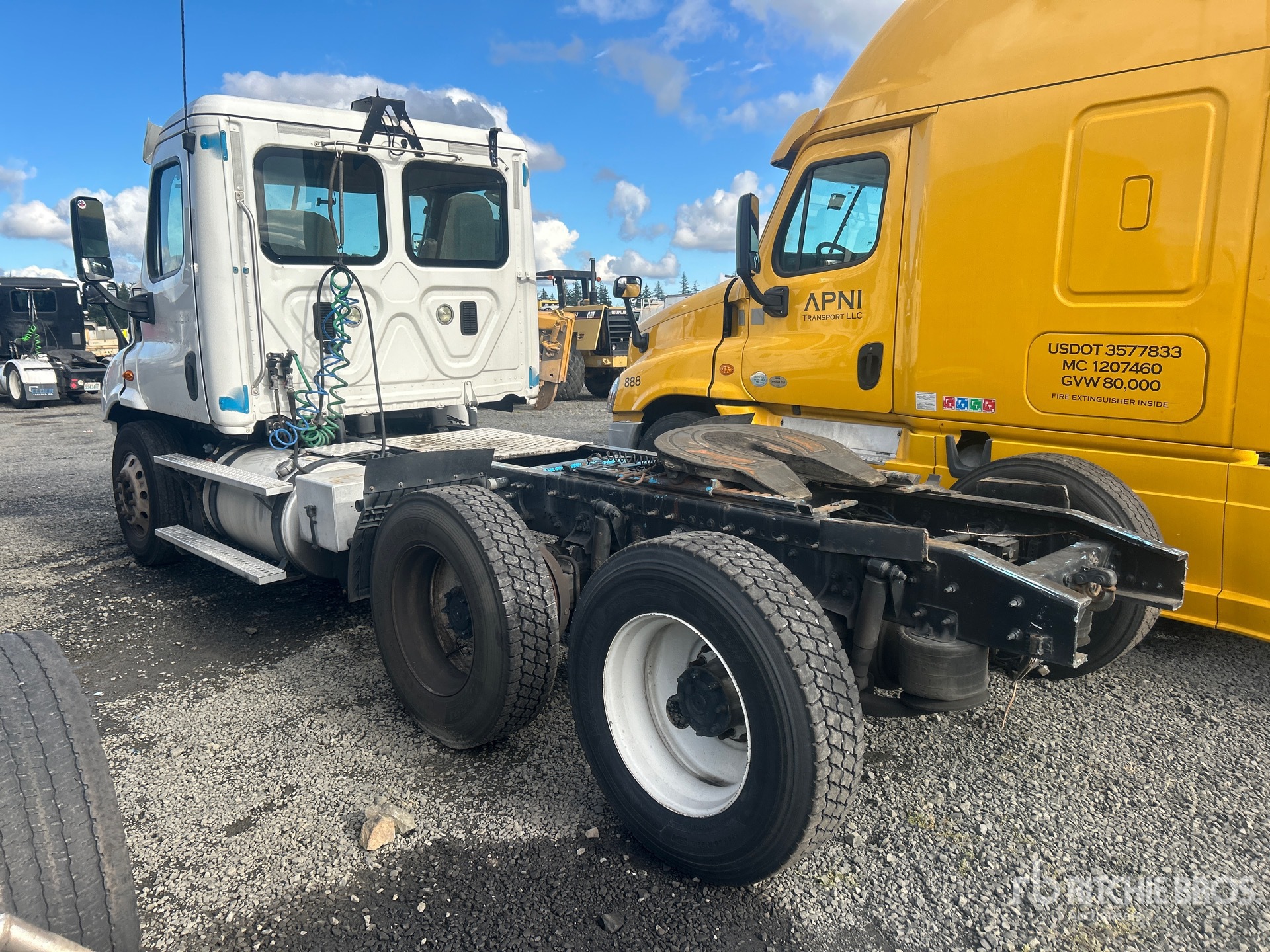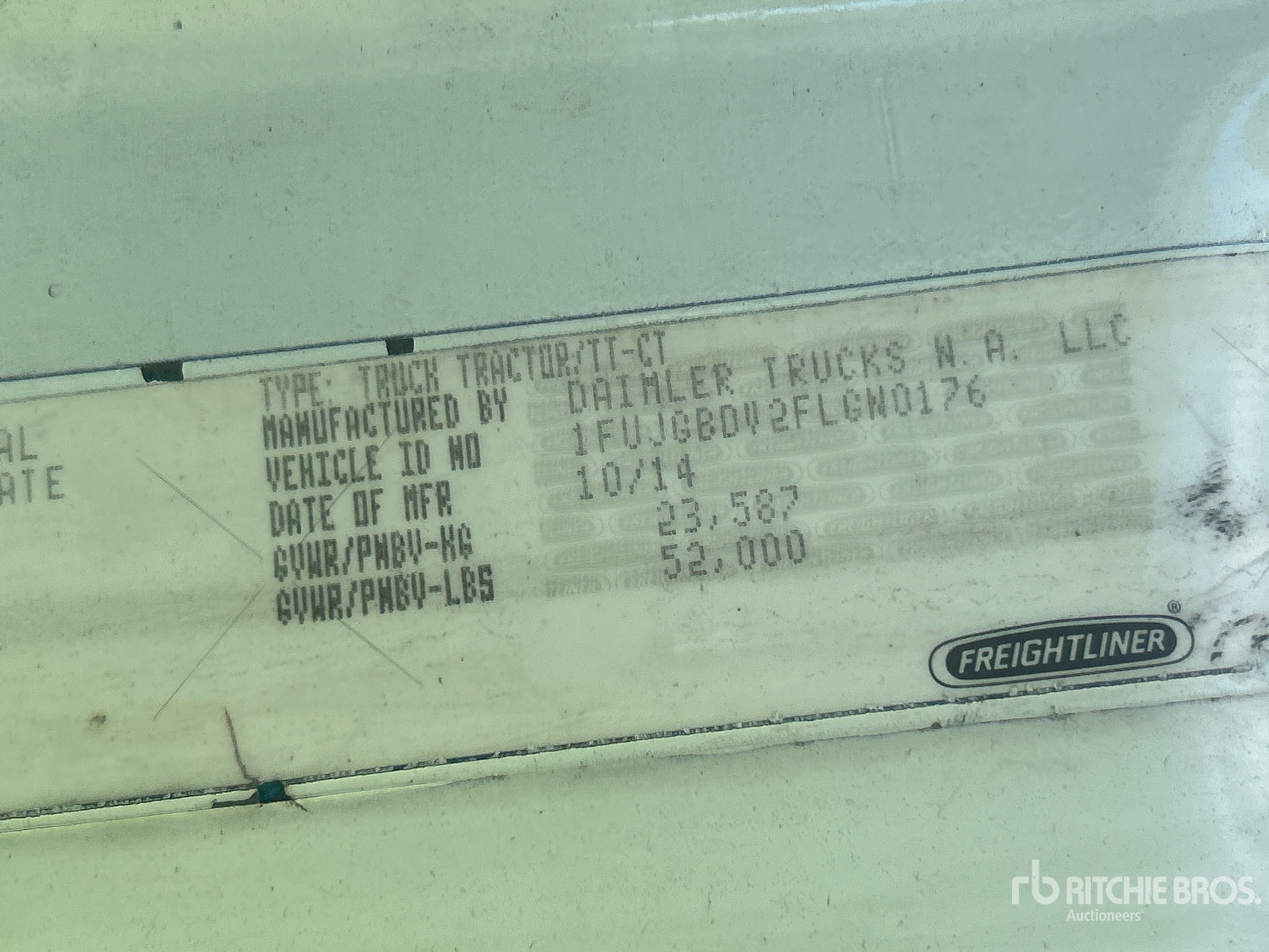 Moteur Detroit DD13 de 500 ch, homologué EPA (États-Unis) 2014, transmission automatique Eaton Fuller FO-16E310C-LAS, essieu avant de 5 443 kg (12 000 lb), essieu arrière de 18 000 kg (40 000 lb), PNBV de 2 363 kg (52 000 lb), frein moteur, empattement de 4 541 cm (179 po), suspension pneumatique, 295/75R22.5, sellette d'attelage coulissante pneumatique.