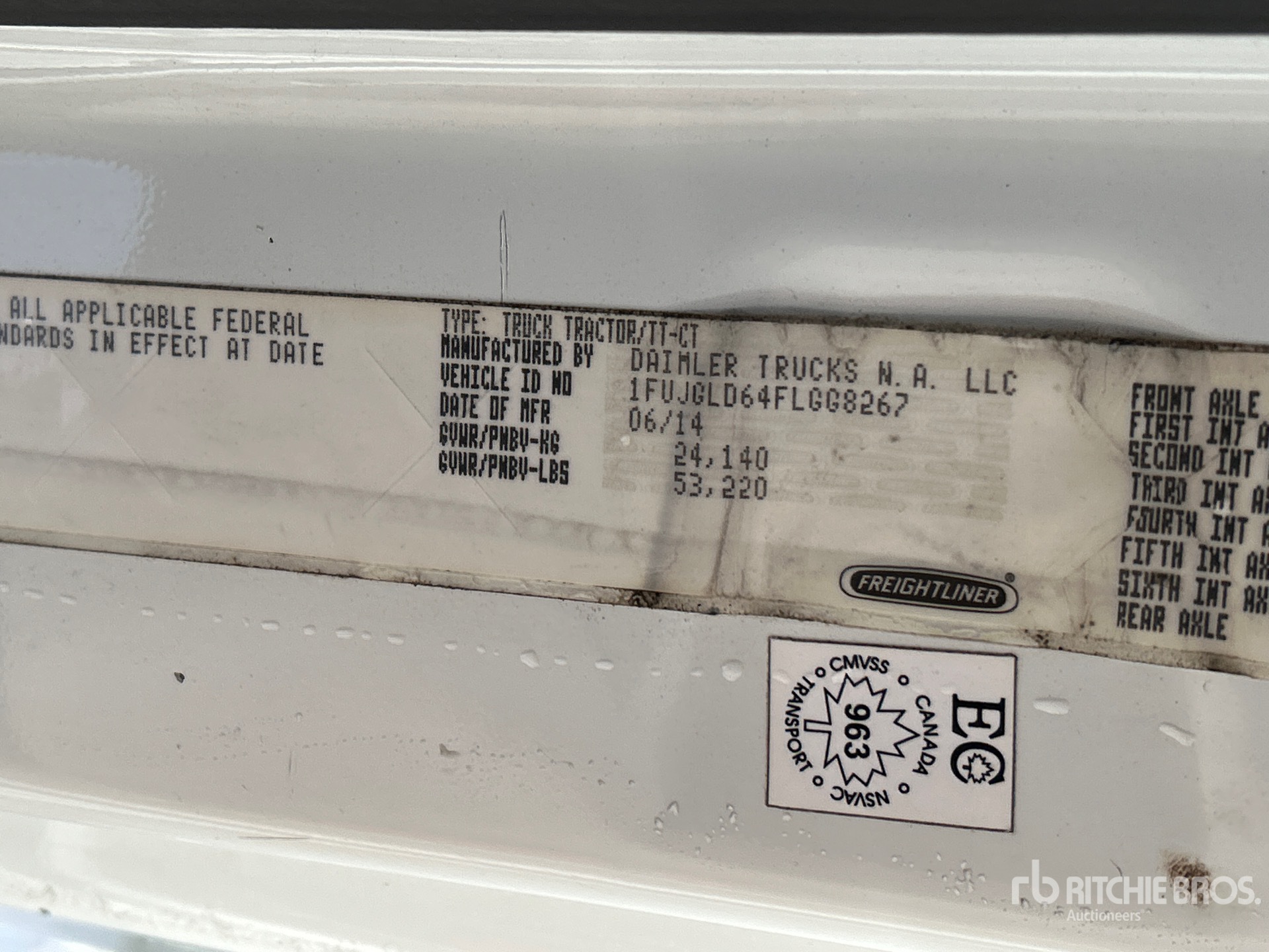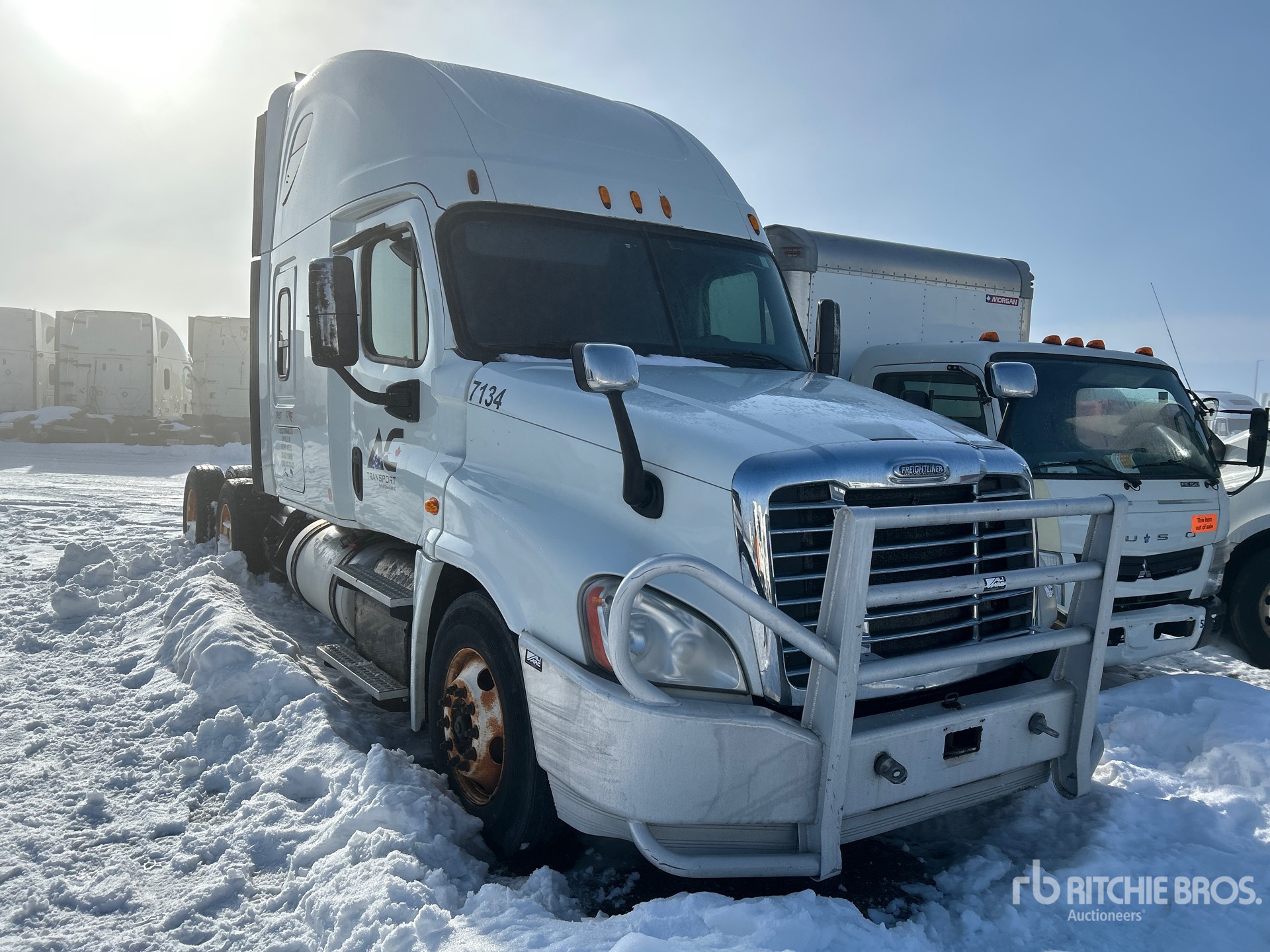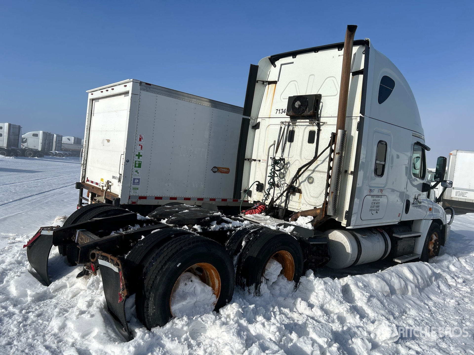 Situé sur la voie 20, emplacement 61, moteur Detroit, 17 259 heures moteur, transmission automatisée Eaton Fuller FO-16E310C-LAS, essieu avant de 13 220 lb, essieu arrière de 40 000 lb, PTAC de 53 220 lb, frein moteur, cabine couchette surélevée de 70 po, lits superposés, empattement de 230 po, suspension pneumatique, pneus 11R22.5, sellette d'attelage coulissante pneumatique, deux réservoirs de carburant.
