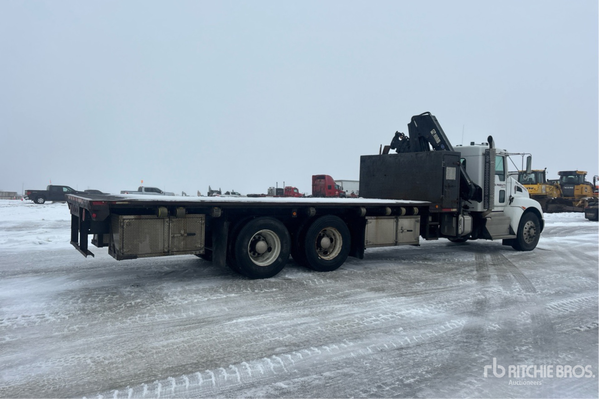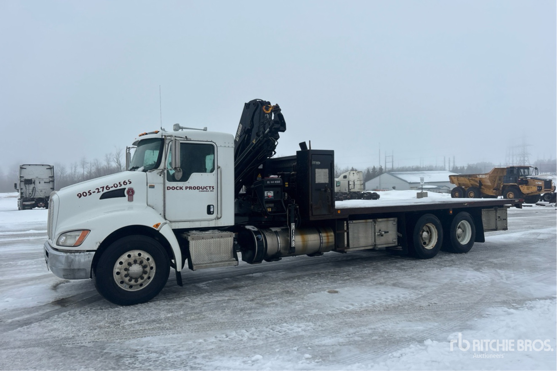 Situé sur la voie 14, emplacement 19, ce camion Paccar PX-9 est équipé d'un moteur diesel 6 cylindres de 8,9 L développant 330 ch, homologué EPA (États-Unis) 2015, conforme aux normes CARB, nécessite un fluide d'échappement diesel (DES), affiche 8 852 heures de fonctionnement, est équipé d'un frein moteur, d'une transmission manuelle Eaton Fuller FRO-11210C à 10 vitesses, d'un essieu avant de 7 258 kg, d'essieux arrière de 18 144 kg, d'un PTAC de 25 402 kg, de roues avant en aluminium, de pneus 11R22.5, d'une suspension pneumatique Hendrickson, d'un empattement de 280 pouces, d'une prise de force, d'une flèche à 5 sections de 3,1 m à 12,2 m, de stabilisateurs déployables et rétractables, d'une télécommande filaire et d'une benne de 24 pieds x 1027 pouces.
