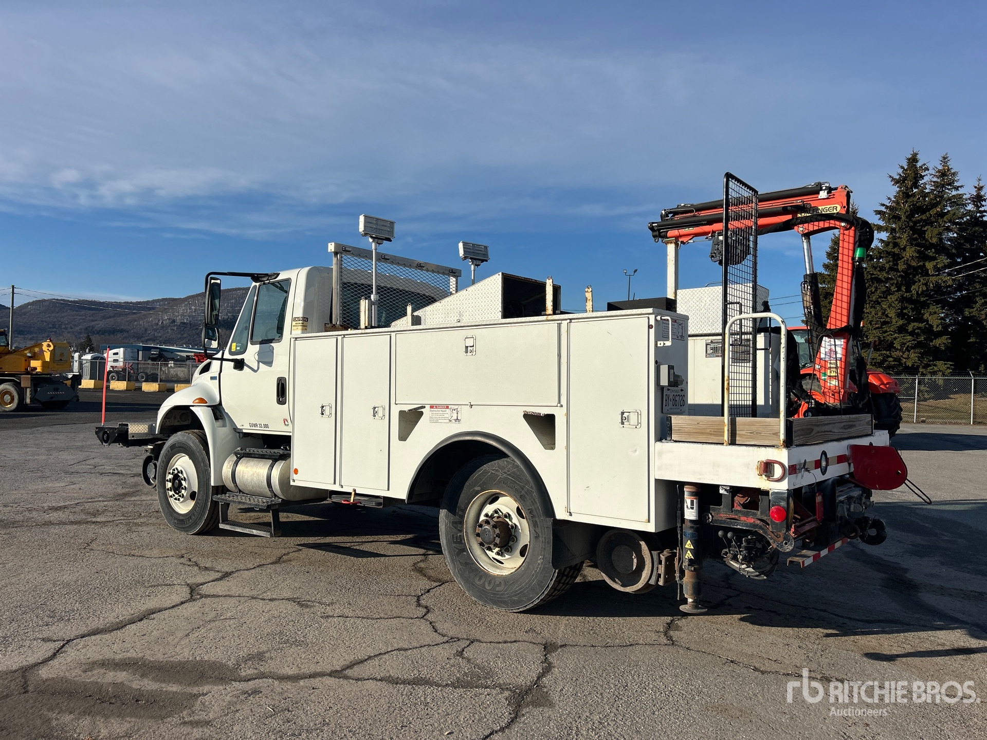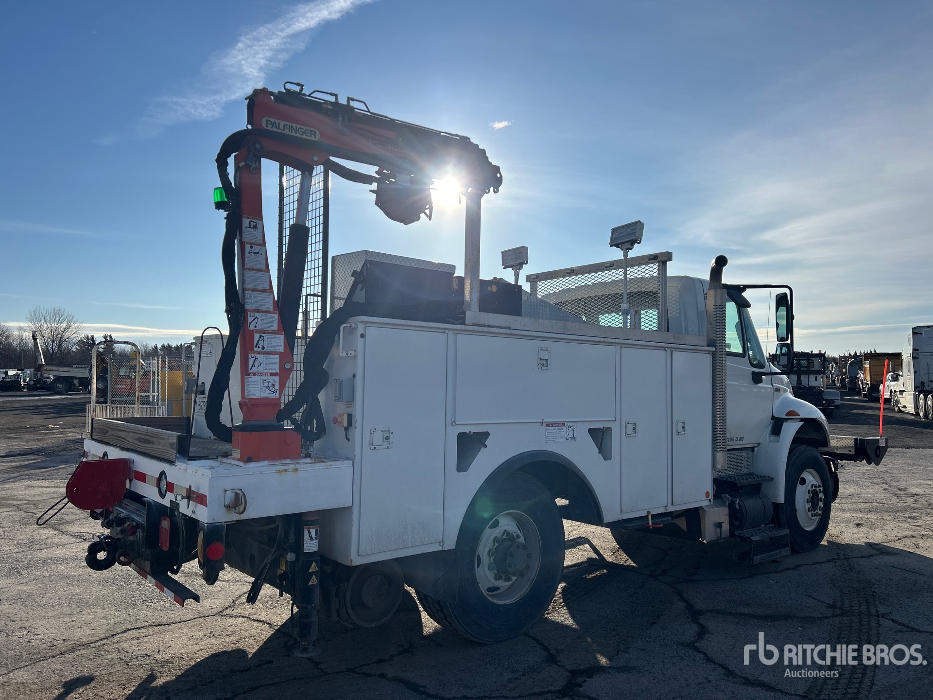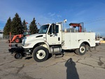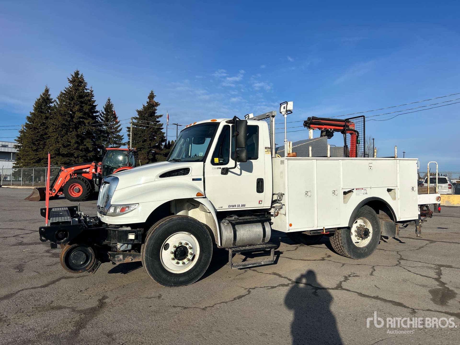 Moteur diesel International MaxxForce DT 6 cylindres 230 ch, homologué EPA US 2014, 1115 heures moteur, transmission automatique Allison 3000, essieu avant 5443 kg, essieu arrière 9525 kg, PTAC 14997 kg, pneus avant 11R22.5, pneus arrière Super Singles 425/65R22.5, suspension à ressorts, empattement 978 mm, prise de force, système hydraulique, benne Dakota 60 kg 4 m de long, stabilisateurs hydrauliques, grue hydraulique Palfinger PC3800 2014 2000 kg à 4 sections, télécommande sans fil, trousse ferroviaire, tendeur de câble