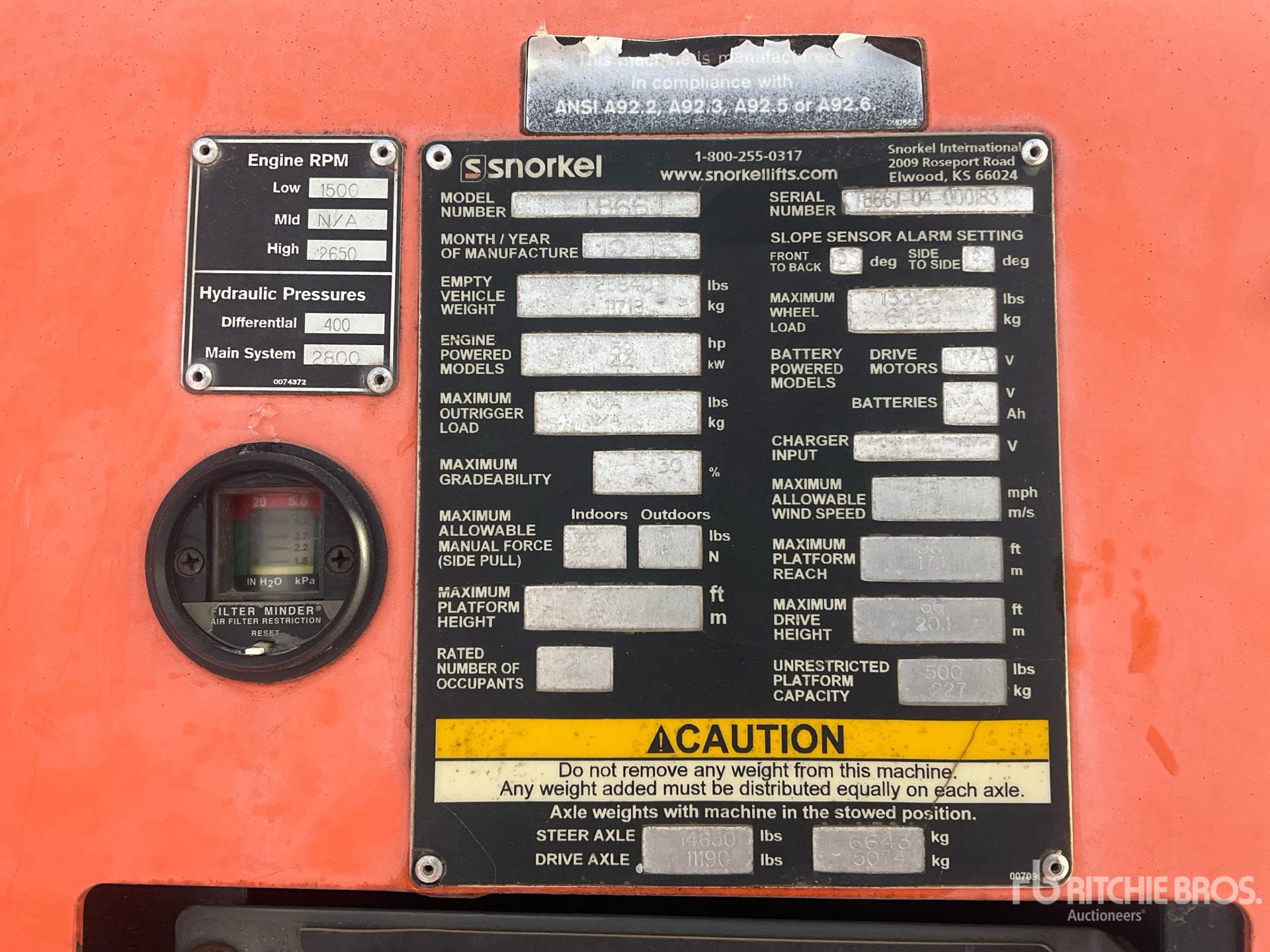 Hauteur de plateforme maximale de 20 m (66 pi), capacité de charge maximale de 227 kg (500 lb), flèche, alimentation électrique de la plateforme, étiquette EPA américaine 2015, moteur diesel Kubota V2403-M-T-ET05 à 4 cylindres de 44 kW et 2,4 L, pneus 15-19,5