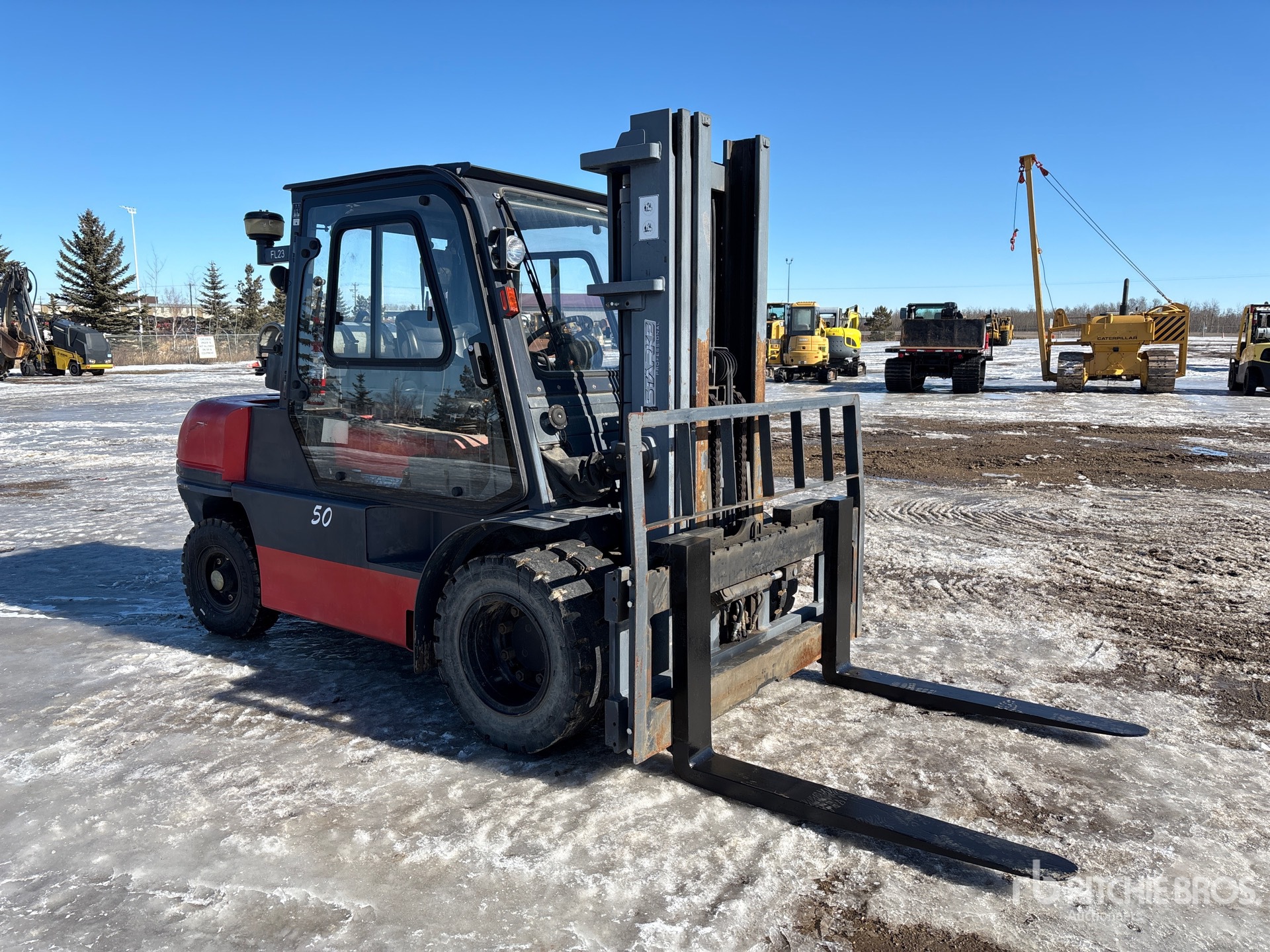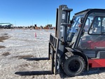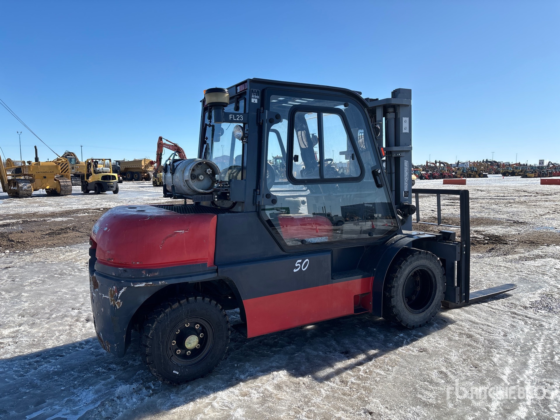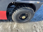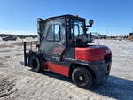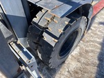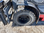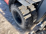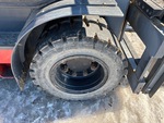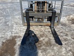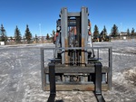 Cabine fermée, mât à 3 sections, levage libre total, hauteur de mât abaissée de 234 cm, fourches de 122 cm, déport latéral, moteur GPL 6 cylindres, roues jumelées