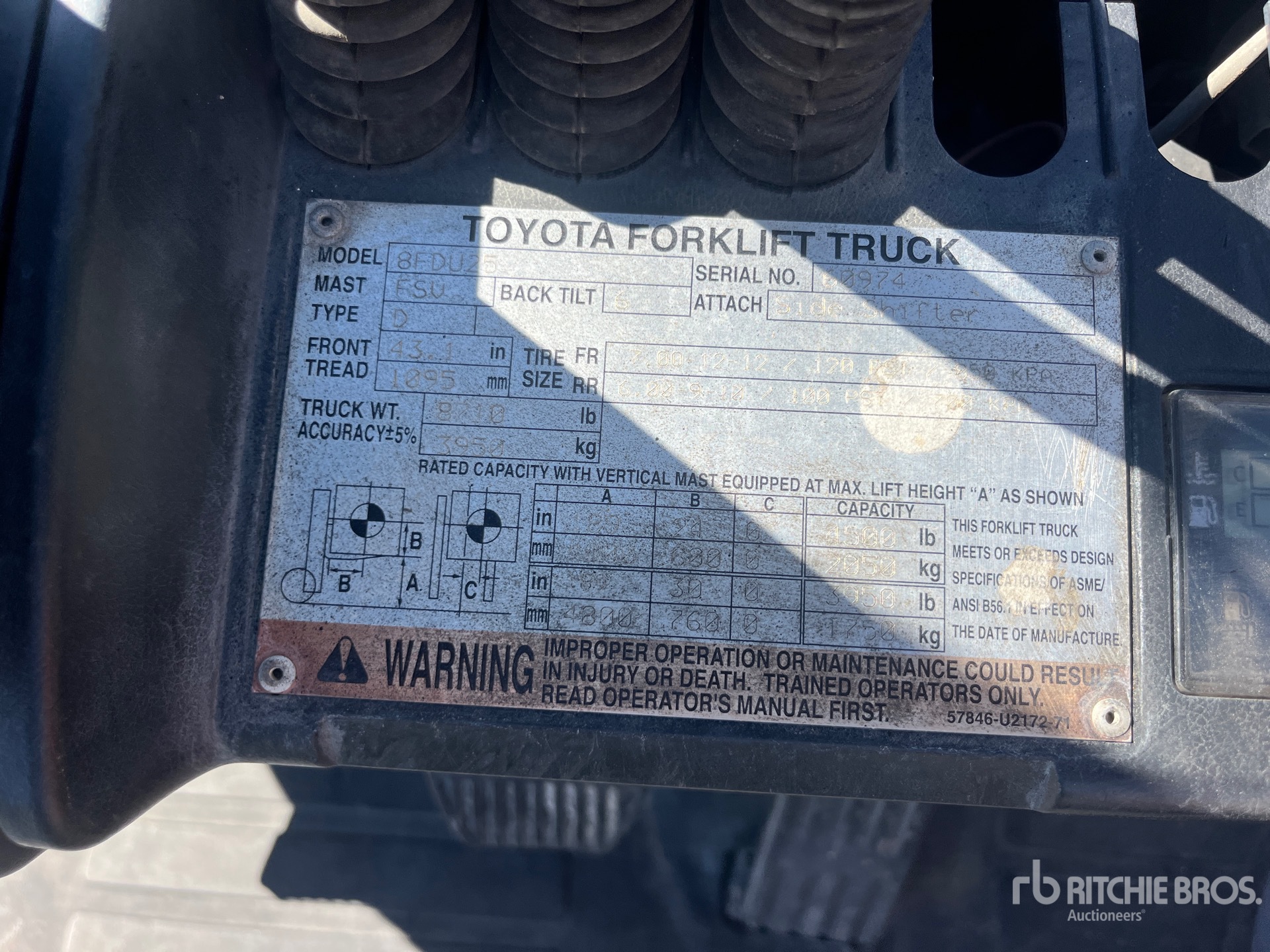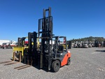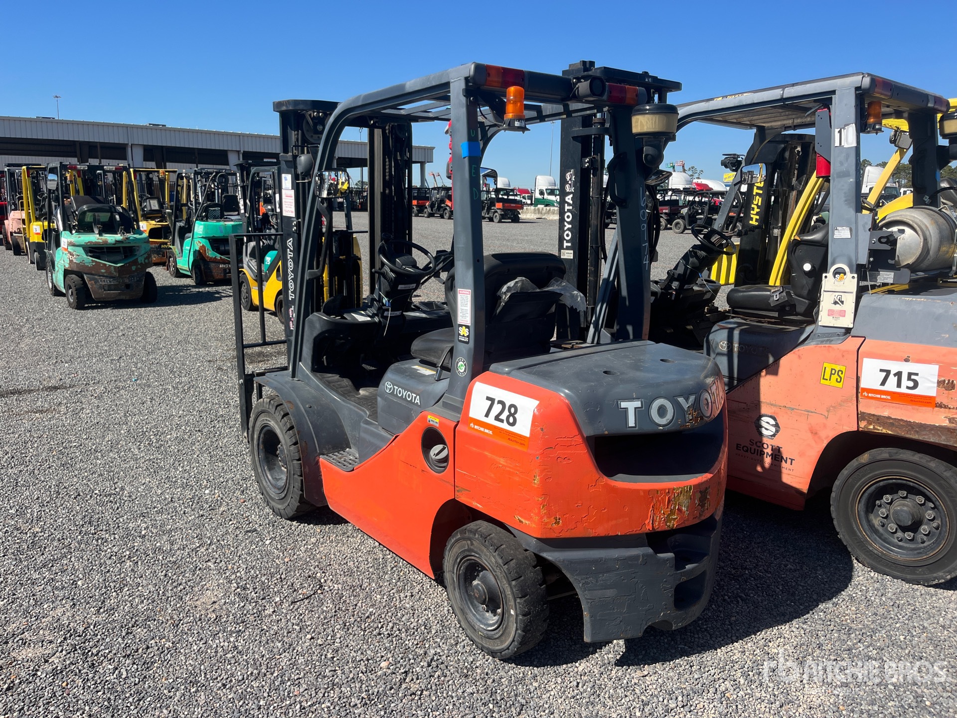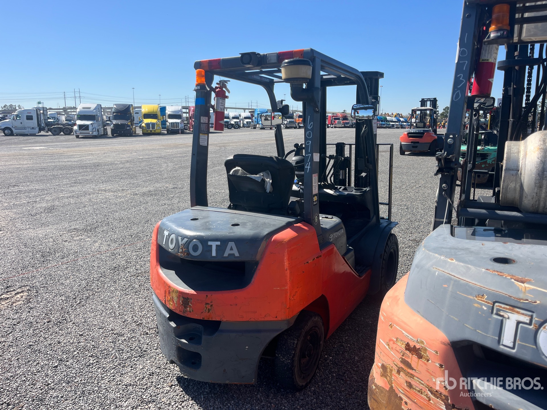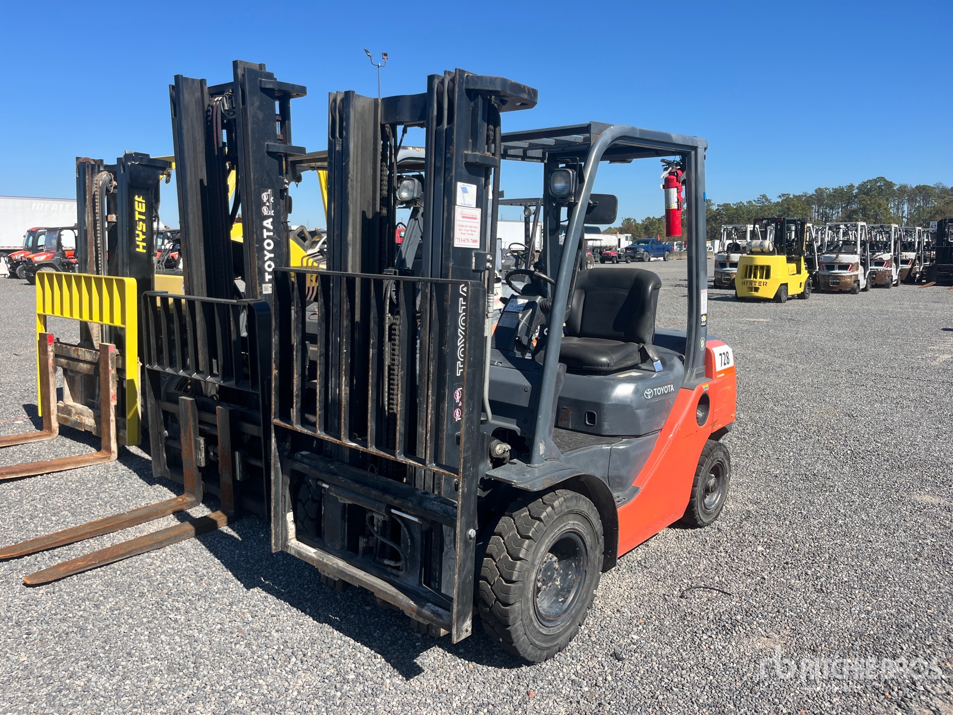 Mât à 3 sections, levage libre total, hauteur de levage maximale de 4,80 m (189 po), hauteur de mât abaissée de 2,18 m (86 po), déplacement latéral, pneus pleins, homologation EPA américaine 2016, moteur diesel Toyota GTIEL01 à 3 cylindres de 1,795 L