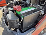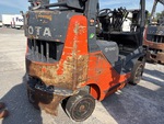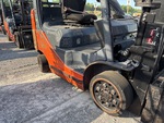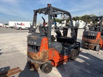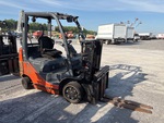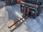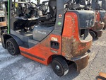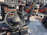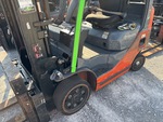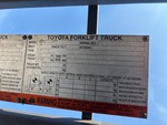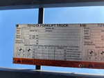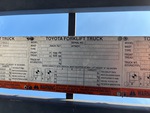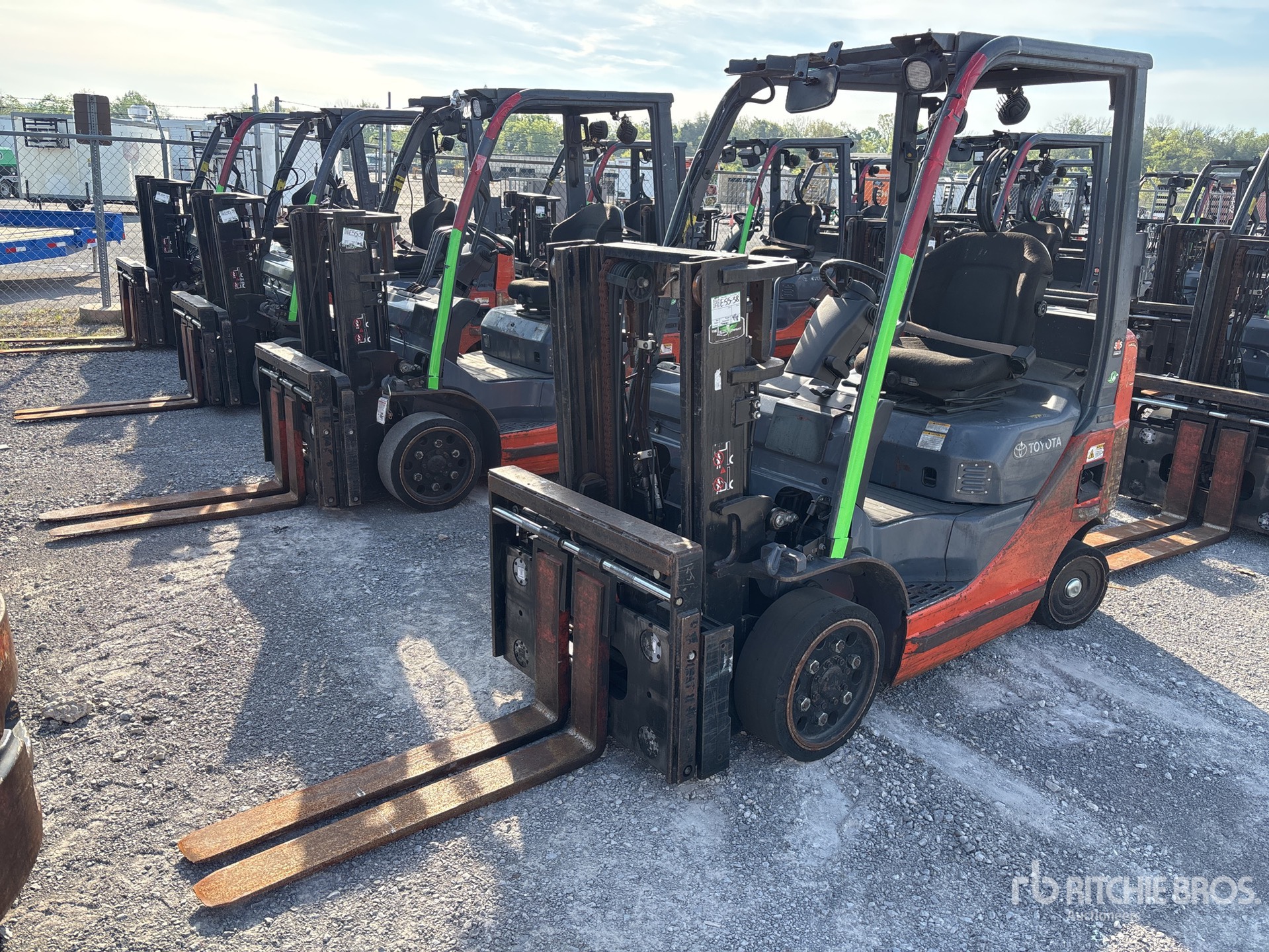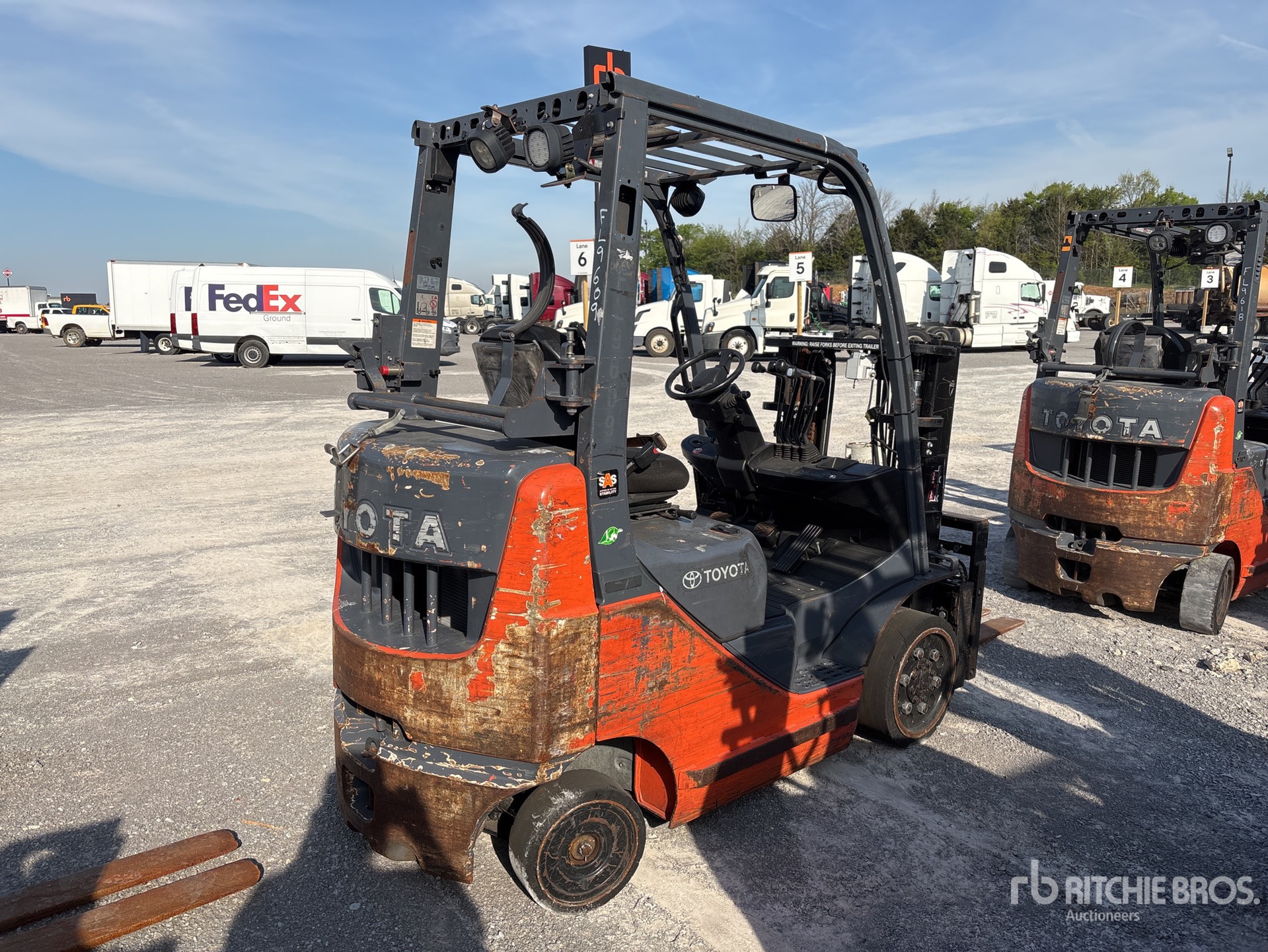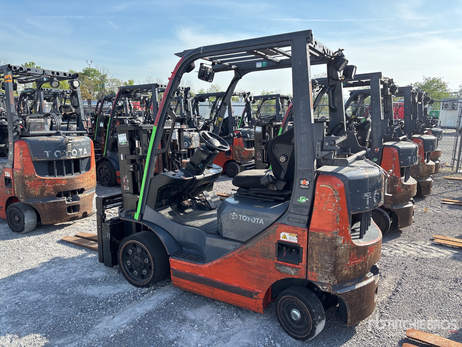 Mât à deux étages, hauteur de levage maximale de 203 cm, hauteur de mât abaissée de 142 cm, fourches de 107 cm, déport latéral, positionneur de fourches, pneus pleins, homologation EPA américaine 2015, moteur Toyota 4 cylindres 2,2 L GPL