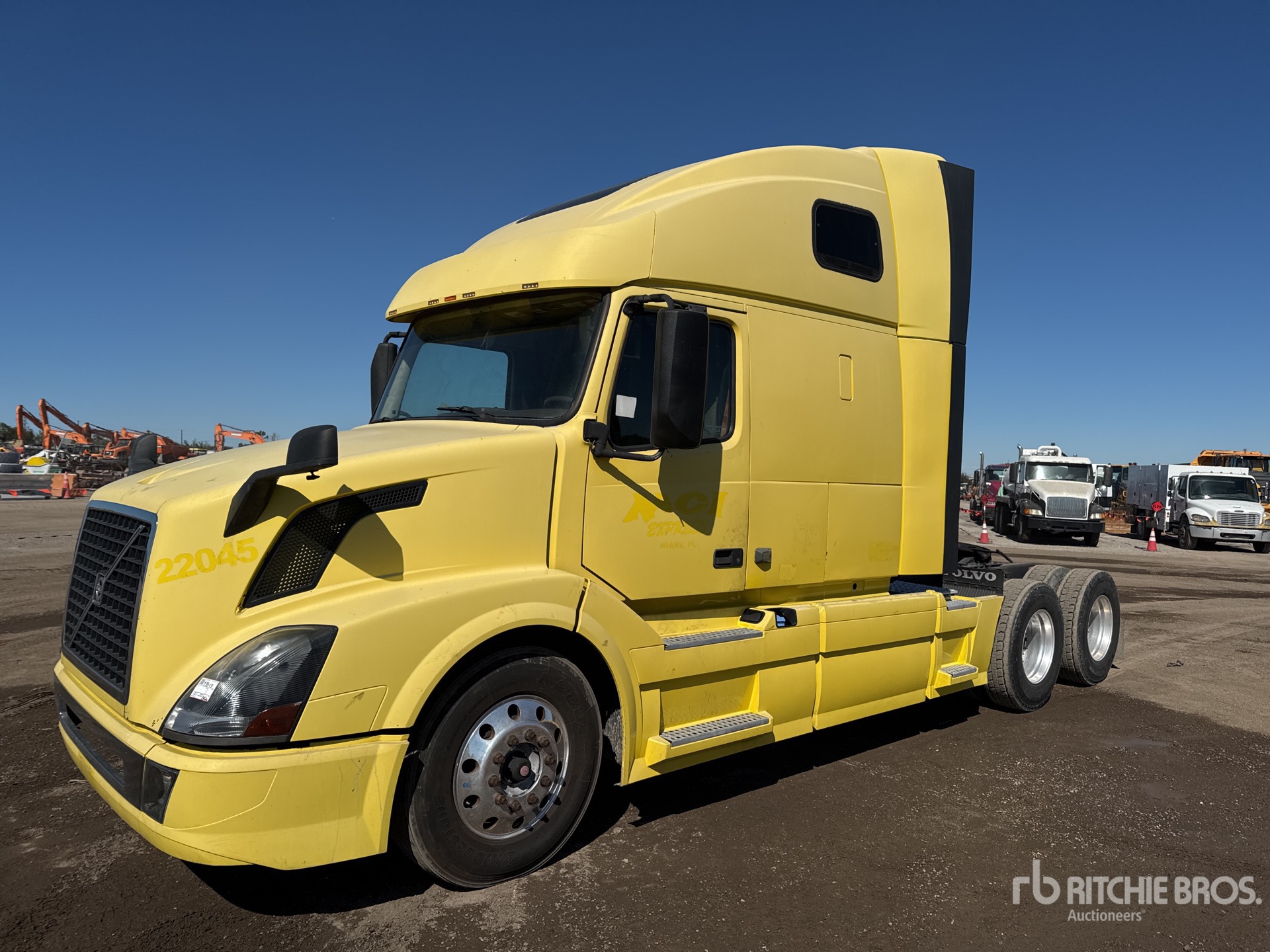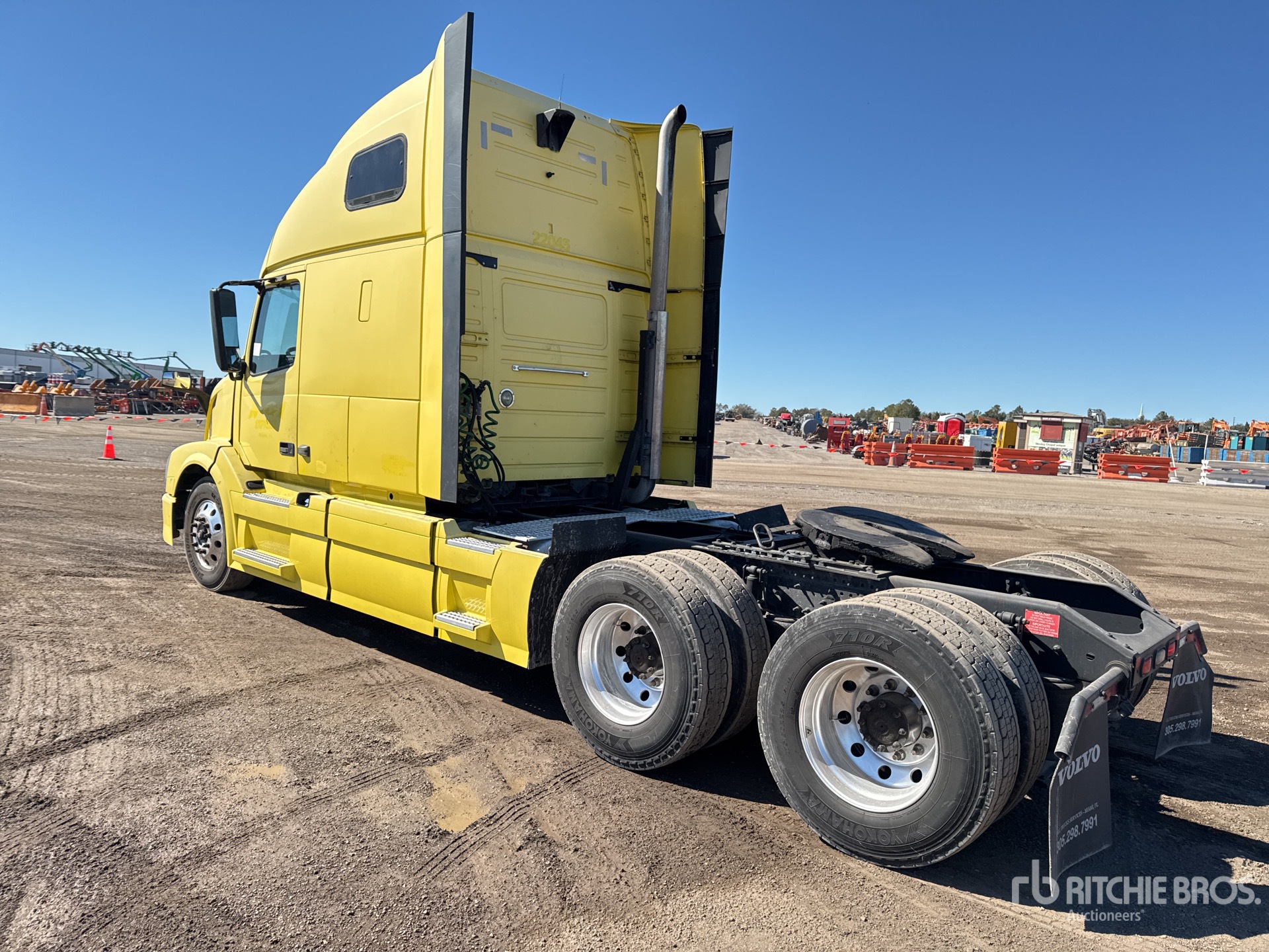 Situé sur la voie 83, emplacement 20, moteur Volvo D13M de 455 ch, 1054 heures moteur, transmission automatisée Volvo ATO2612D à 12 vitesses, essieu avant de 5580 kg, essieu arrière de 1700 kg, PTAC de 22800 kg, ralentisseur, cabine couchette surélevée de 155 cm, lits superposés, empattement de 563 cm, suspension pneumatique, jantes en aluminium, pneus 295/75R22.5, sellette d'attelage coulissante pneumatique, double réservoir de carburant.