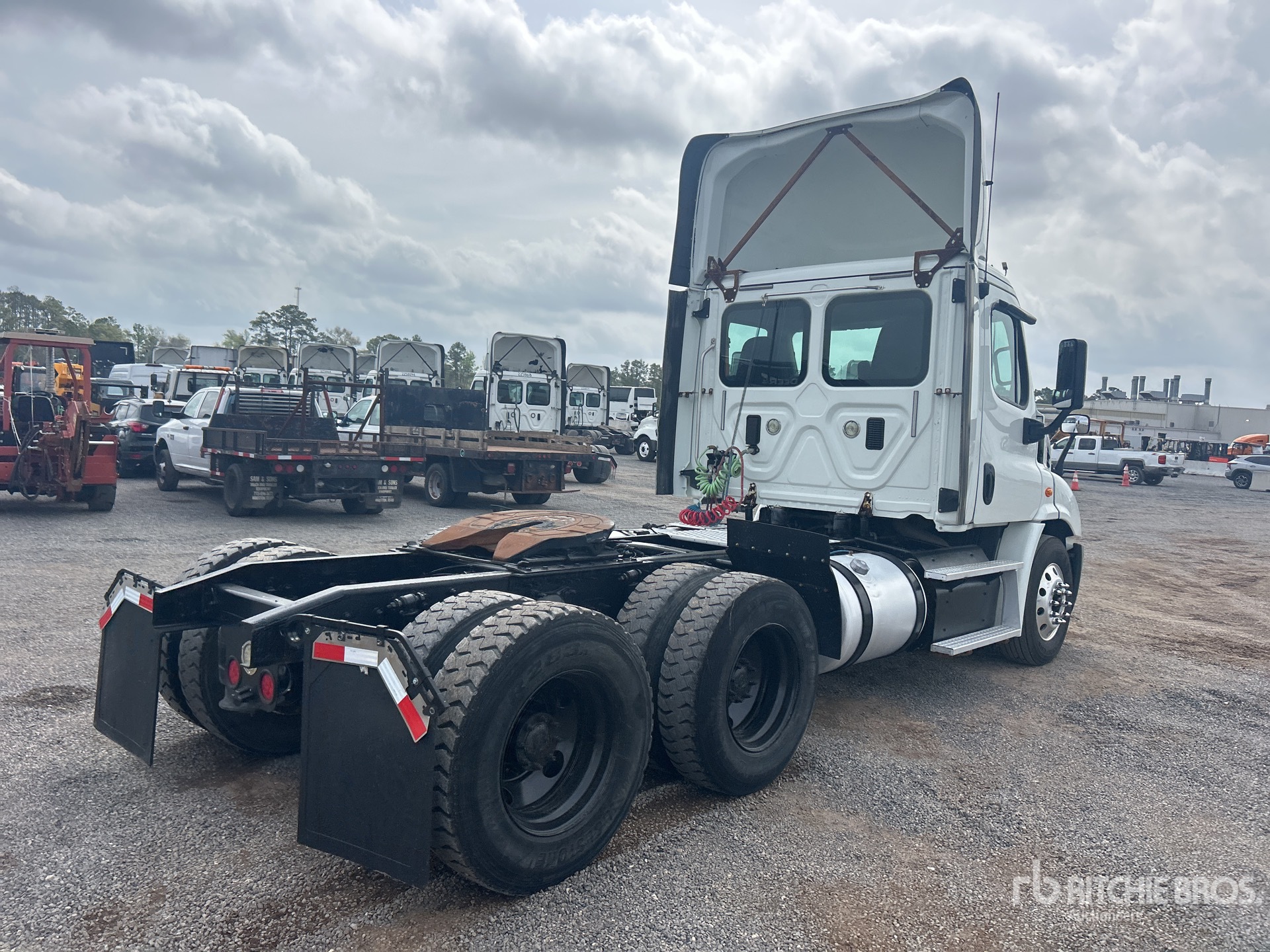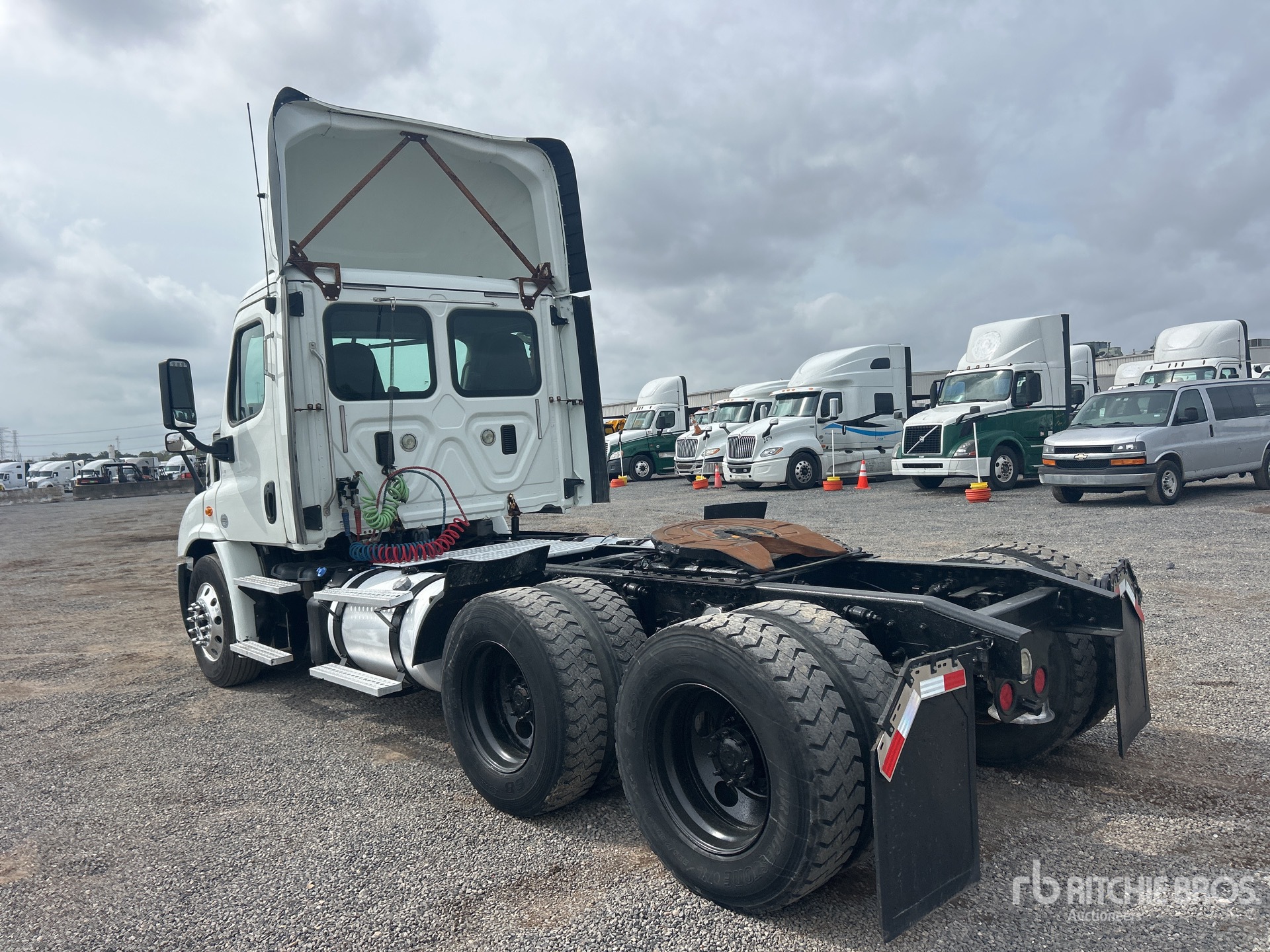 Situé sur la voie 31, emplacement 35, moteur Cummins ISX12 de 400 ch, homologué EPA 2016, transmission automatisée Eaton Fuller FO-16E310C, essieu avant de 5 443 kg, essieu arrière de 18 144 kg, PTAC de 23 591 kg, frein moteur, empattement de 4,52 m, suspension pneumatique, roues avant en aluminium, pneus 295/75R22.5, sellette d'attelage coulissante pneumatique, deux réservoirs de carburant.