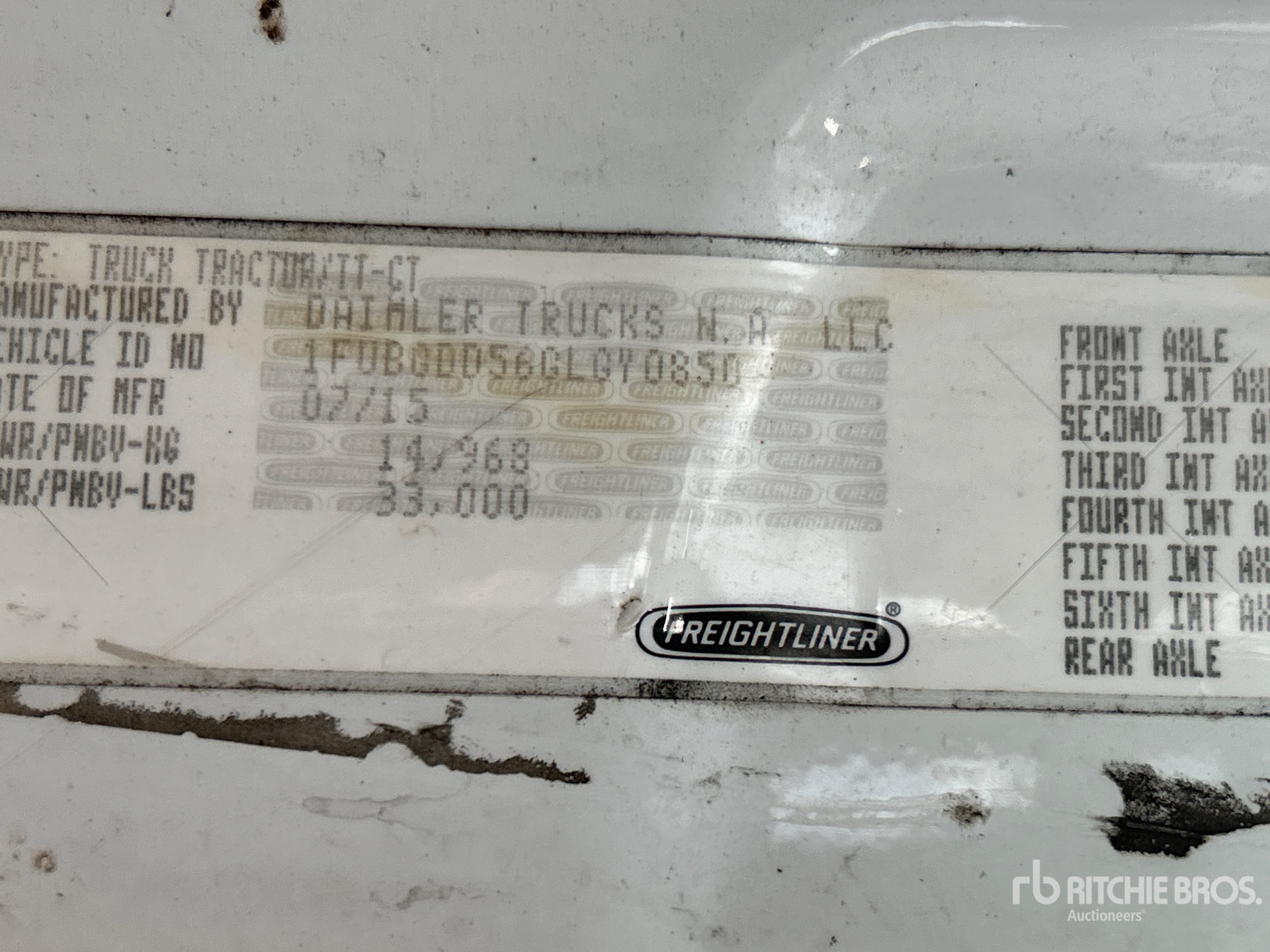 Moteur Detroit DD15 de 455 ch, homologué EPA 2016, 17 751 heures de fonctionnement, boîte de vitesses manuelle Eaton Fuller FRO-15210C à 10 rapports, essieu avant de 5 443 kg, essieu arrière de 9 525 kg, PTAC de 14 997 kg, frein moteur, empattement de 4 011 mm, suspension pneumatique, pneus 11R22.5, réservoir double de carburant