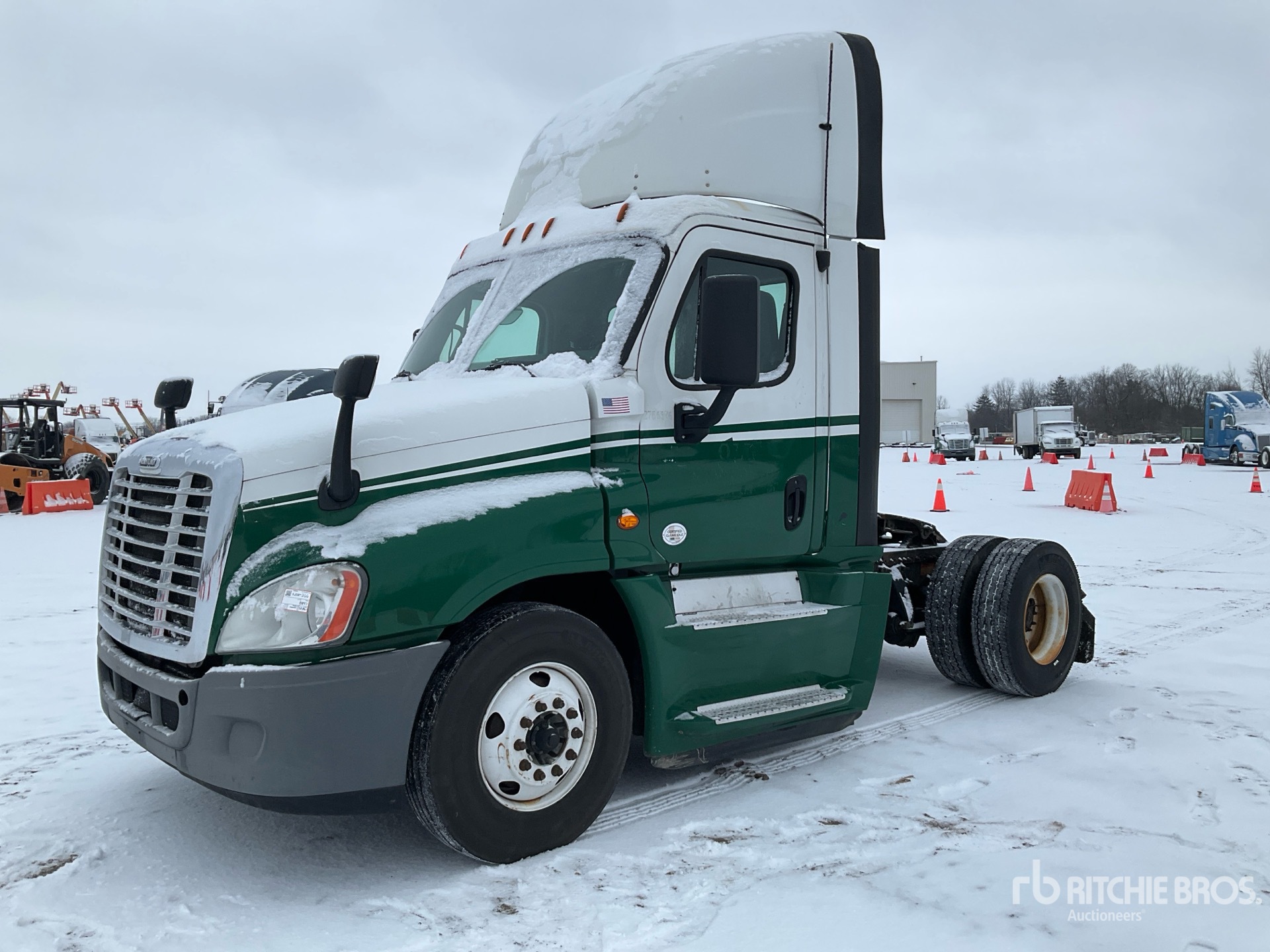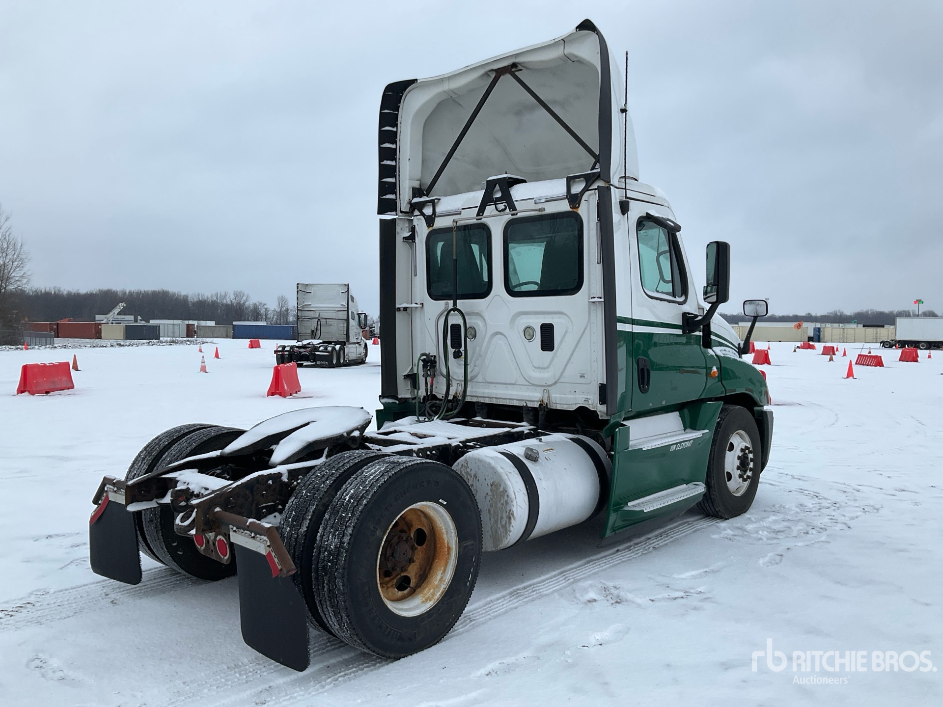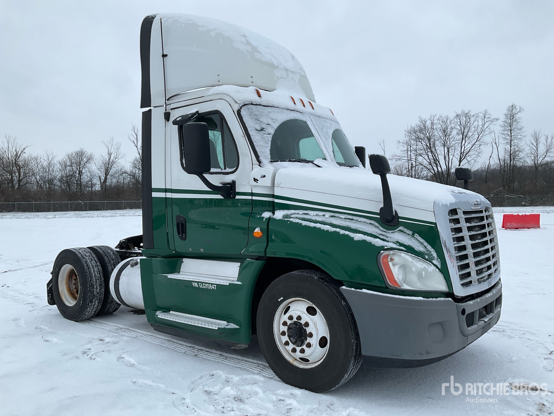 Moteur Detroit DD15 de 455 ch, homologué EPA 2015, 14 432 heures de fonctionnement, transmission manuelle Eaton Fuller FRO-15210C à 10 vitesses, essieu avant de 5 443 kg, essieu arrière de 9 525 kg, PTAC de 14 976 kg, empattement de 4 011 mm, suspension pneumatique, pneus 11R22.5, réservoir de carburant double
