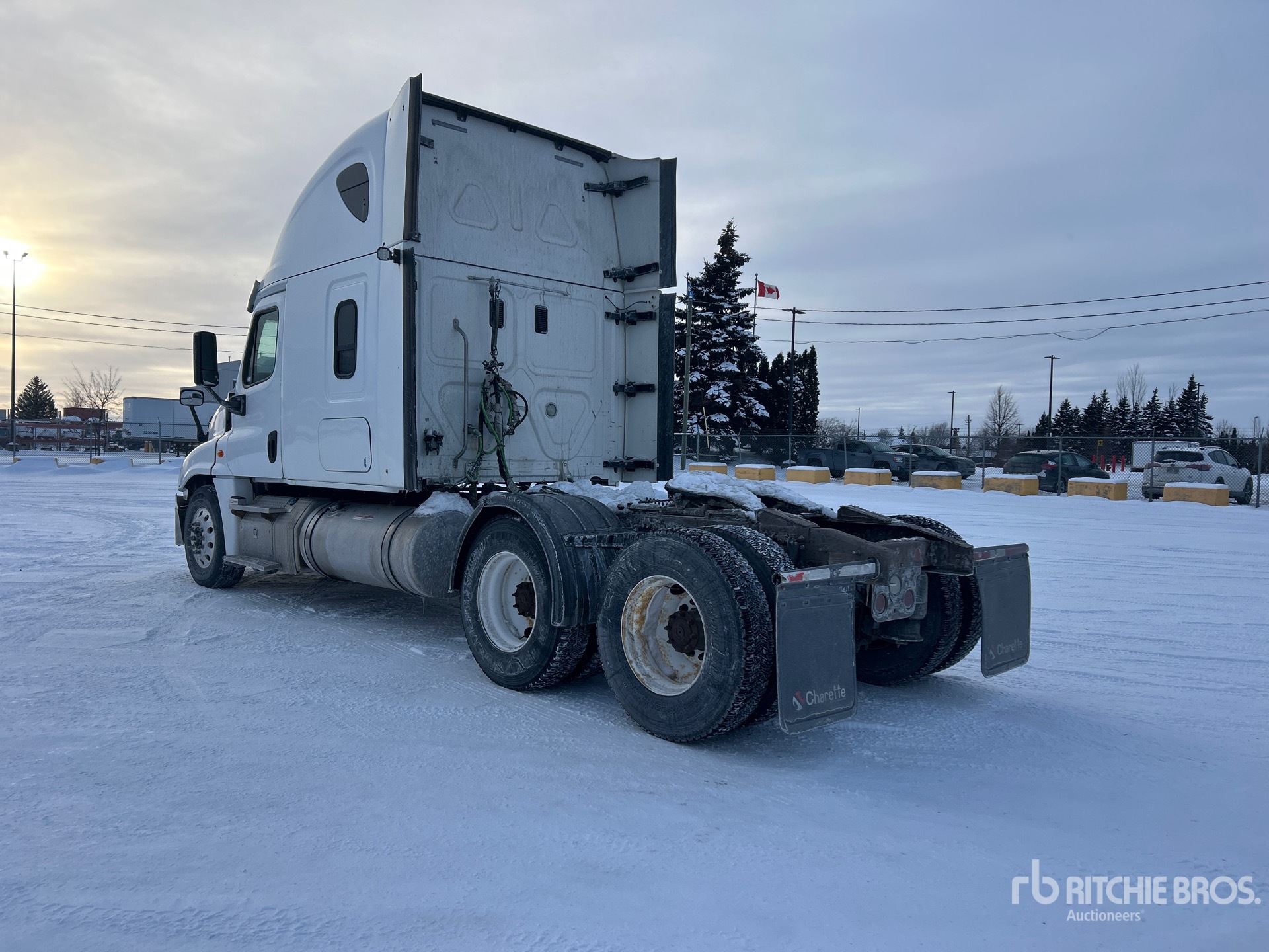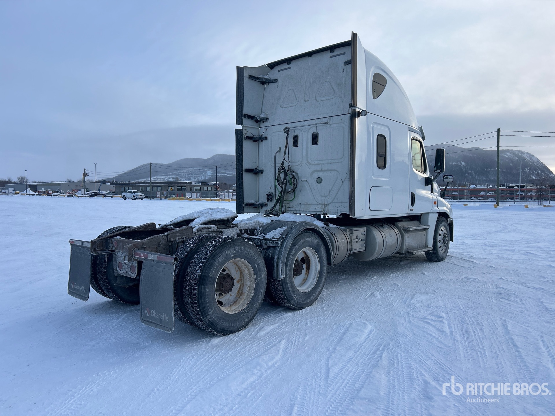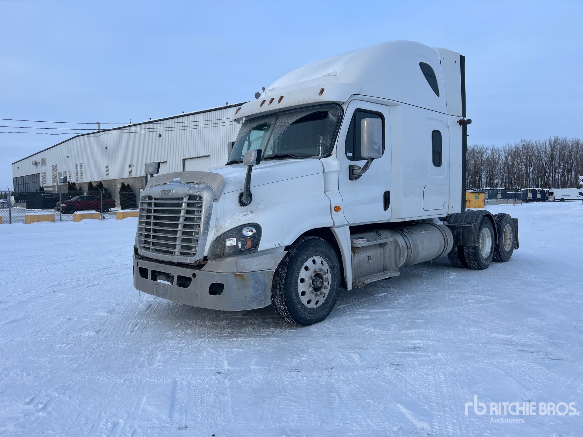 Situé sur la voie 22, emplacement 12, moteur Detroit DD15 de 455 ch, 20 081 heures de fonctionnement, transmission manuelle Eaton Fuller RTLO-16913A à 13 vitesses, essieu avant de 12 000 lb, essieu arrière de 40 000 lb, PTAC de 23 587 kg, frein moteur, cabine couchette surélevée de 60 po, lits superposés, chauffage de couchette, empattement de 224 po, suspension pneumatique, roues avant en aluminium, pneus avant et arrière 11R22.5, trousse hydraulique, sellette d'attelage coulissante pneumatique, deux réservoirs de carburant.