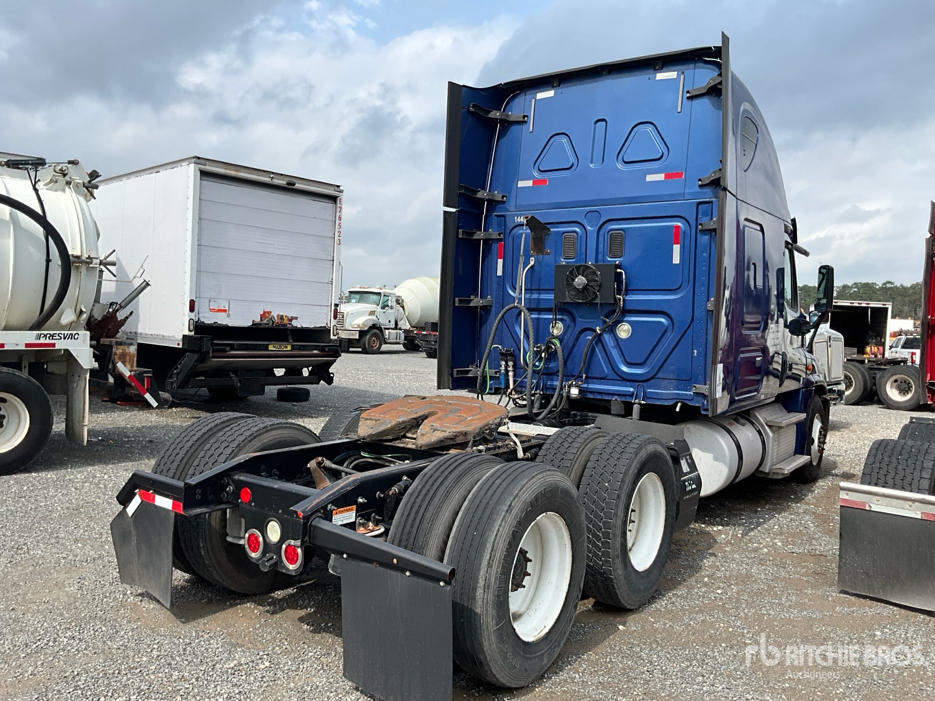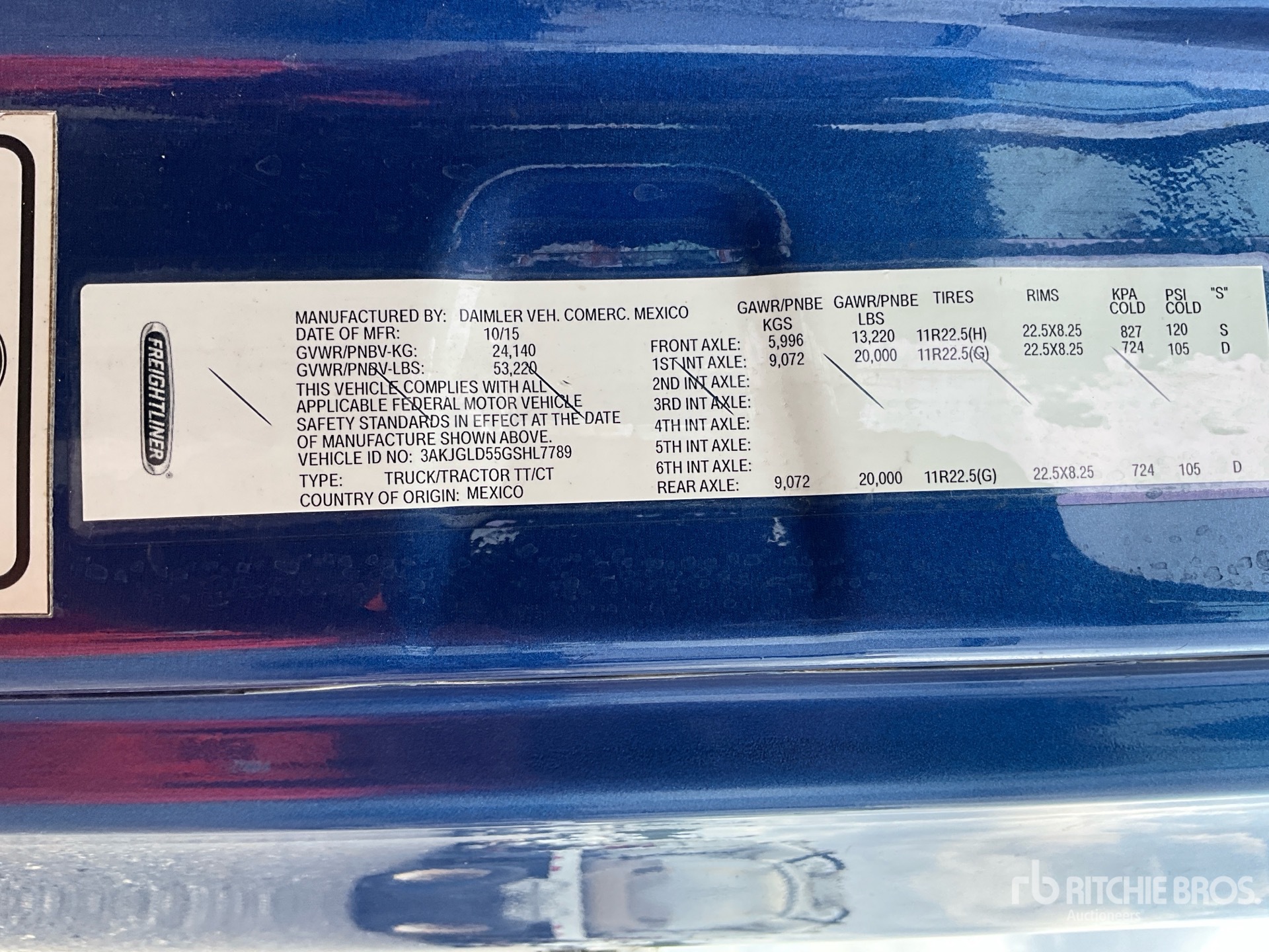 Moteur diesel Detroit DD15 14,8 L 455 ch, nécessite du liquide d'échappement diesel, transmission automatisée Detroit DT12-OA-1750 à 12 vitesses, différentiel autobloquant, essieu avant de 5 987 kg, essieu arrière de 18 144 kg, essieux moteurs Detroit DA-RT-40.0-4, rapport de pont de 3,23:1, PTAC de 24 158 kg, cabine à suspension pneumatique, cabine couchette surélevée de 1,83 m, lits superposés, chauffage de couchette, climatisation de cabine couchette Thermo King, groupe auxiliaire de puissance Thermo King, pneus avant 11R22.5, pneus arrière 11R22.5, suspension pneumatique Airliner, empattement de 5,83 m, sellette d'attelage coulissante pneumatique, double réservoir de carburant