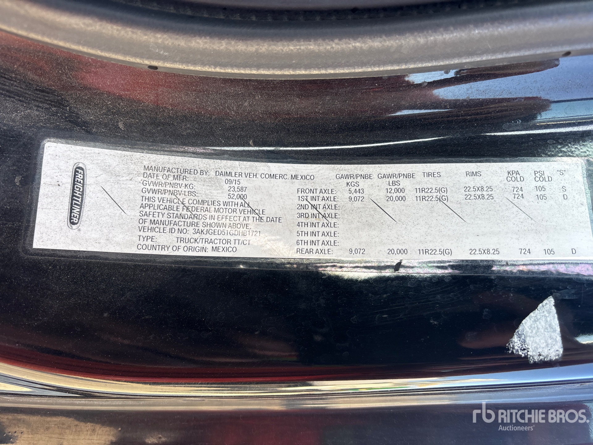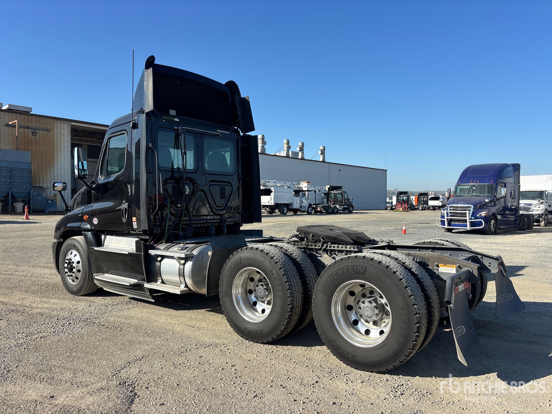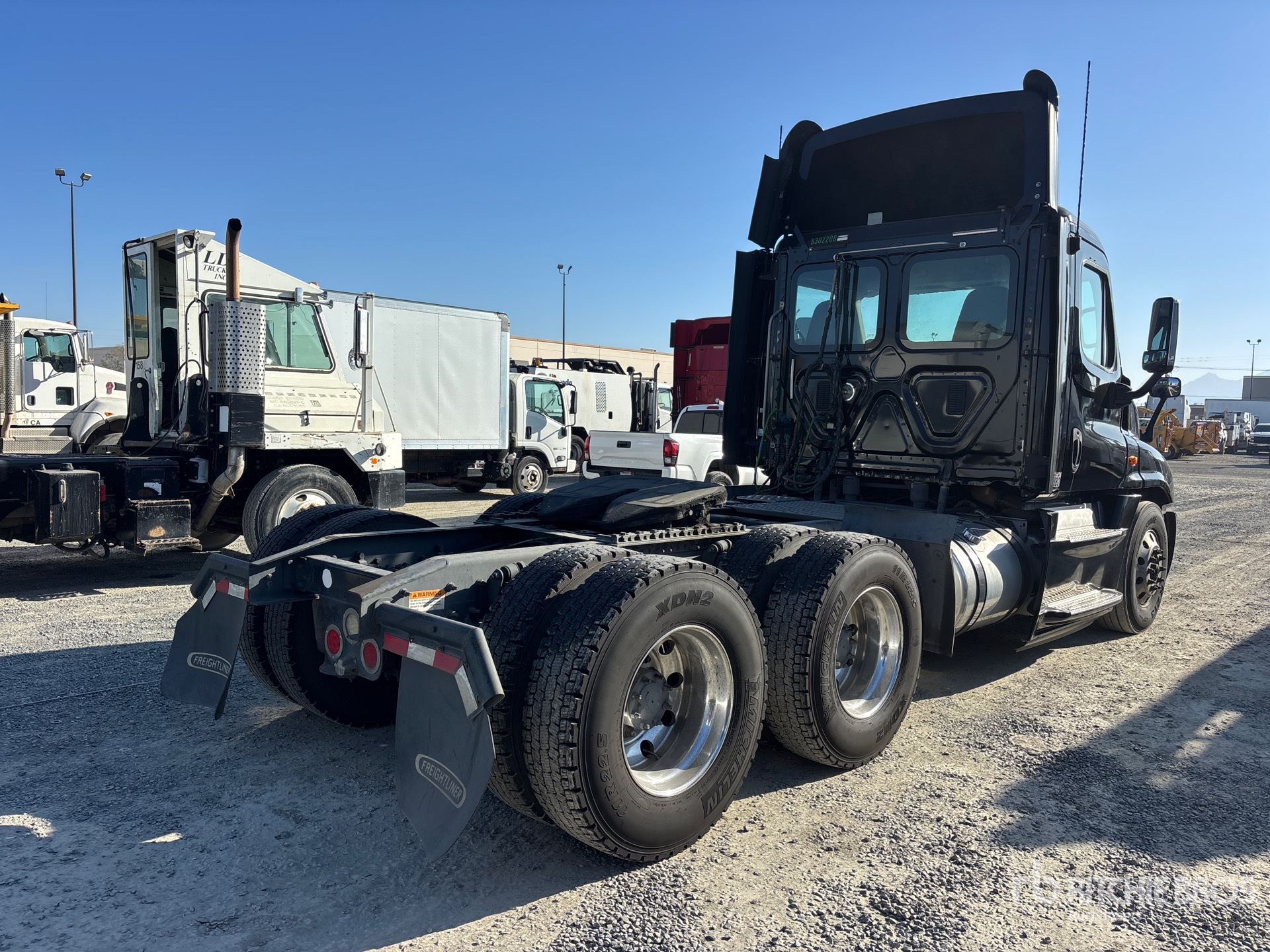 Situé sur la voie 5, emplacement 17, ce camion est équipé d'un moteur Detroit DD15 de 455 ch, homologué EPA 2015, totalisant 16 705 heures de fonctionnement, d'une boîte de vitesses manuelle Eaton Fuller FRO-15210C à 10 rapports, d'un essieu avant de 5 443 kg (12 000 lb), d'essieux arrière de 18 144 kg (40 000 lb), d'un PTAC de 23 591 kg (52 000 lb), d'un frein moteur, d'un différentiel autobloquant, d'un empattement de 4,78 m (188 po), d'une suspension pneumatique, de jantes en aluminium, de pneus avant et arrière 11R22.5, d'une sellette d'attelage coulissante pneumatique et de deux réservoirs de carburant.