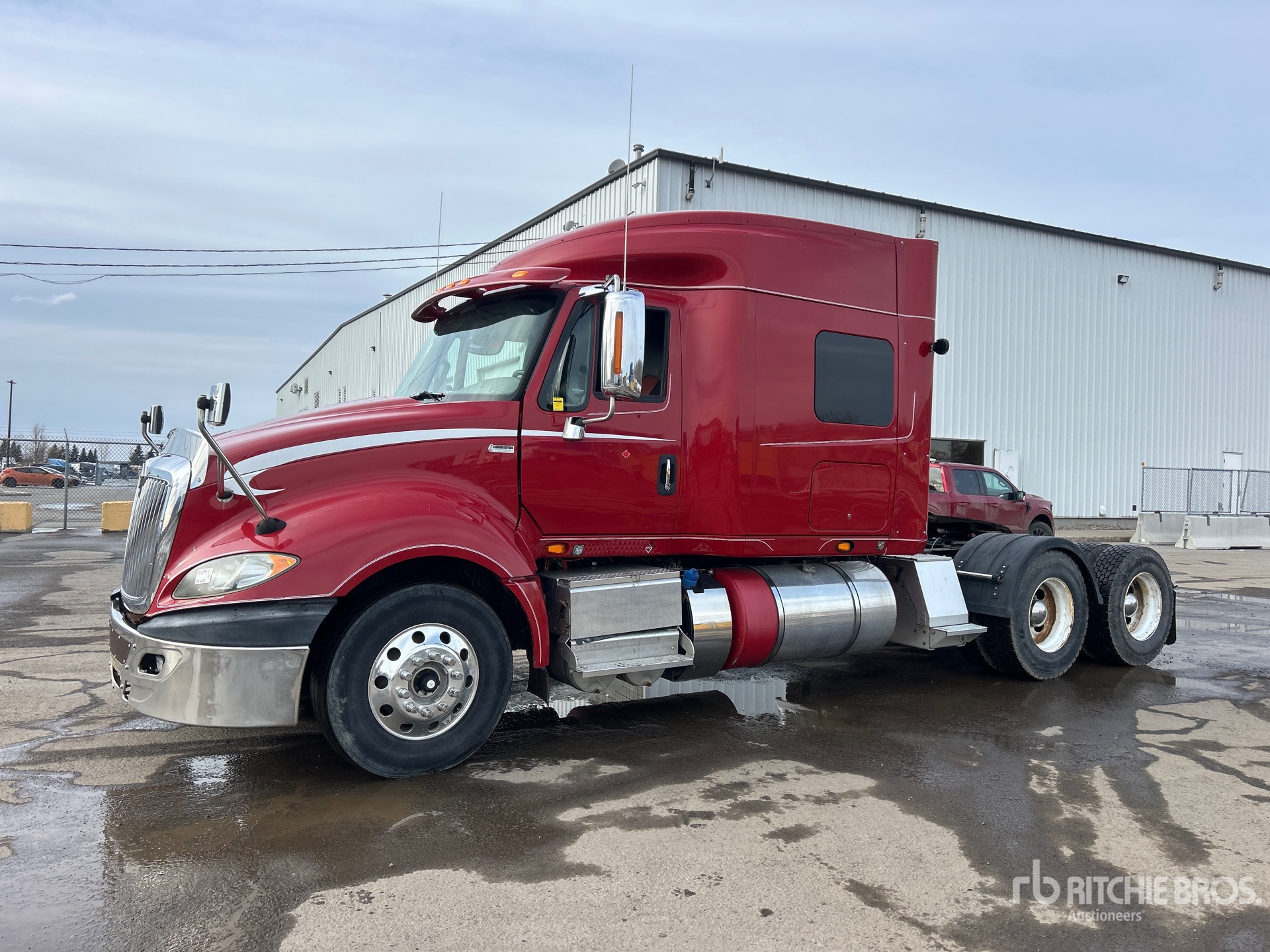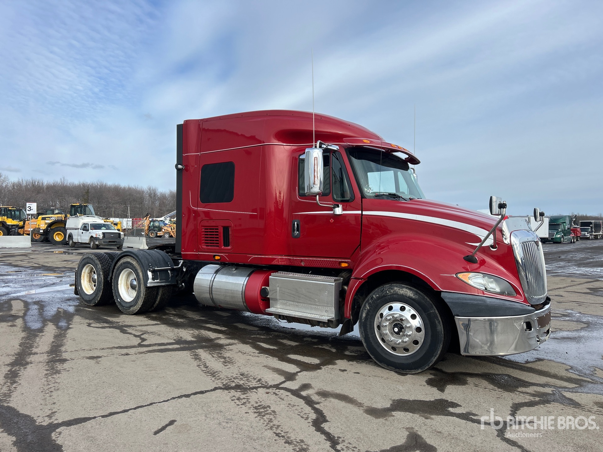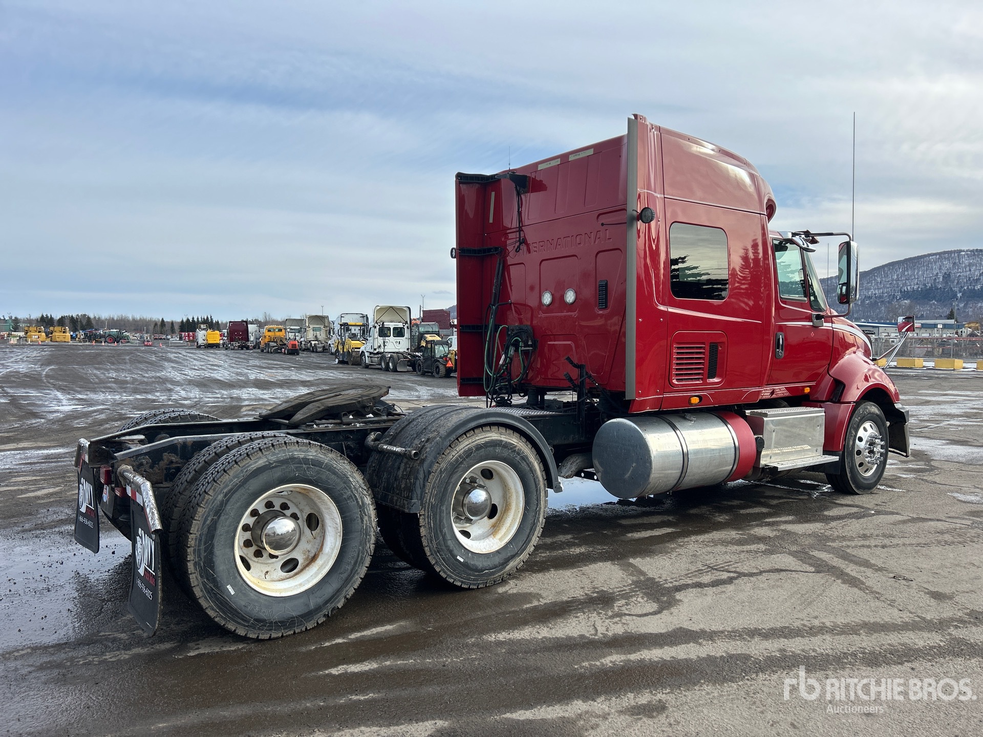 Moteur Navistar N13 de 450 ch, homologué EPA 2014, 14 800 heures moteur, transmission automatique, essieu avant de 13 220 lb, essieux arrière de 40 000 lb, PTAC de 53 220 lb, frein moteur, blocage de différentiel, cabine couchette à toit surélevé de 56 po, empattement de 232 po, suspension pneumatique, roues avant en aluminium, pneus 11R22.5, attelage coulissant pneumatique, double réservoir de carburant