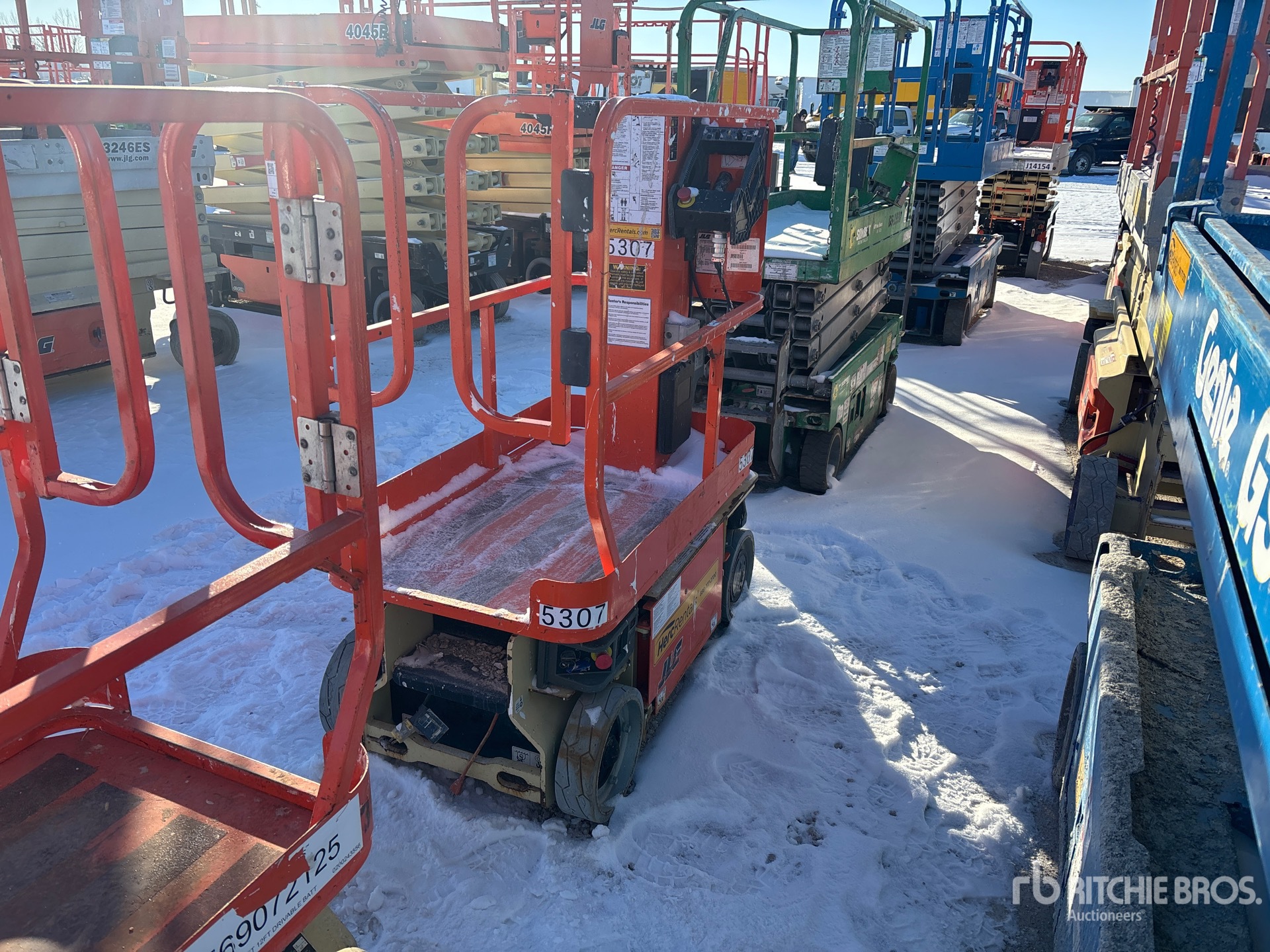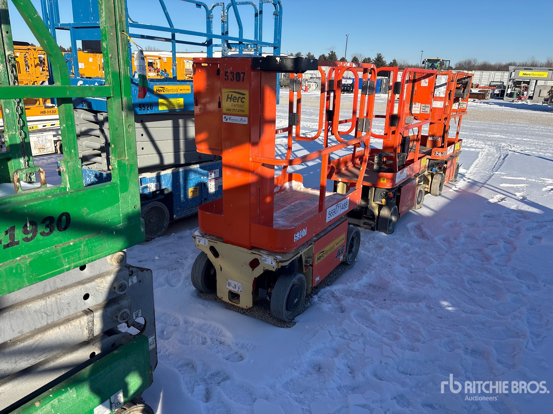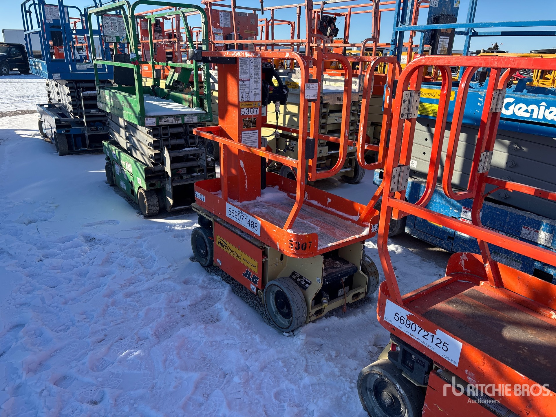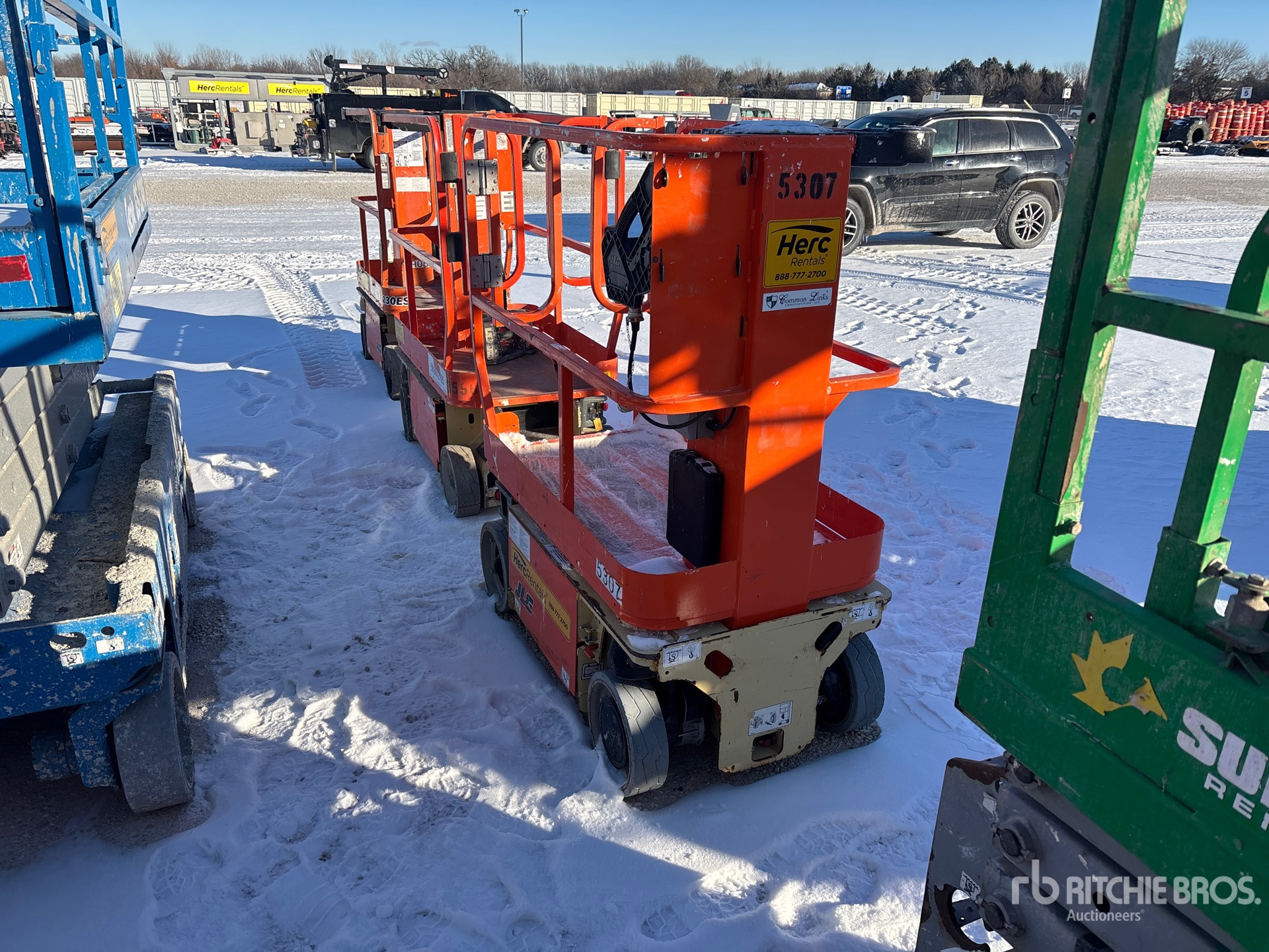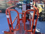 Hauteur maximale de la plateforme : 3,66 m (12 pi), capacité de charge maximale : 227 kg (500 lb), alimentation électrique de la plateforme, convertisseur de courant, pneus pleins non marquants, boîtier de commande supérieur, équipement fourni par Herc Rentals.