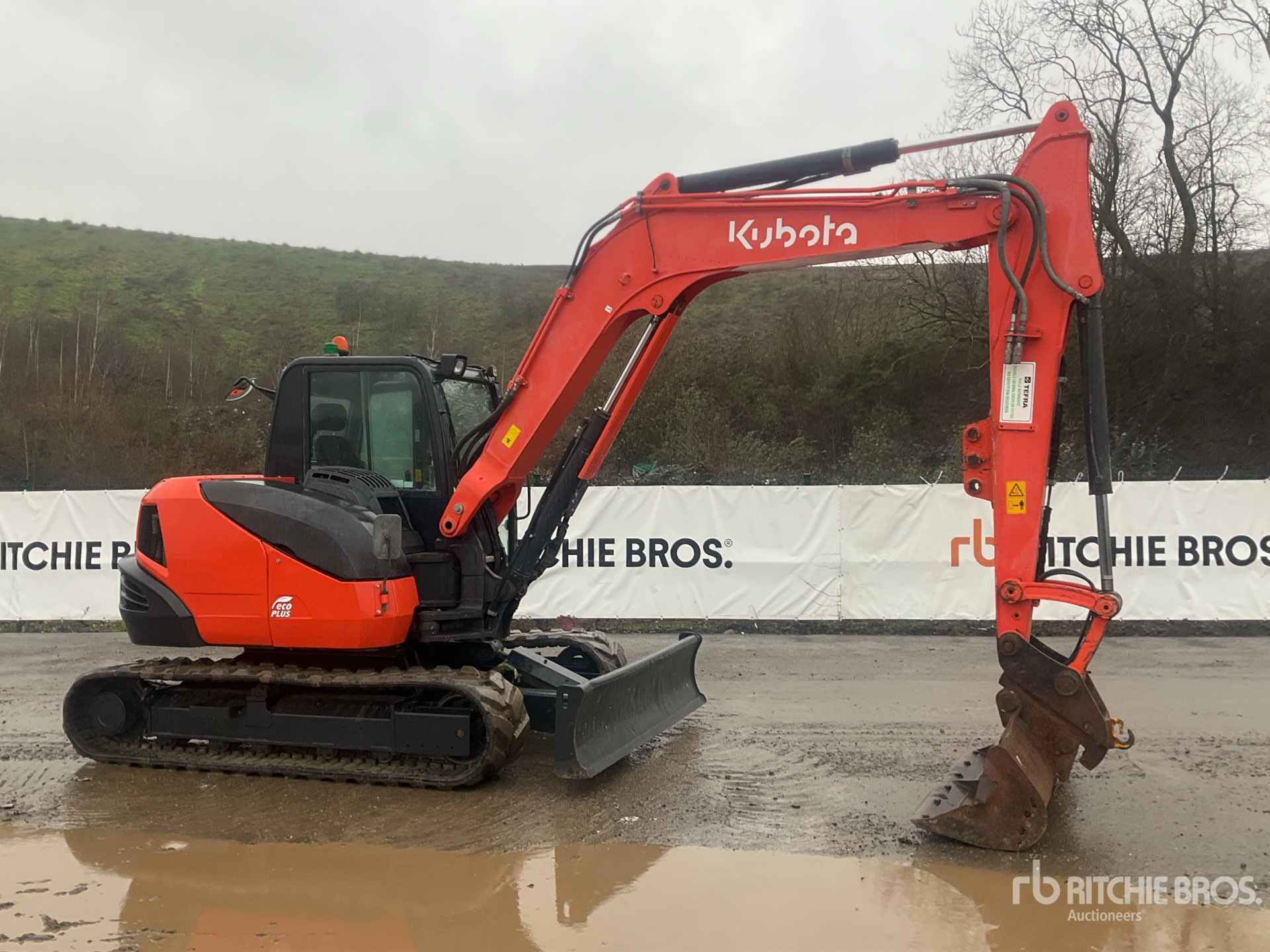 Climatiseur, norme Tier 4, étiquette EPA américaine 2015, flèche pivotante, bras de 2150 mm, circuit hydraulique auxiliaire, clapet antiretour sur le bras, clapets anti-retour sur la flèche, lame de remblayage, chenilles en caoutchouc de 440 mm, attache rapide hydraulique, godet de nettoyage de 1500 mm