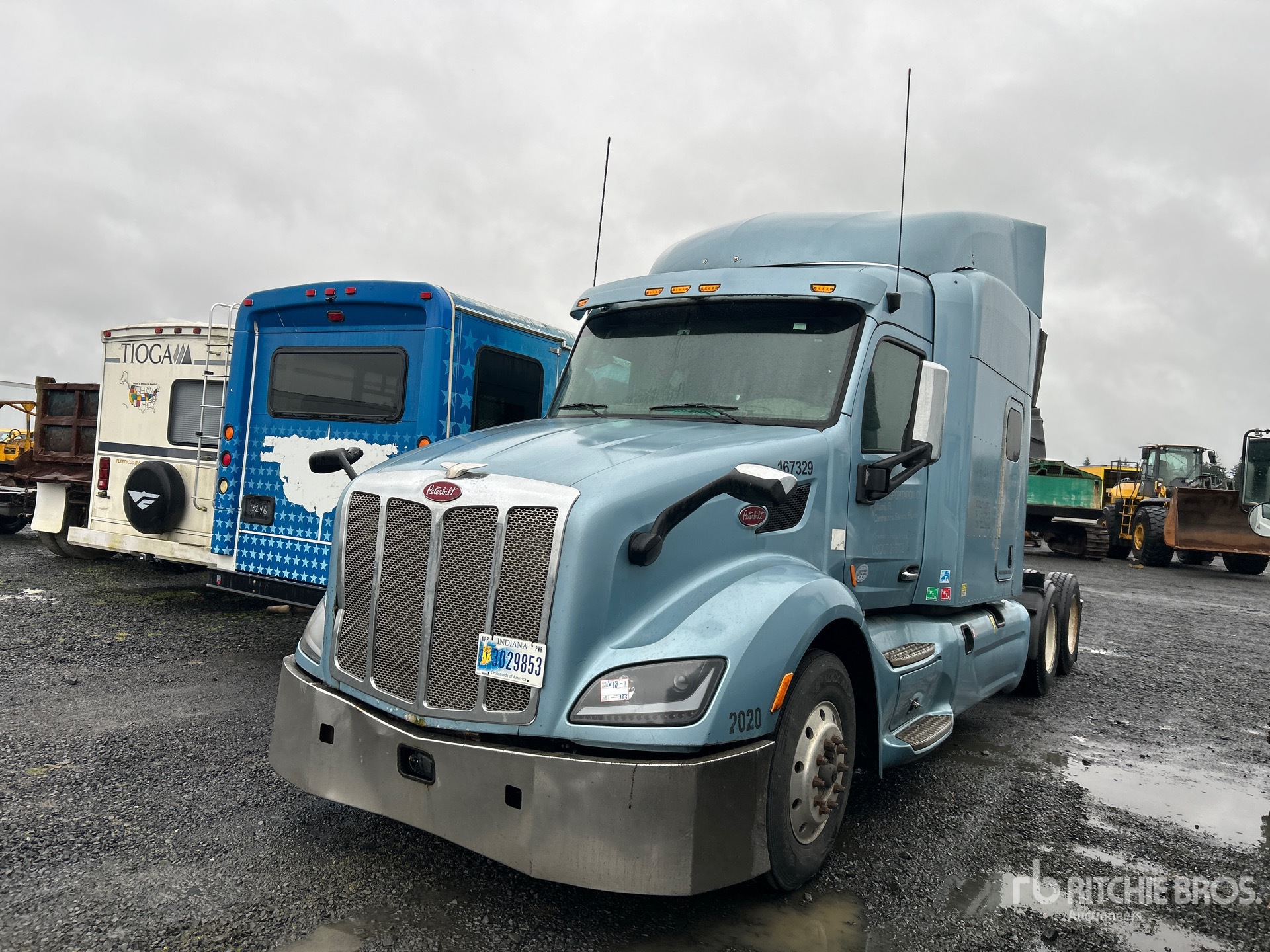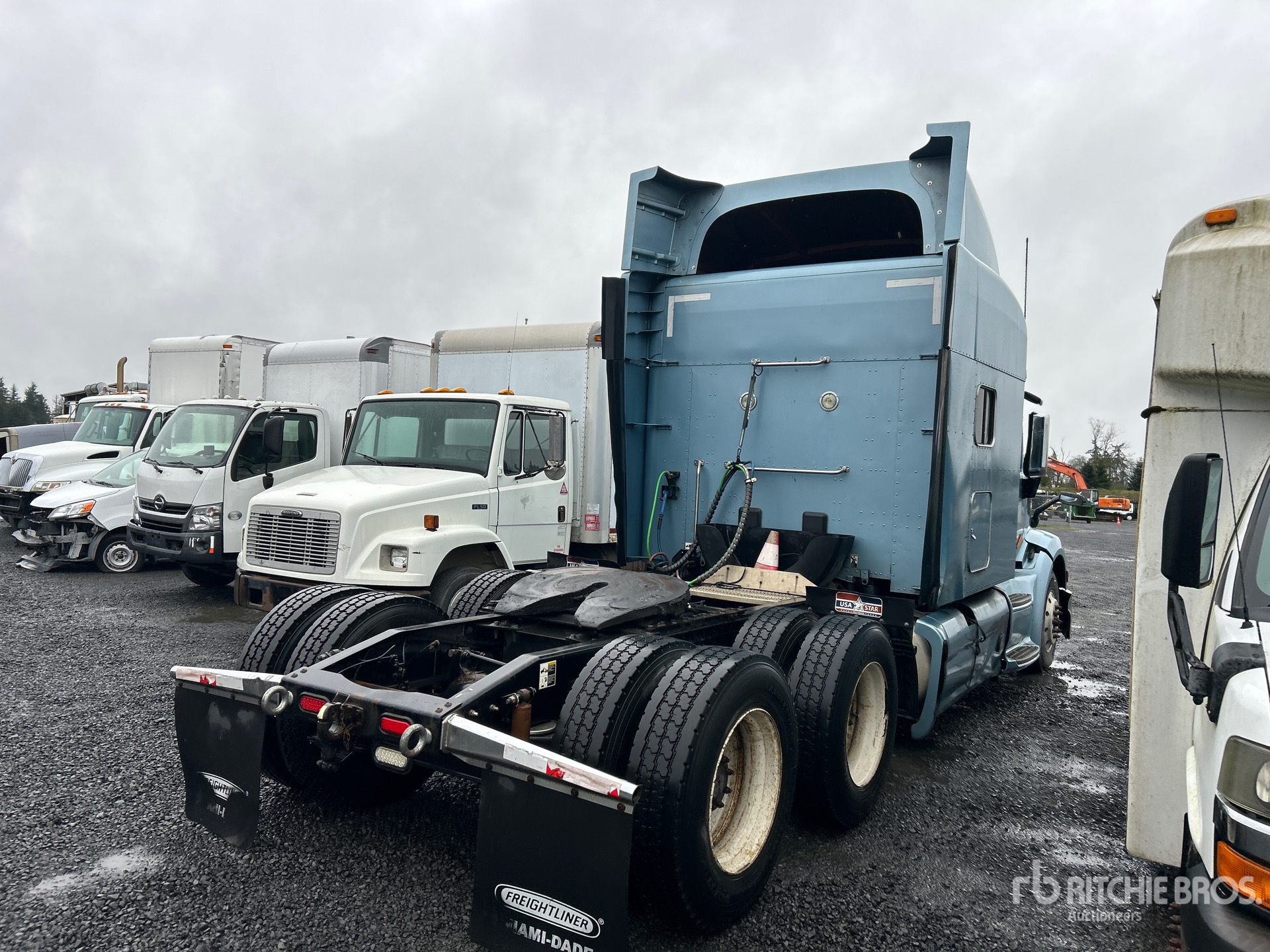 Moteur Cummins ISX15 de 450 ch, homologué EPA 2015, transmission automatique, essieu avant de 5 443 kg, essieux arrière de 17 237 kg, PTAC de 22 688 kg, frein moteur, cabine couchette surélevée de 198 cm, lits superposés, empattement de 604 cm, suspension pneumatique, pneus 295/75R22.5, sellette attelage coulissant pneumatique, deux réservoirs de carburant.