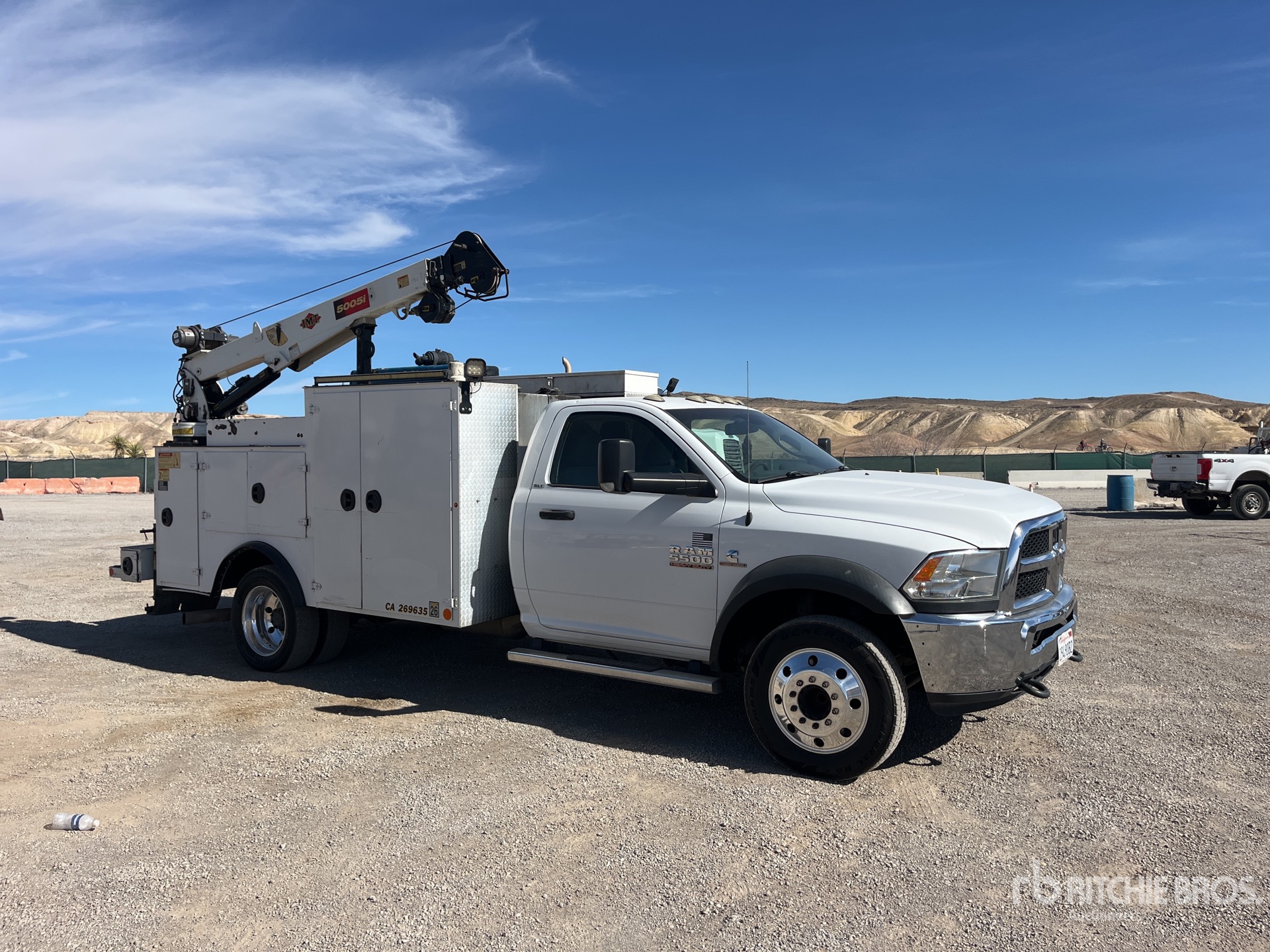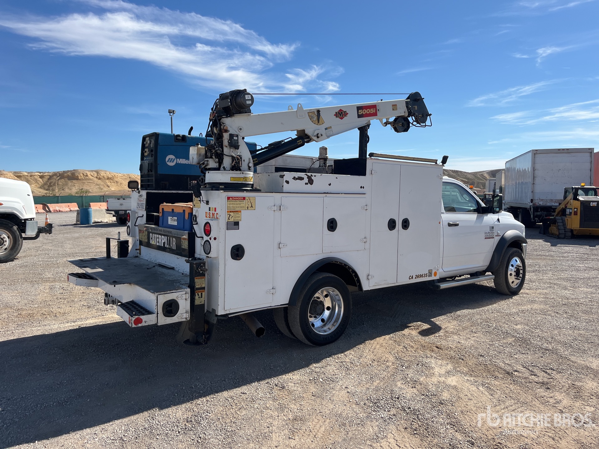 Moteur diesel Cummins 6 cylindres 6,7 L, homologué EPA 2016, nécessite un additif pour réservoirs de diesel, transmission automatique, essieu avant 3175 kg, essieux arrière 6125 kg, PTAC 8845 kg, jantes en aluminium, pneus 225/70R19.5, suspension à ressorts, empattement 427 cm, prise de force, benne IMT DOM183 3,35 m (2010), stabilisateurs manuels, grue électrique IMT 5005i 2 sections 2268 kg, télécommande filaire, enrouleur de tuyau d'air, poste à souder à essence Miller Trailblazer 302 A