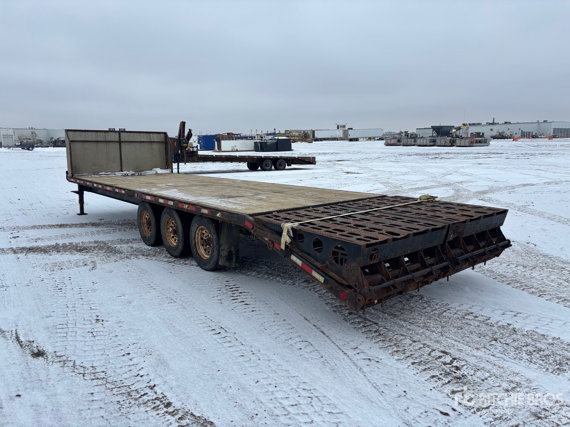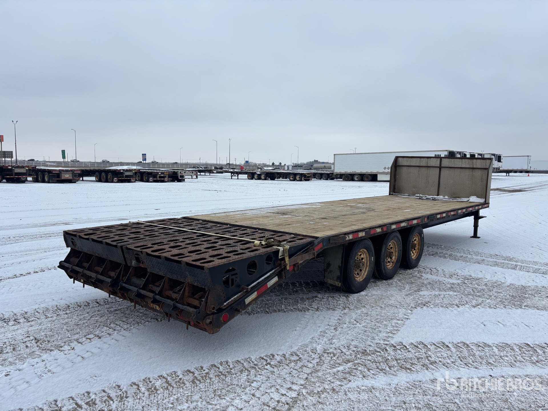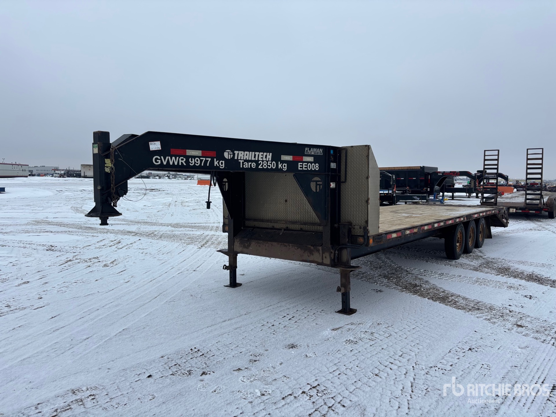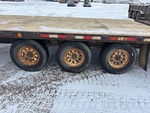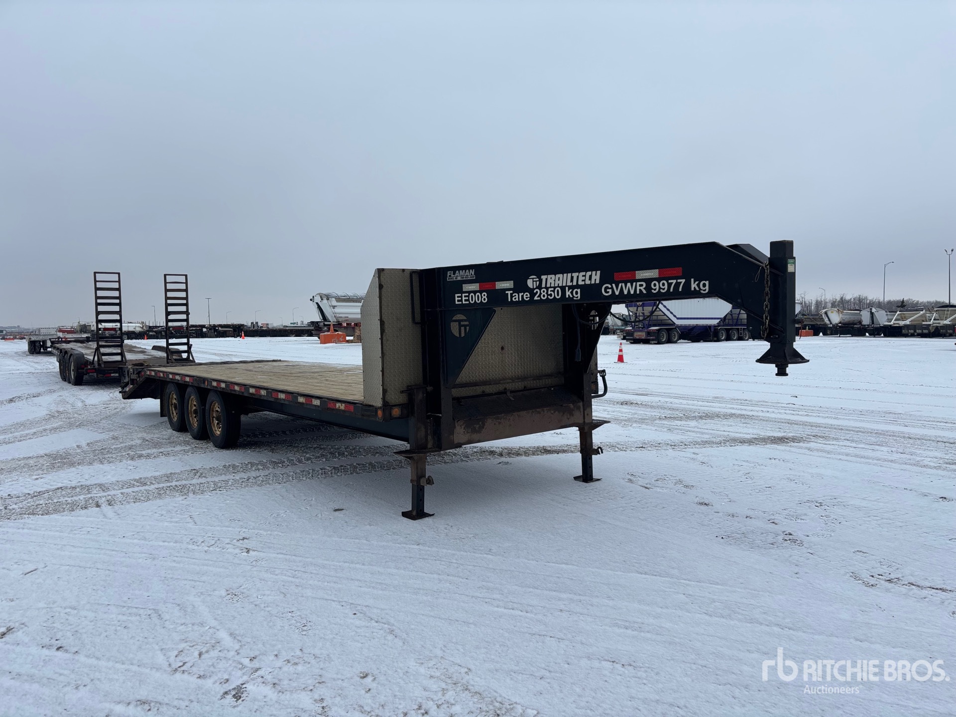 Suspension à ressorts, freins électriques, plateau principal de 7,3 m, hayon arrière fixe de 1,5 m, largeur totale du plateau de 2,6 m, plateau au-dessus des pneus, rampes assistées par ressorts, plancher en bois, pneus 235/80R16, PTAC de 9 995 kg