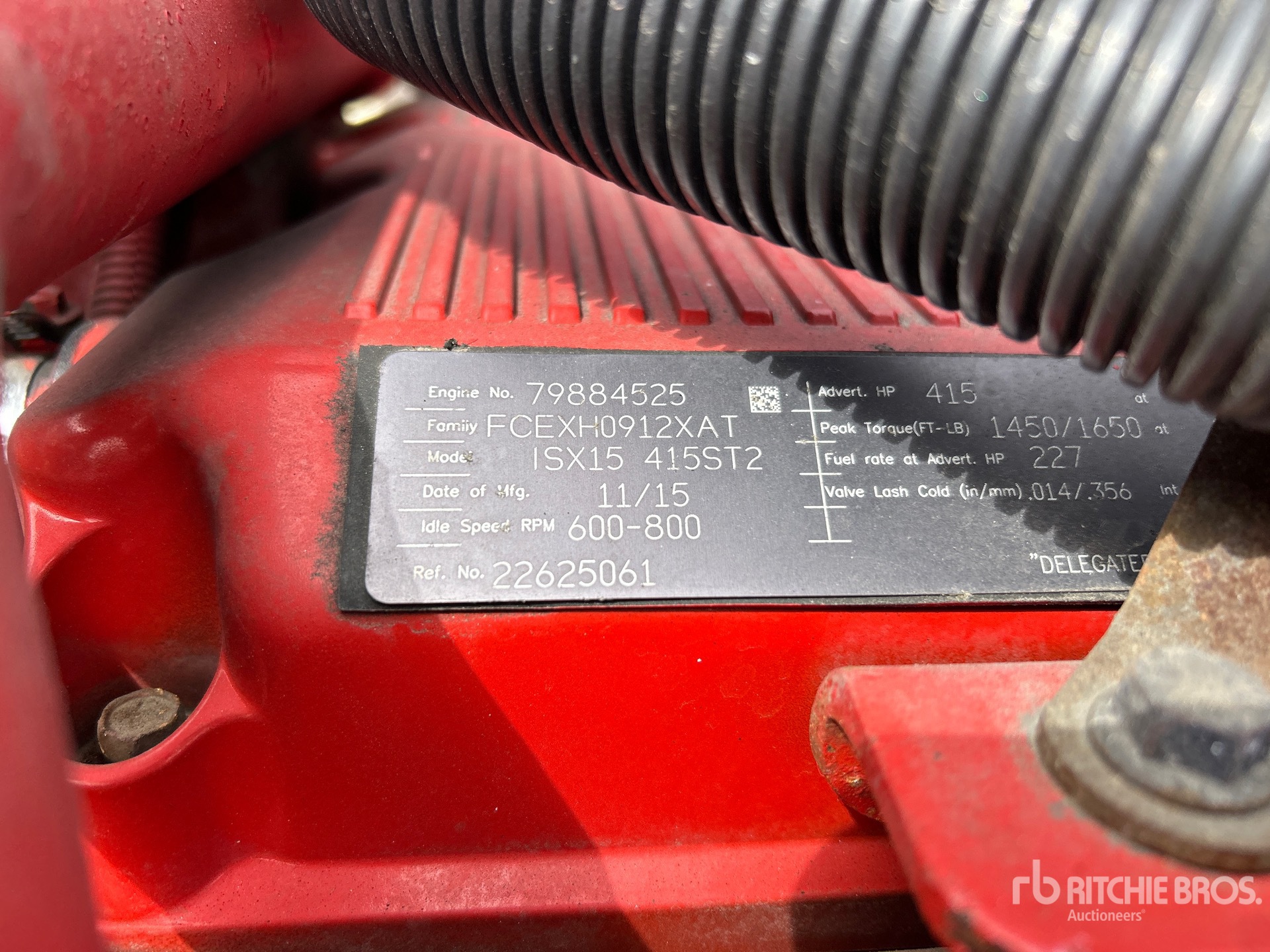 Moteur Cummins ISX15 de 415 ch, homologué EPA 2015, 32 526 heures de fonctionnement, transmission automatisée, essieu avant de 5 443 kg, essieu arrière de 10 280 kg, PTAC de 15 770 kg, empattement de 396 cm, suspension pneumatique, pneus 275/80R22.5, sellette d'attelage coulissante pneumatique