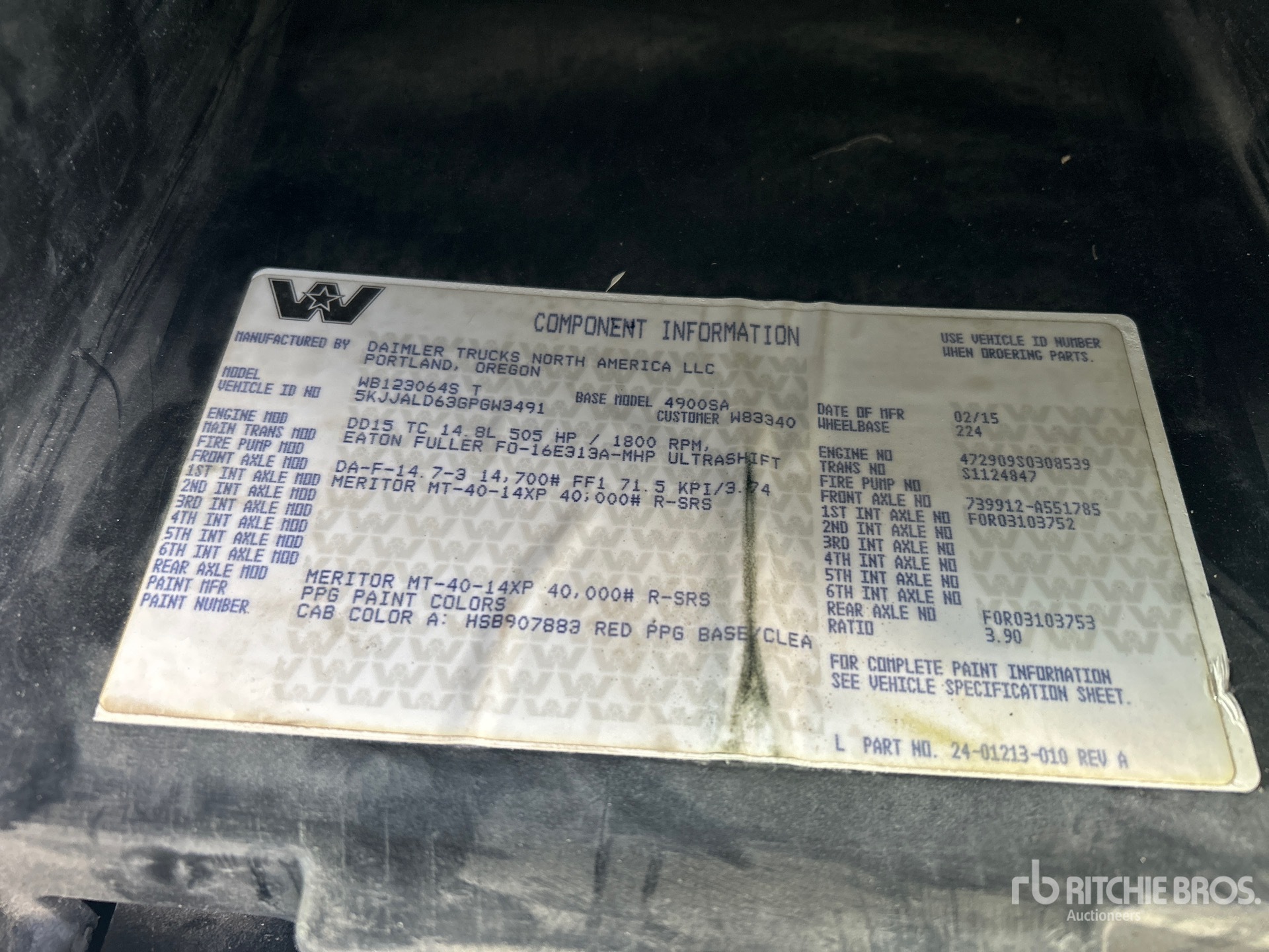Moteur Detroit DD15 de 505 ch, transmission automatisée Eaton Fuller FO-16E313A-MHP Ultrashift à 13 rapports, empattement de 224 pouces, suspension pneumatique, jantes en aluminium, pneus 11R22.5, sellette d'attelage coulissante pneumatique, double réservoir de carburant