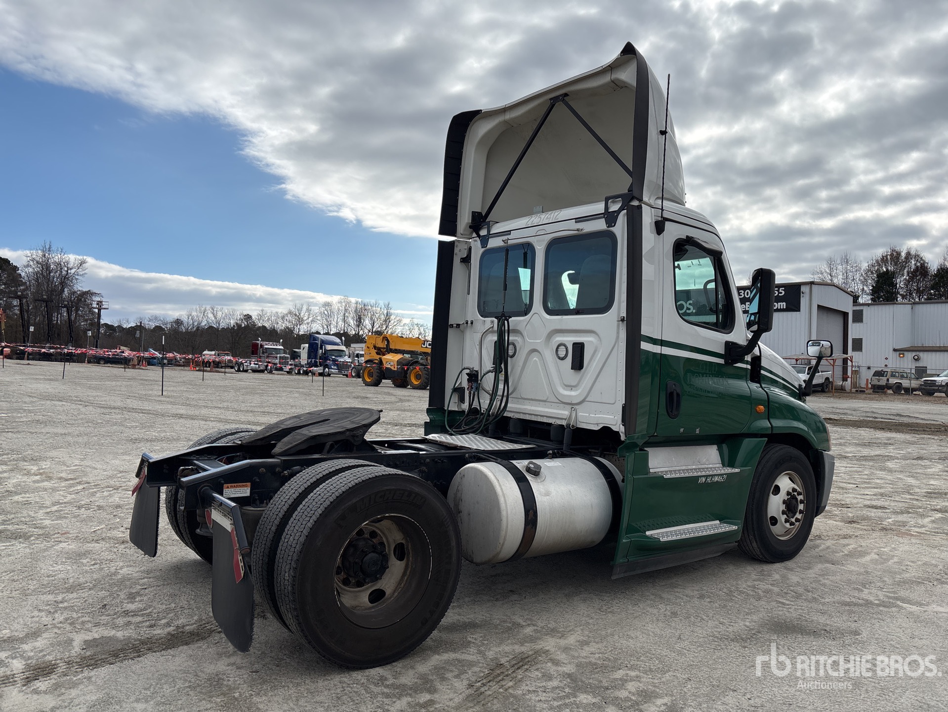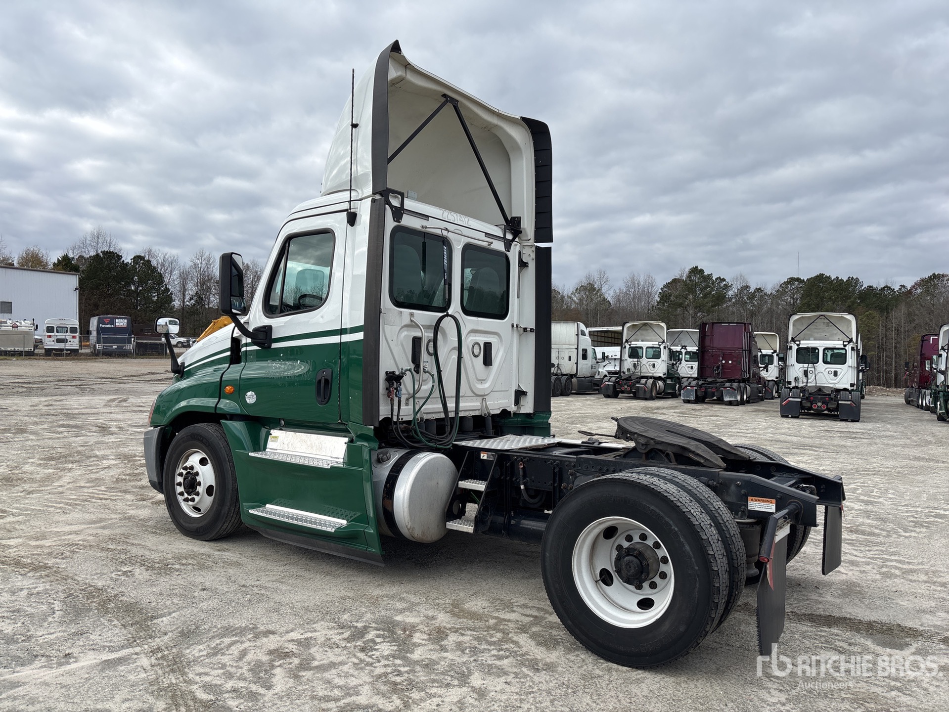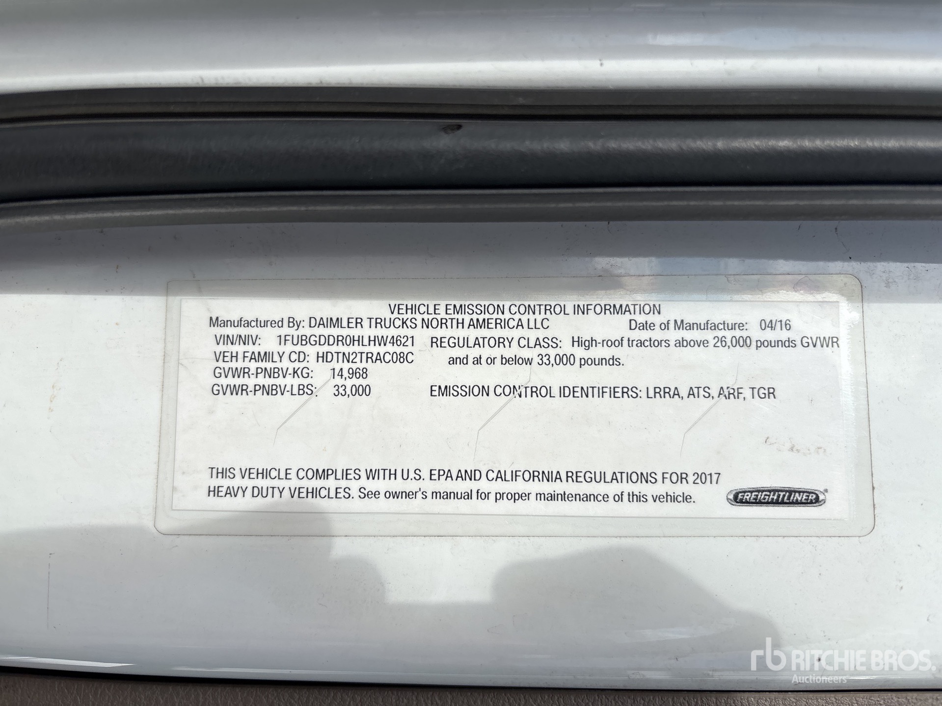 Moteur Detroit DD15 de 455 ch, homologué EPA 2016, 18 095 heures de fonctionnement, boîte de vitesses manuelle Eaton Fuller FRO-15210C à 10 rapports, essieu avant de 5 443 kg, essieu arrière de 9 525 kg, PTAC de 14 997 kg, frein moteur, empattement de 4 011 mm, suspension pneumatique, pneus 11R22.5, double réservoir de carburant.