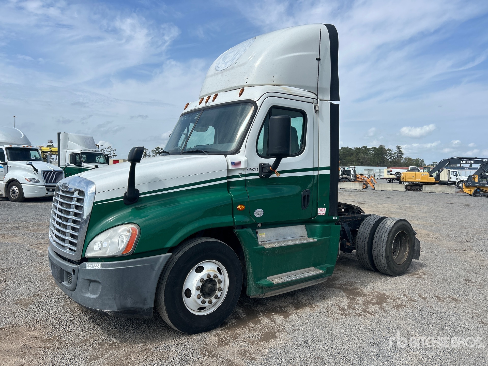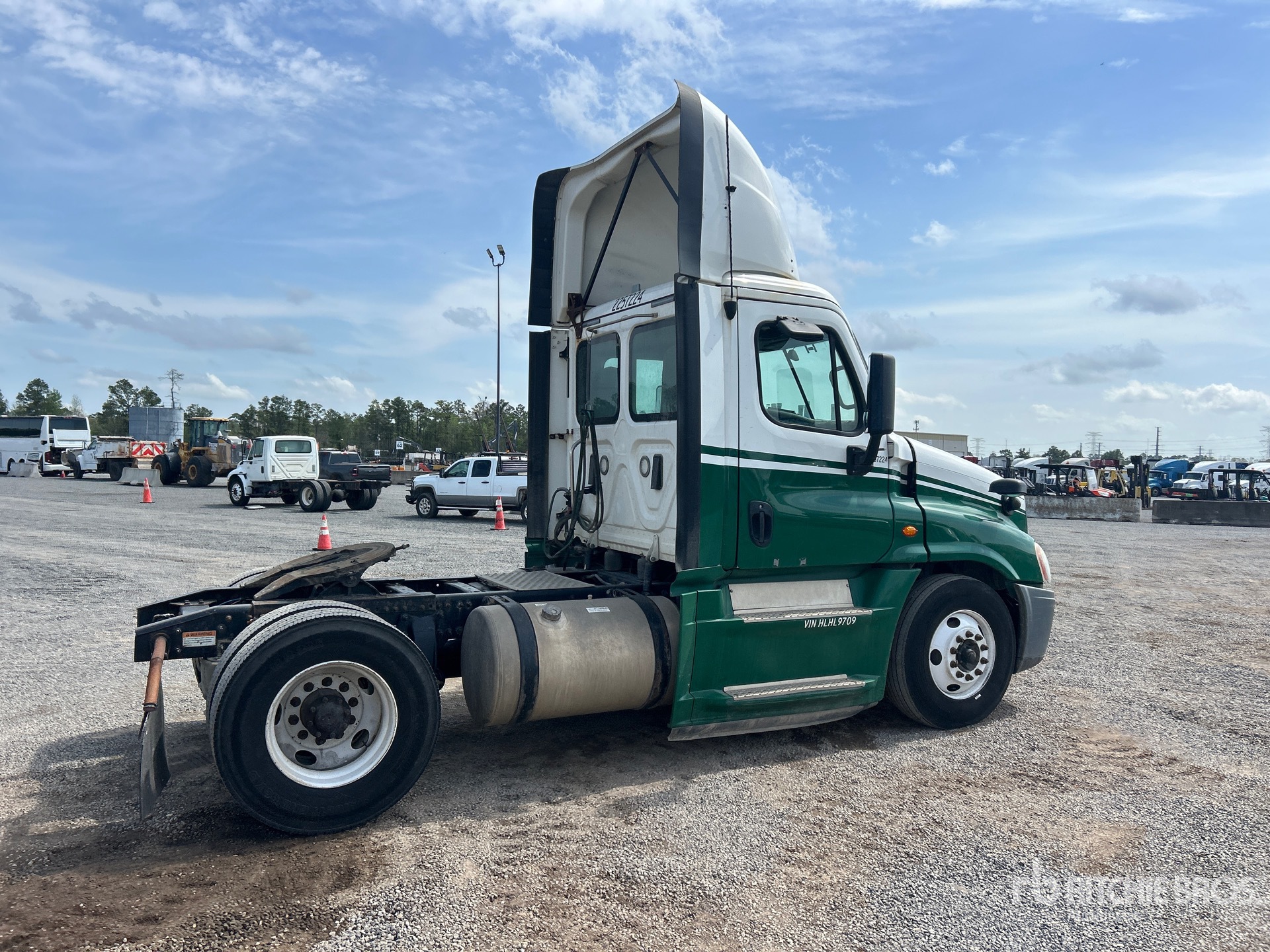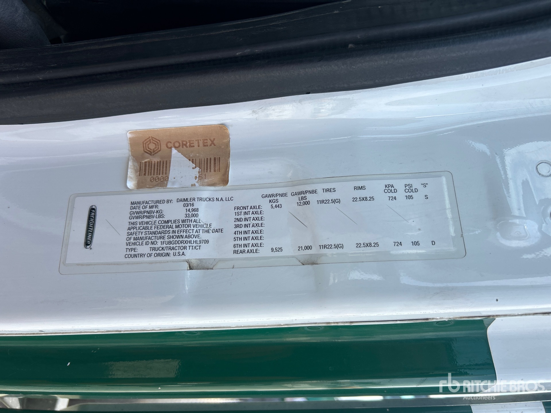 Situé sur la voie 32, emplacement 8, moteur Detroit, transmission manuelle Eaton Fuller FR-14210B à 10 vitesses, essieu avant de 12 000 lb, essieu arrière de 21 000 lb, PTAC de 33 000 lb, empattement de 158 pouces, suspension pneumatique, roues en aluminium, pneus 11R22.5, double réservoir de carburant