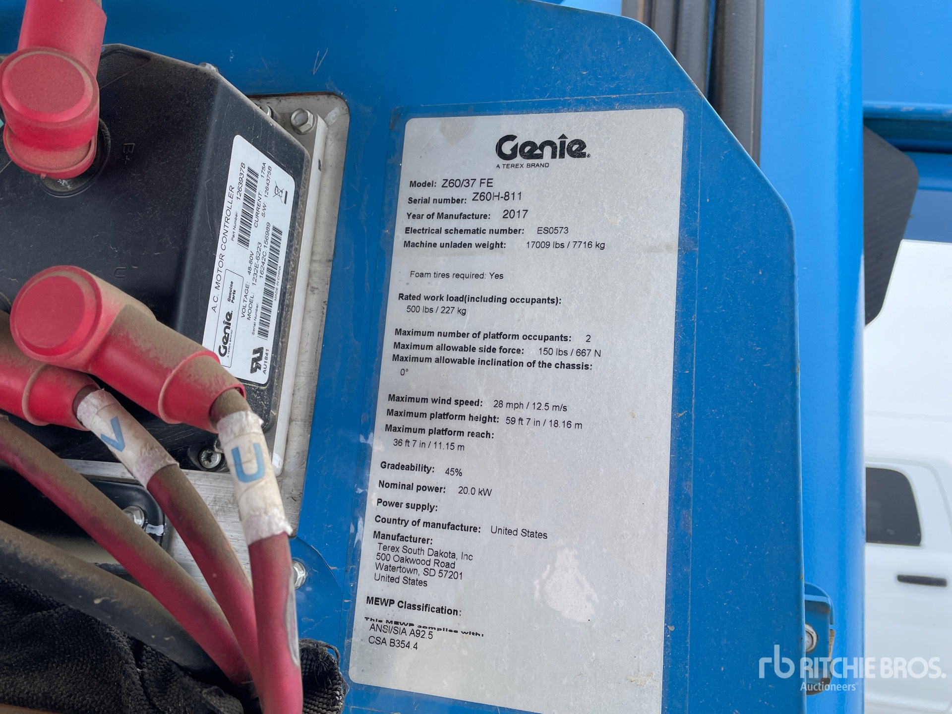 Hauteur de plateforme maximale de 18,16 m (59 pi 7 po), capacité de charge maximale de 227 kg (500 lb), flèche, alimentation électrique de la plateforme, homologation EPA américaine 2016, conforme aux normes CARB, moteur diesel Kubota à 4 cylindres, pneus 355/55D625