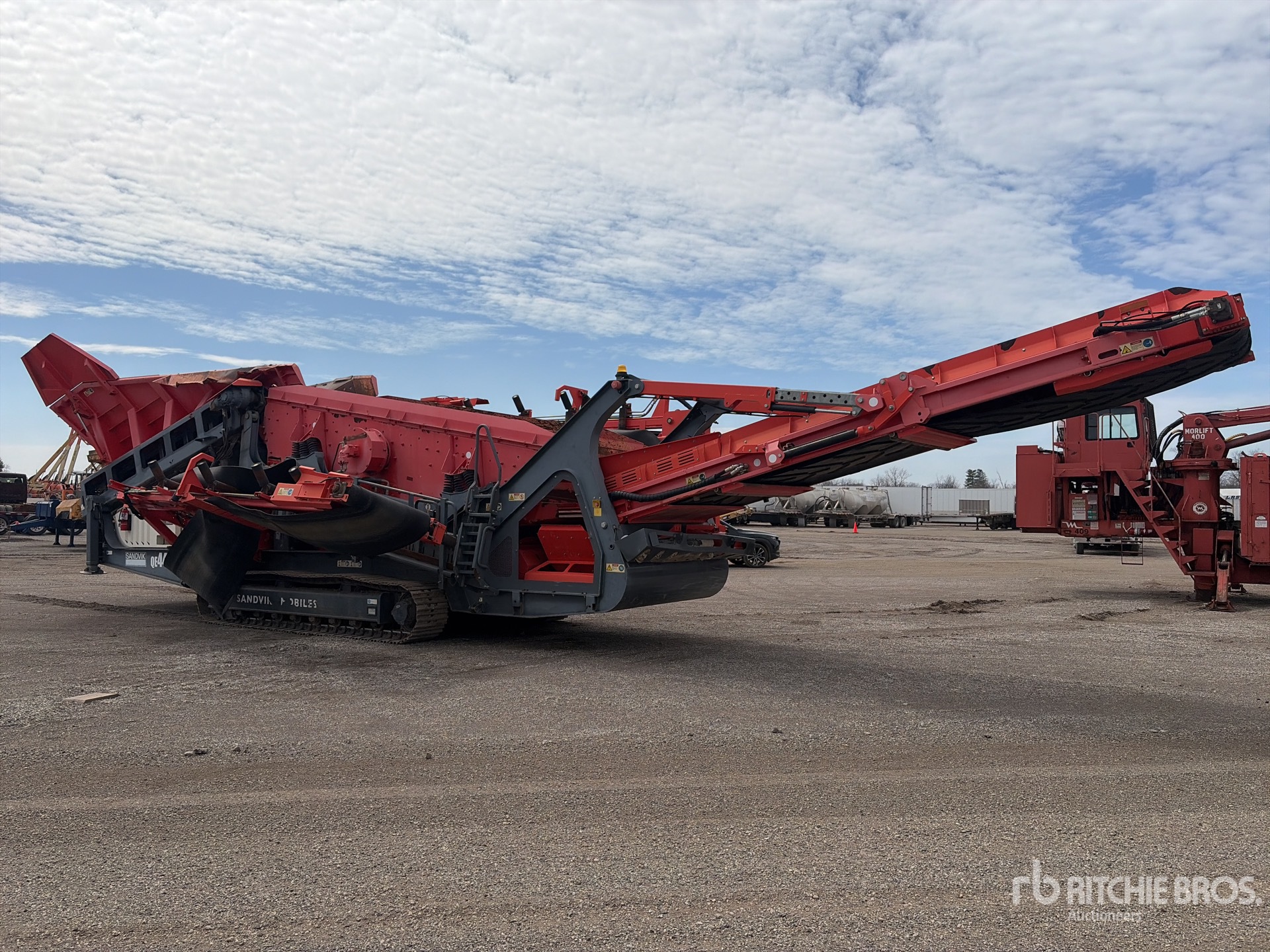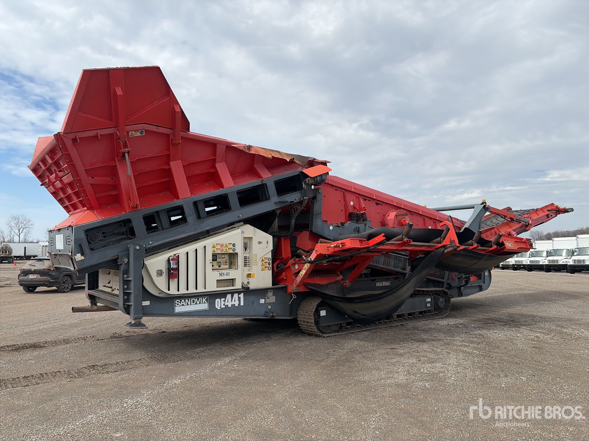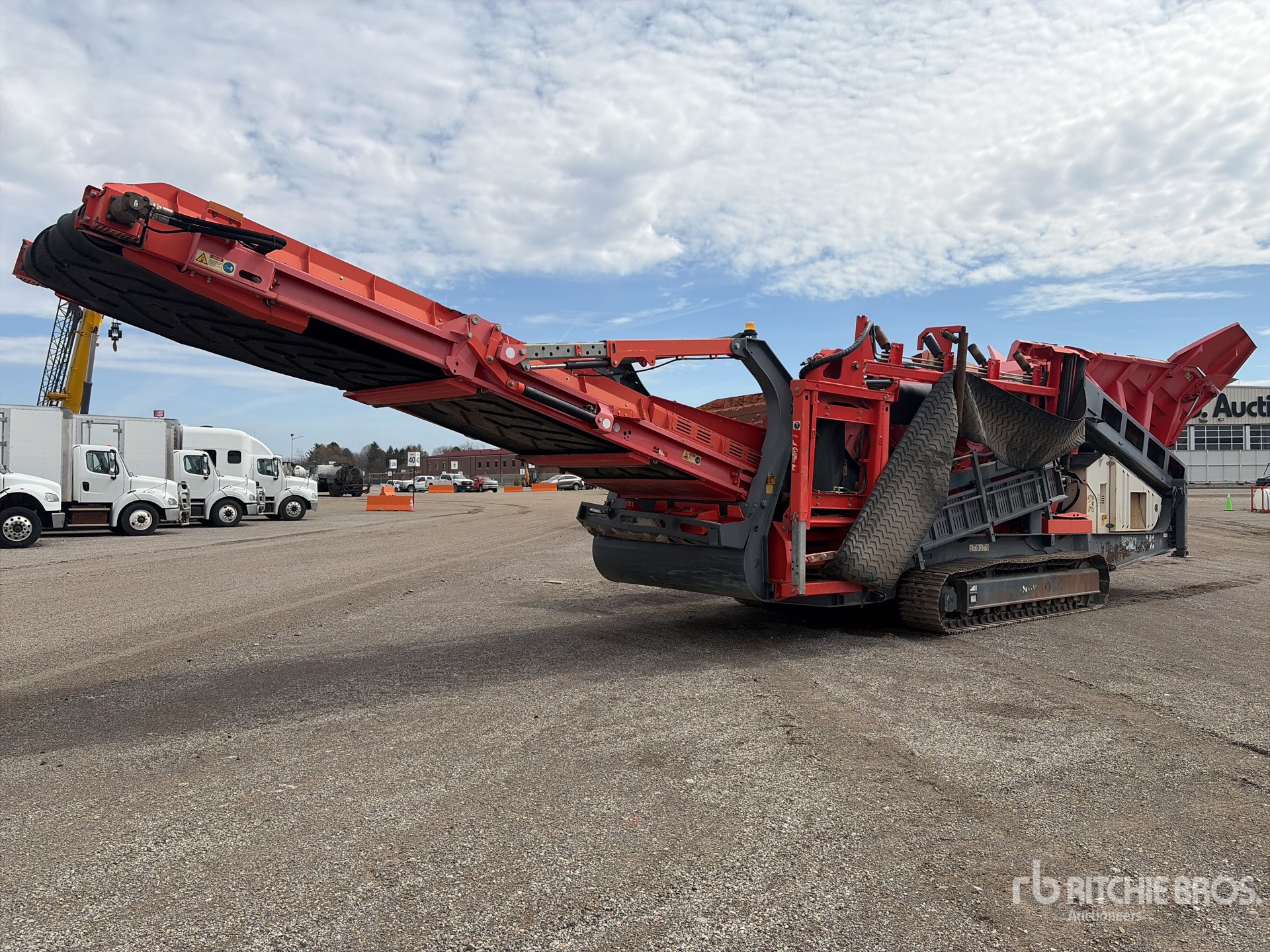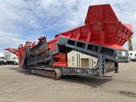 Alimentateur à bande de 0 pi x 0 pi avec ailes de trémie repliables hydrauliquement, crible à double étage, convoyeur d'alimentation de 54 po de large, convoyeur d'évacuation des fines de 38 po de large, convoyeur sous tamis de 46 po de large, convoyeur d'évacuation gauche de 33 po de large, convoyeur d'évacuation d'extrémité de 62 po de large, télécommande radio, étiquette EPA américaine 2016, moteur diesel Cat C4.4 à 4 cylindres de 4,4 L, chenilles à triple crampon de 19,75 po
