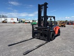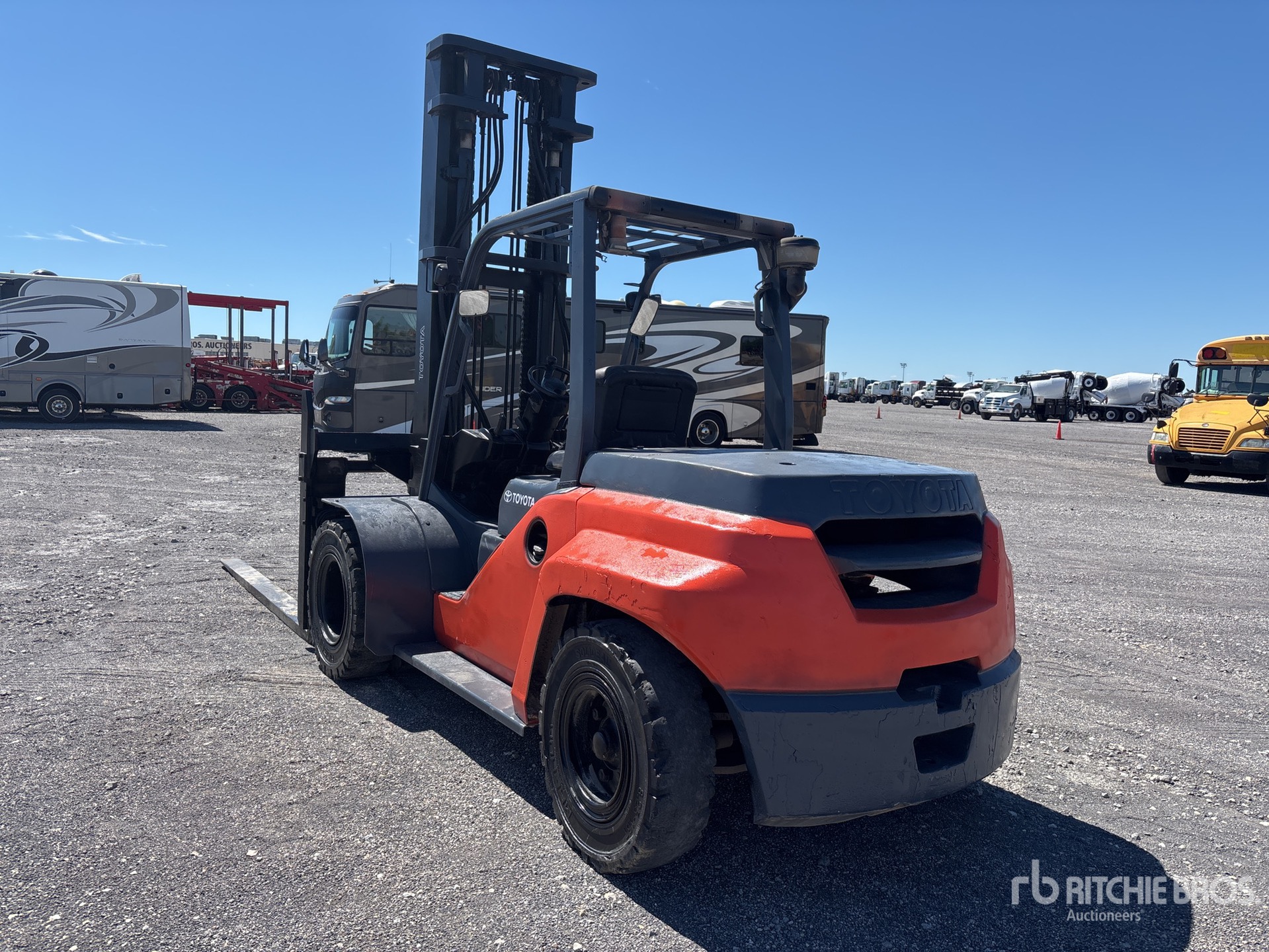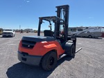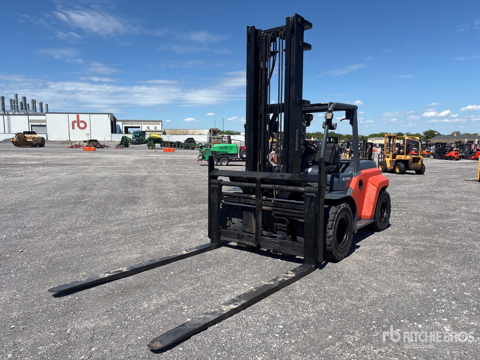 Mât à deux étages, hauteur de levage maximale de 456 cm, hauteur de mât abaissée de 328 cm, fourches de 244 cm, déport latéral, positionneur de fourches, pneus pleins, homologation EPA américaine 2017, moteur diesel Toyota 4 cylindres 2,9 L