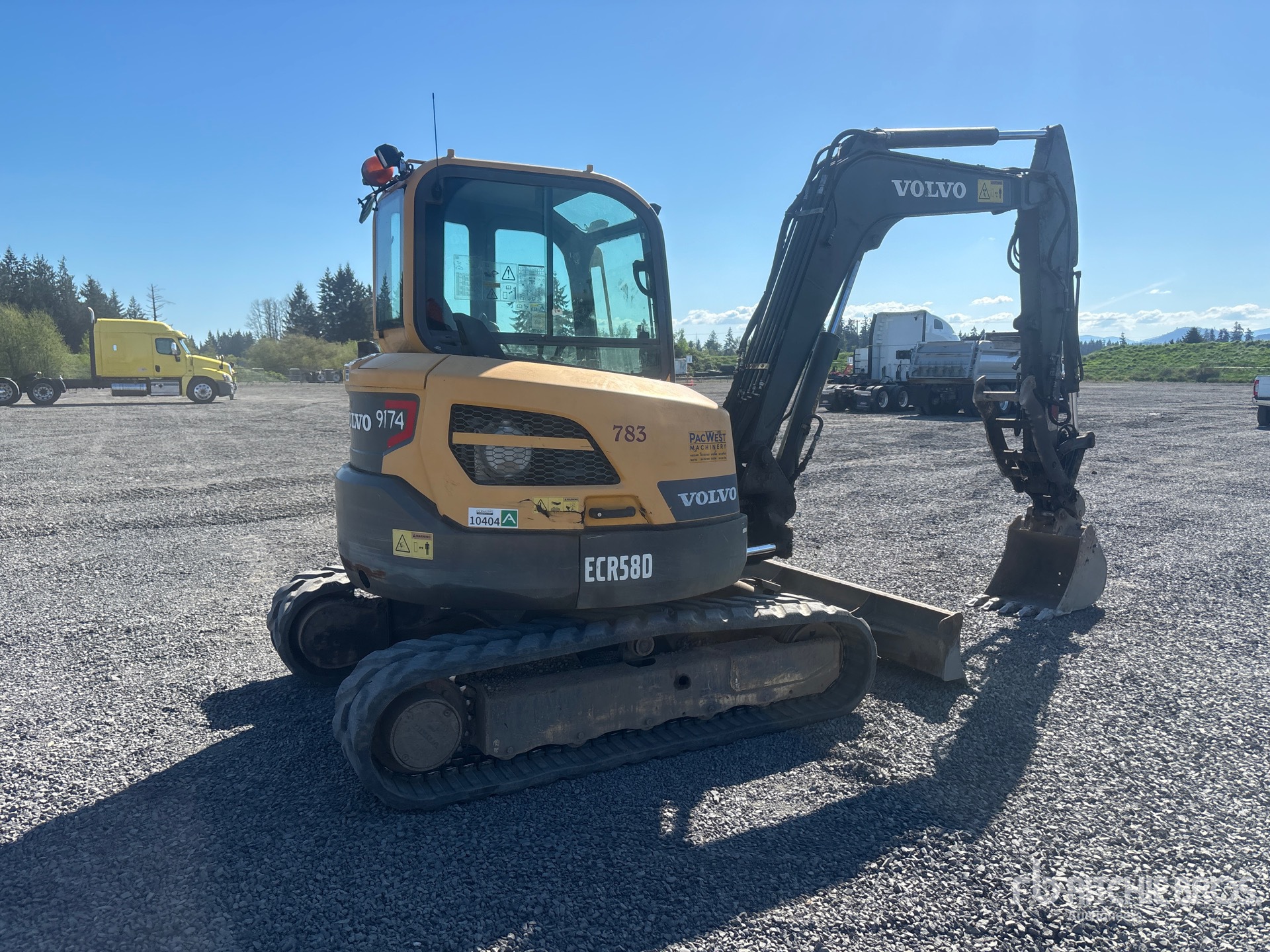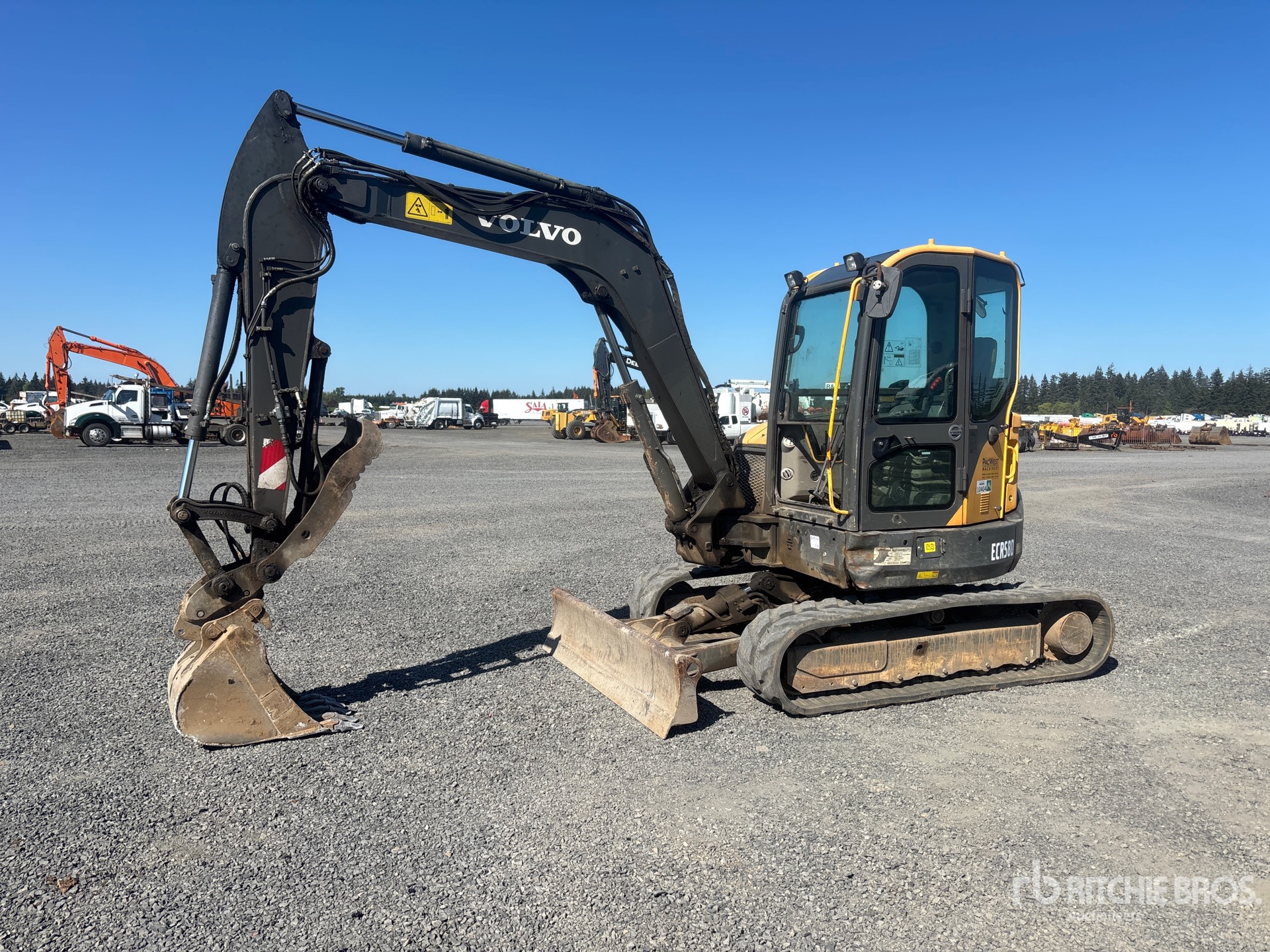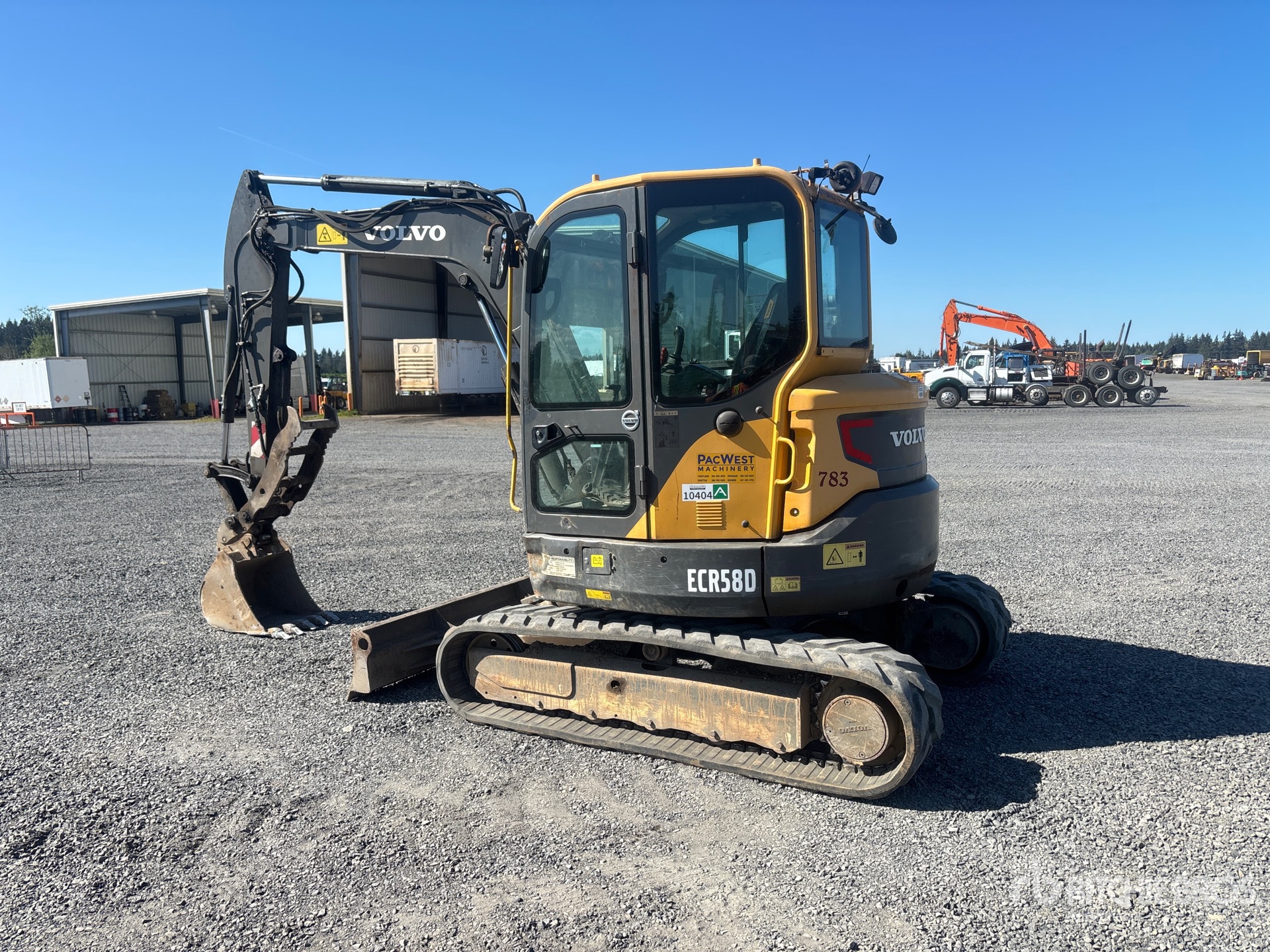 Climatiseur, conforme à la norme Tier 4 (homologation EPA américaine 2017), flèche pivotante, bras de 1,98 m, lame de remblayage, chenilles en caoutchouc de 40,6 cm, attache rapide hydraulique, godet de terrassement de 55,9 cm, pince hydraulique