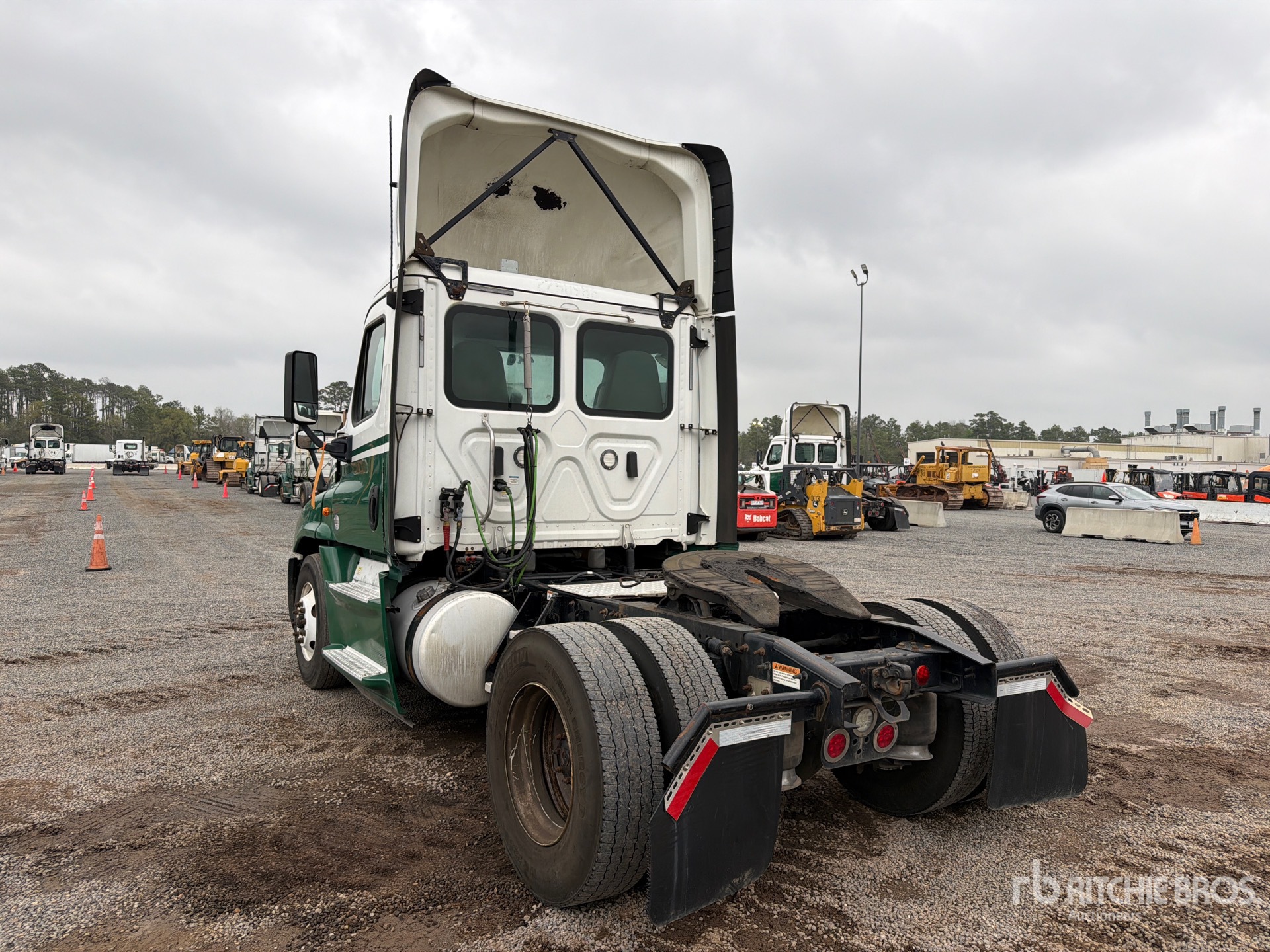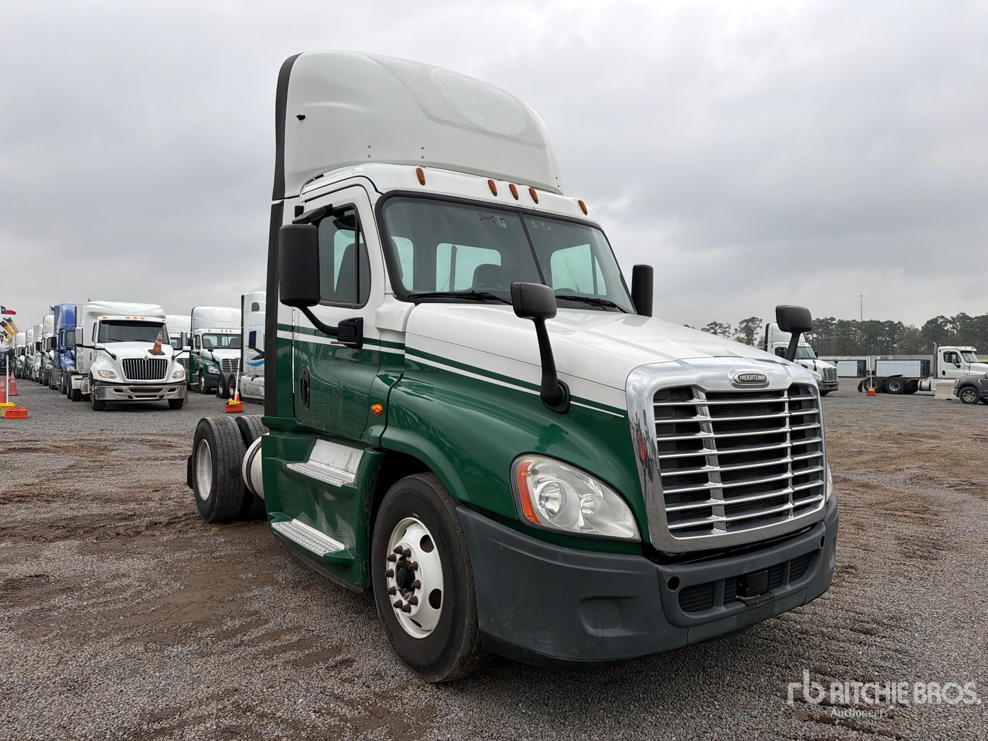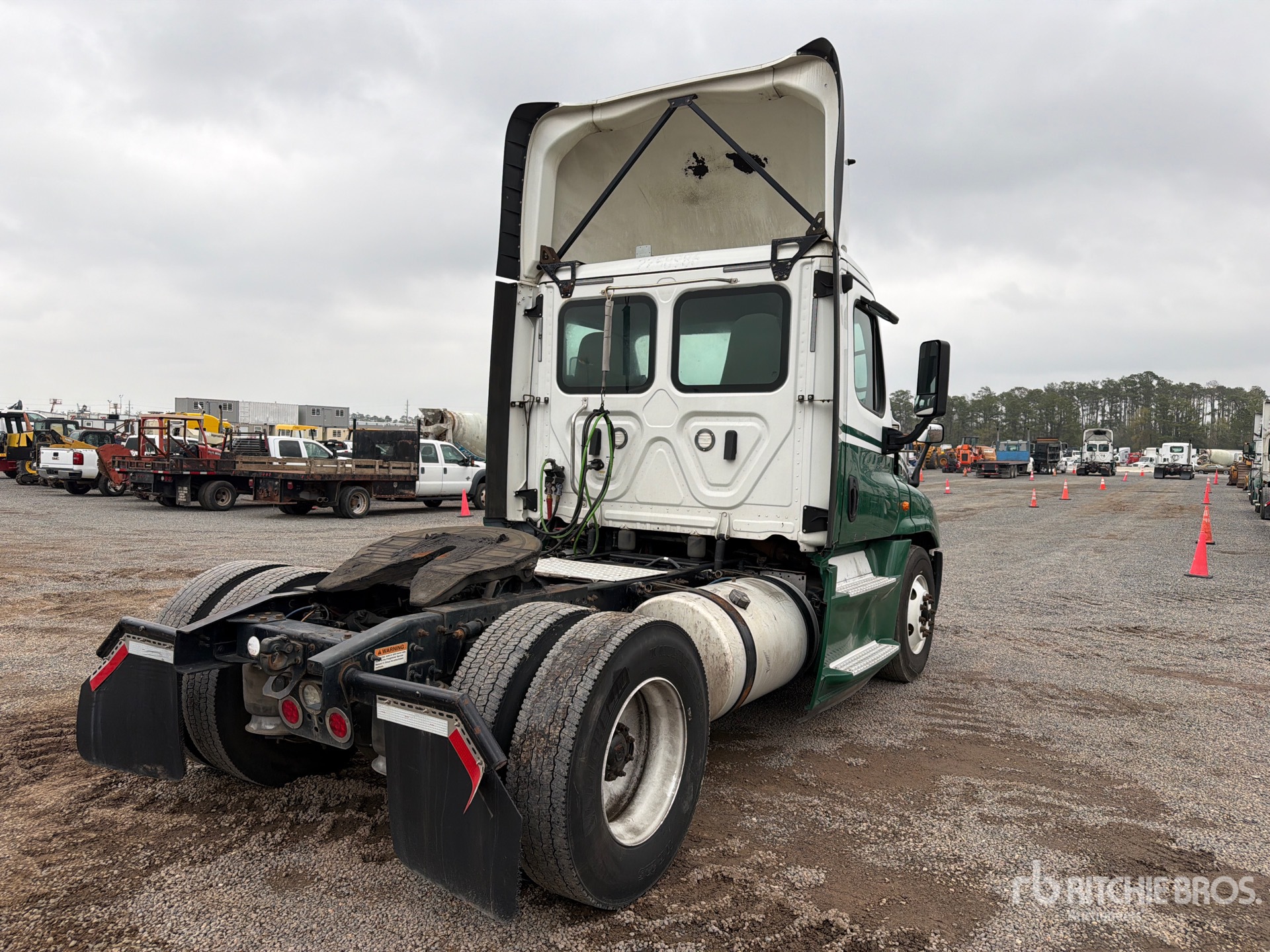 Situé sur la voie 32, emplacement 30, moteur Detroit DD15 de 505 ch, homologué EPA 2017, 1526,9 heures de fonctionnement, essieu avant de 12 000 lb, essieu arrière de 21 000 lb, PTAC de 33 000 lb, empattement de 158 pouces, suspension pneumatique, pneus avant 11R22.5, pneus arrière 11R22.5, double réservoir de carburant.