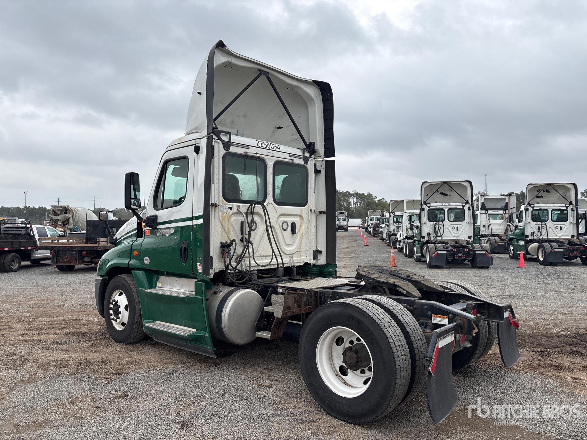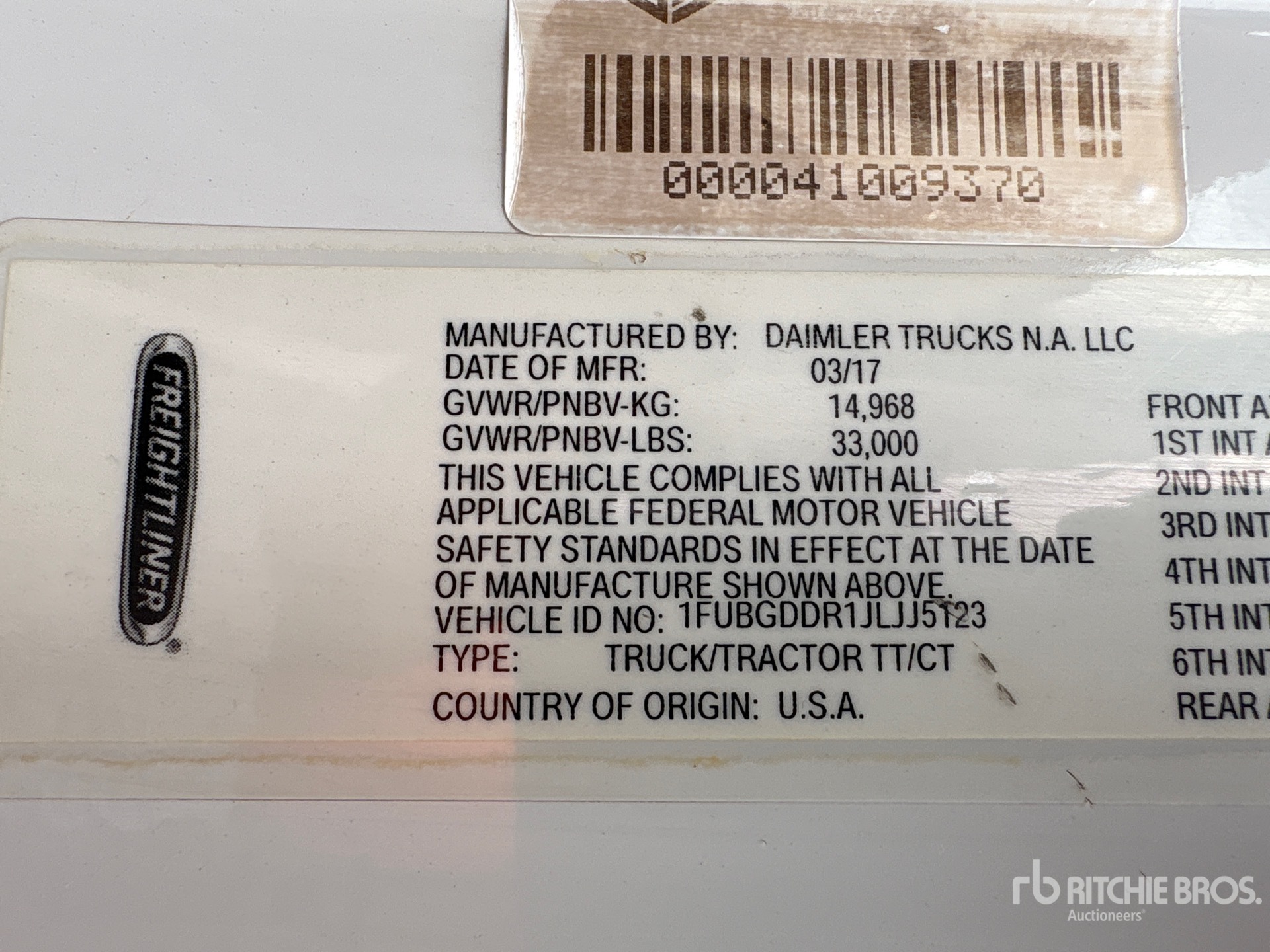 Situé sur la voie 32, emplacement 13, moteur Detroit DD15 de 505 ch, étiquette EPA américaine 2017, 17 917 heures de fonctionnement, transmission manuelle Eaton Fuller EATON FAO-15810C FULLER à 10 vitesses, essieu avant de 12 000 lb, essieux arrière de 21 000 lb, PTAC de 33 000 lb, frein moteur, empattement de 158 po, suspension pneumatique, pneus 11R22.5, double réservoir de carburant