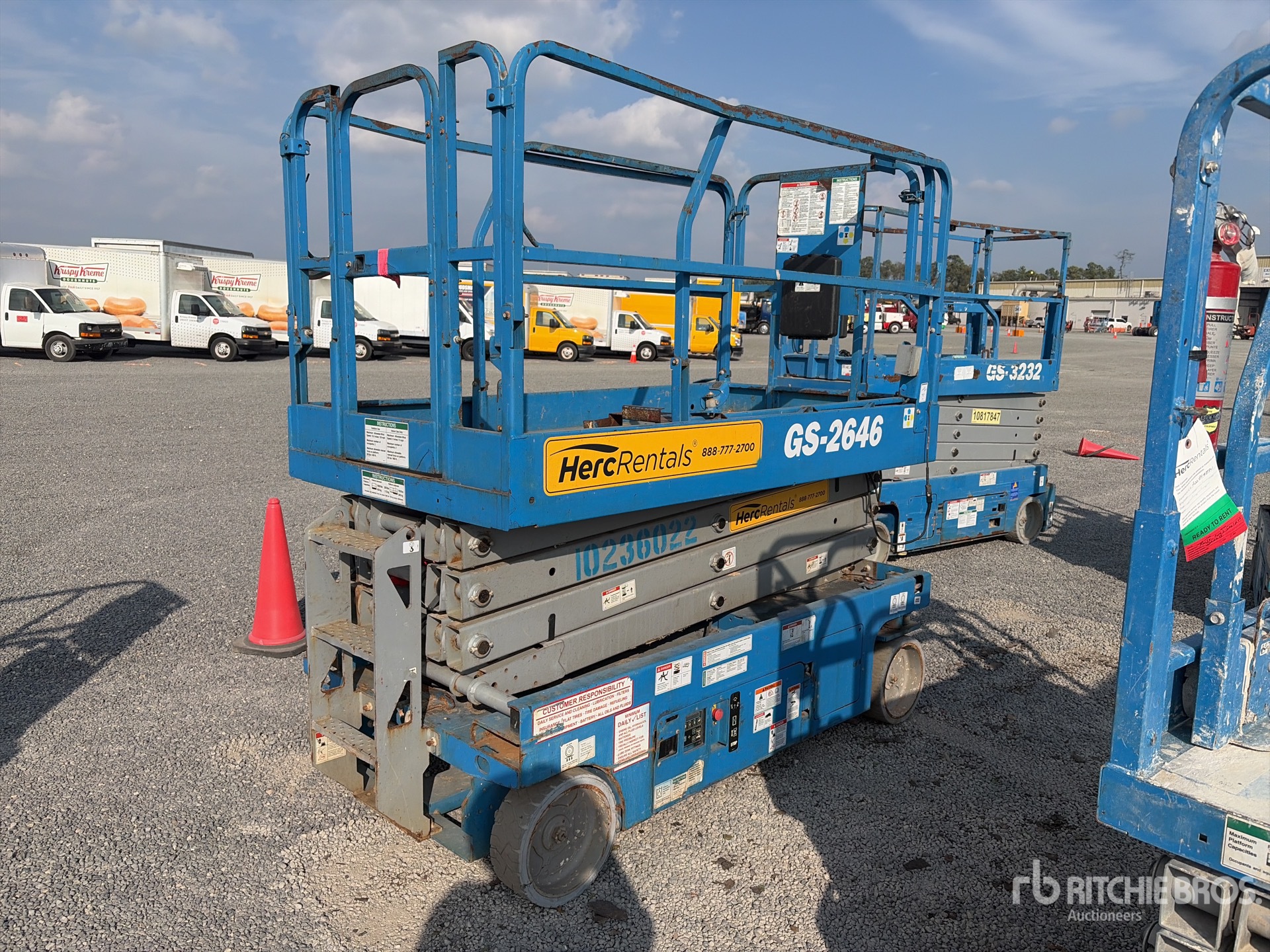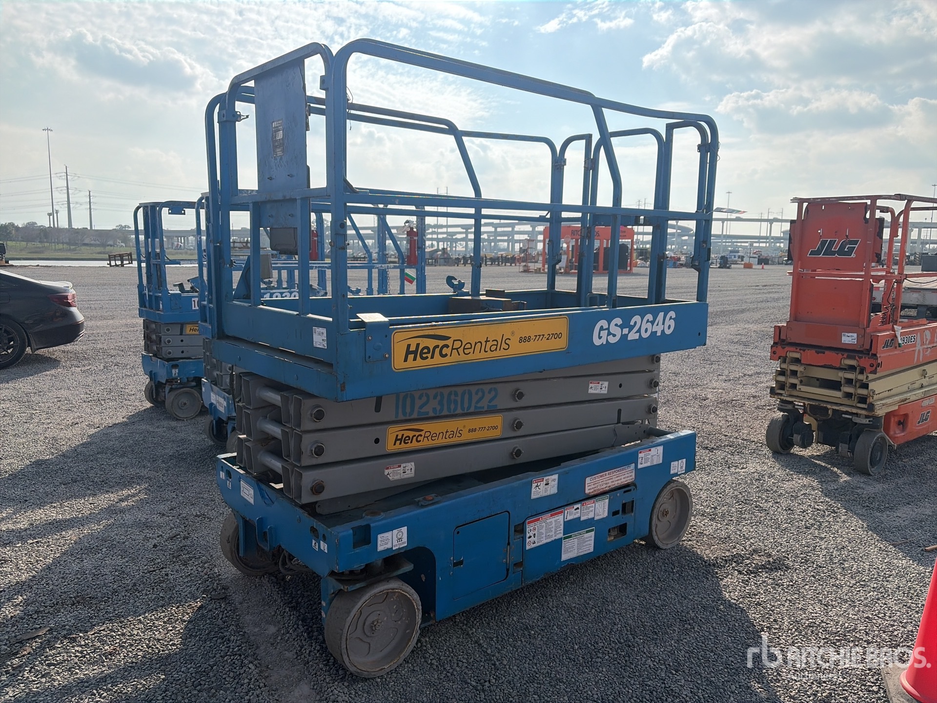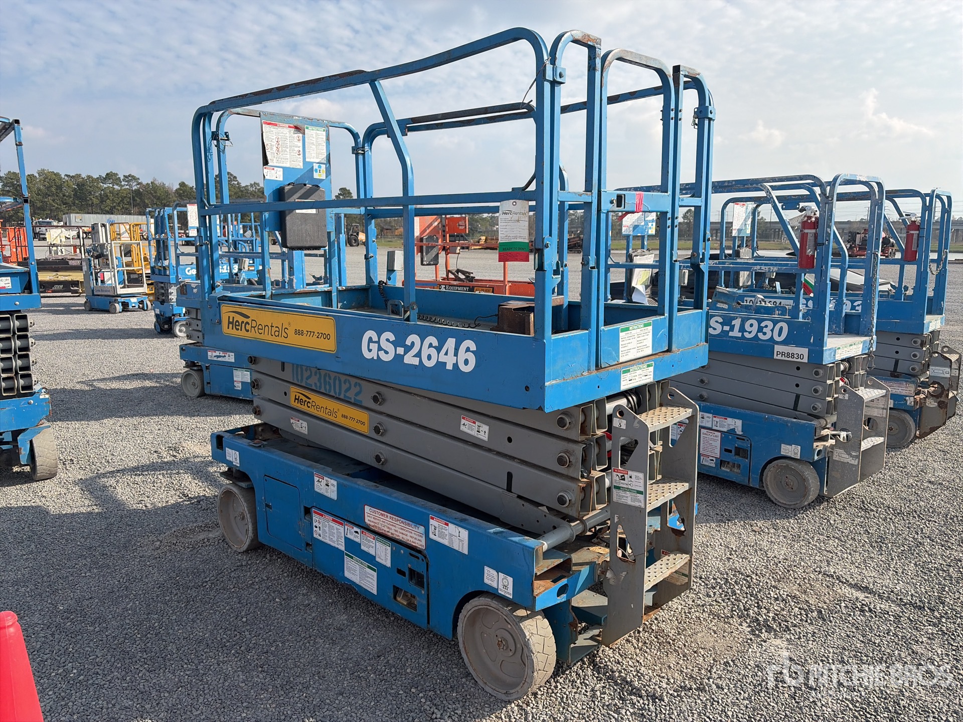 Hauteur maximale de la plateforme : 26 pi, capacité de charge maximale : 1 000 lb, rallonge de la plateforme, alimentation électrique, pneus pleins non marquants, boîtier de commande supérieur, équipement de location Herc.