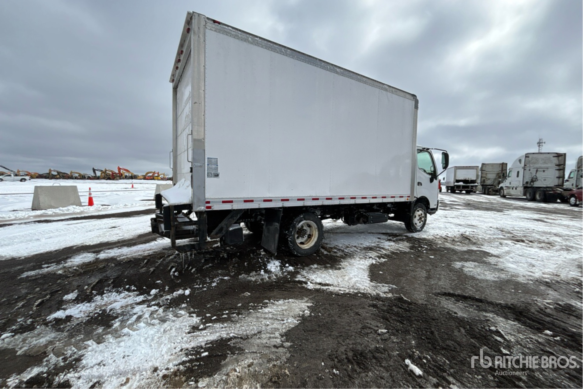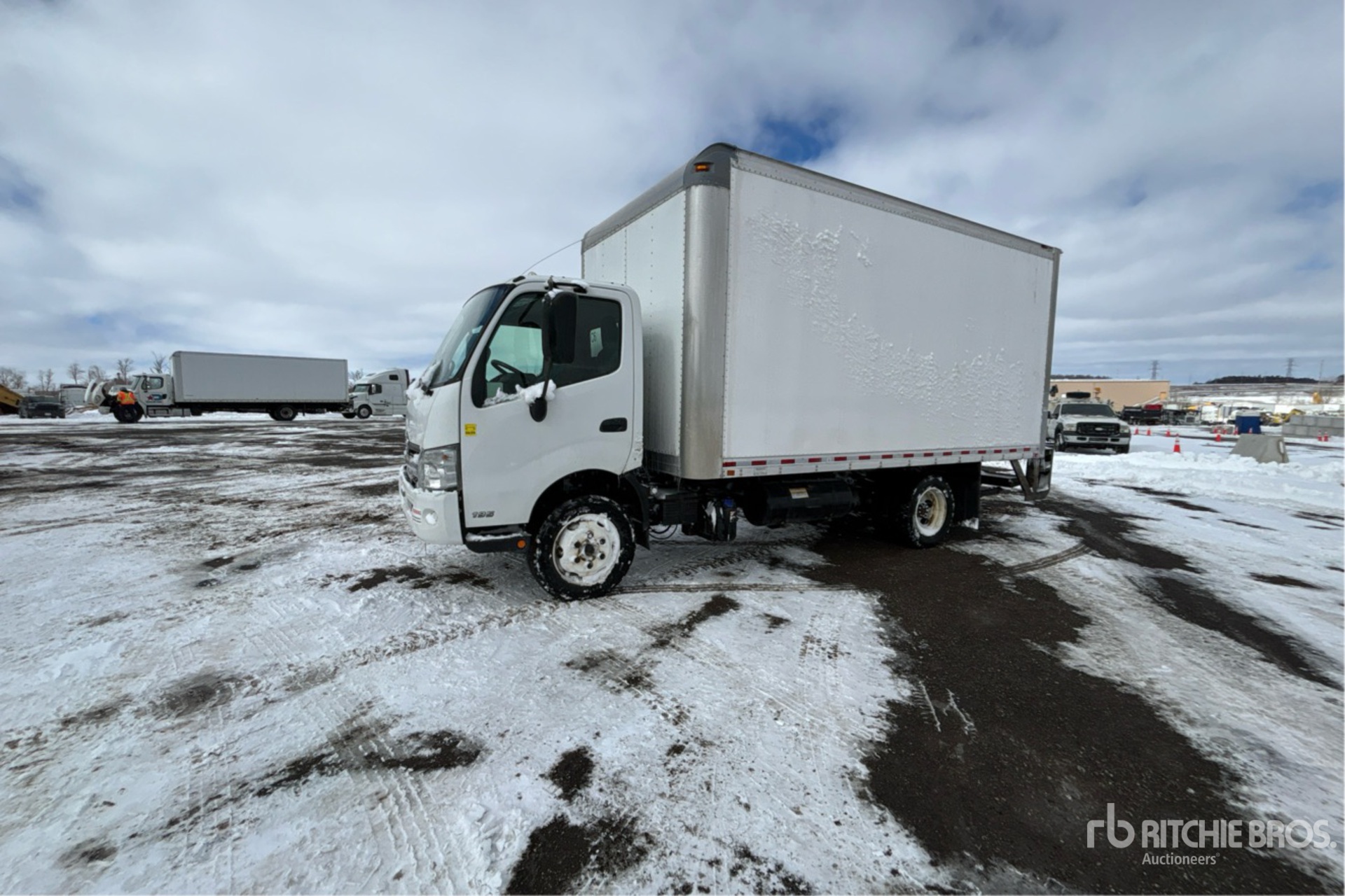 Moteur diesel Hino 4 cylindres 5,1 L 210 ch, homologué EPA 2017 (États-Unis), conforme aux normes CARB, nécessite un additif pour réservoirs de diesel, transmission automatique, essieu avant 3 300 kg, essieux arrière 6 200 kg, PTAC 8 845 kg, pneus 225/70R19.5, suspension à ressorts, empattement 3,81 m, benne Morgan 4,88 m x 2,44 m x 2,29 m, hayon élévateur