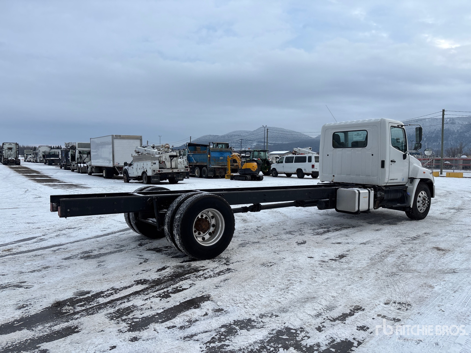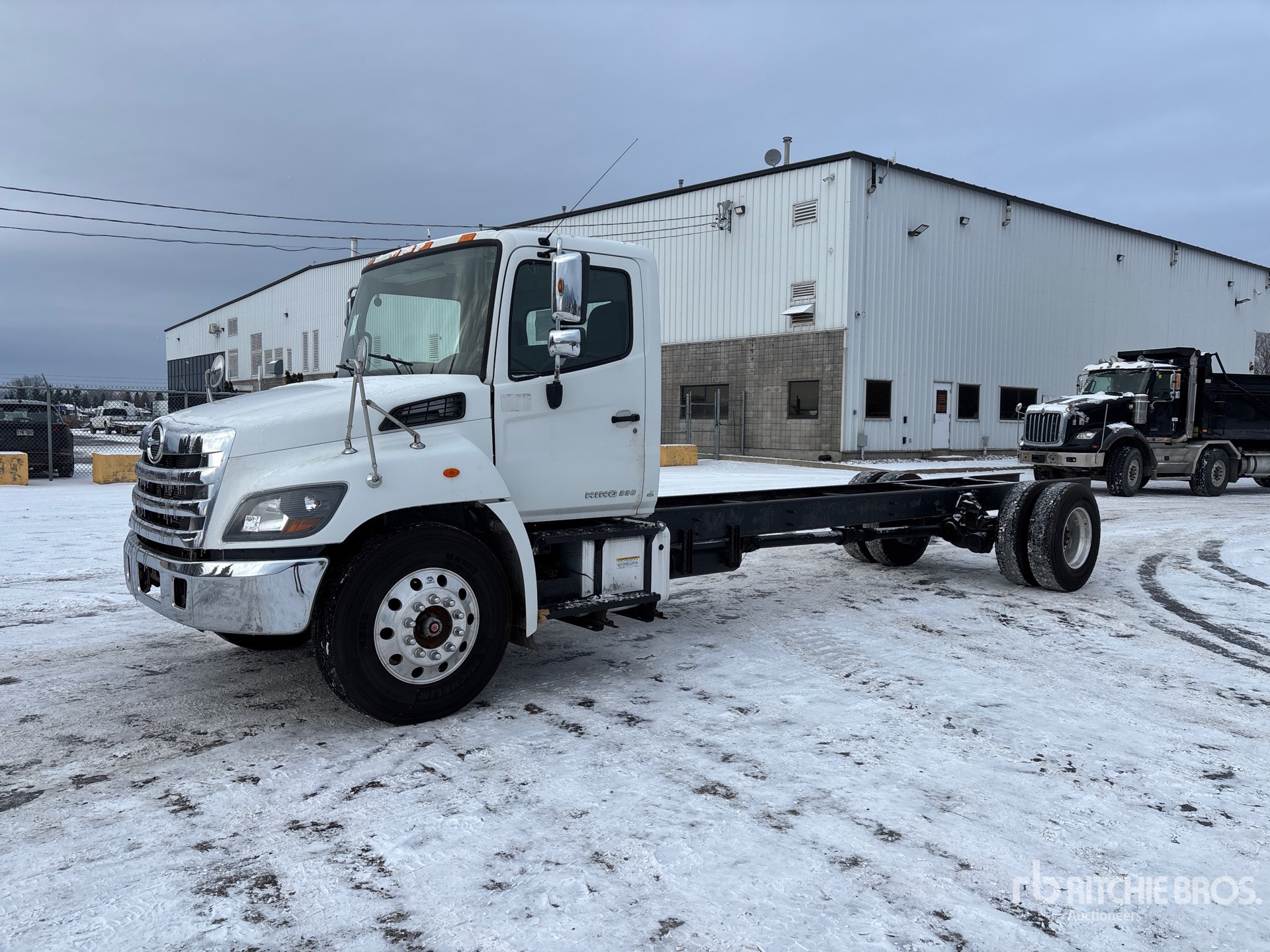 Situé sur la voie 3, emplacement 5, moteur diesel Hino 5 cylindres, étiquette EPA américaine 2017, nécessite du liquide d'échappement diesel, transmission automatique, essieu avant de 5 443 kg (12 000 lb), essieux arrière de 9 525 kg (21 000 lb), PTAC de 14 950 kg, jantes en aluminium, pneus 11R22.5, suspension pneumatique Hendrickson, empattement de 690 mm (272 po), distance cabine-essieu de 518 mm (204 po), distance cabine-extrémité du châssis de 716 mm (282 po).