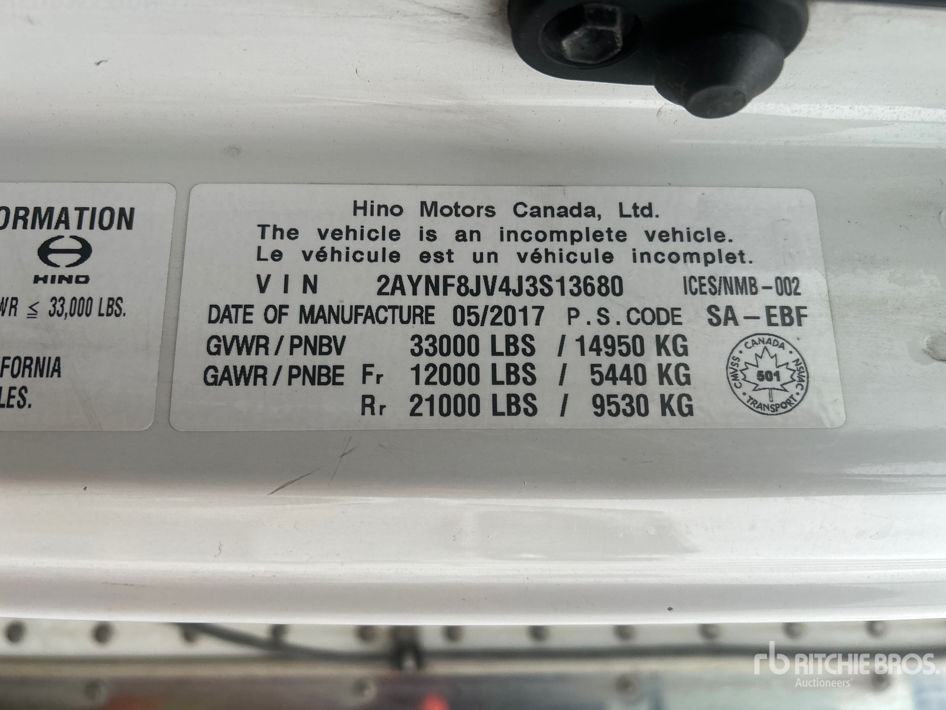 Les Informations détaillées de l’équipement sont d’une portée limitée, et les Encans Ritchie Bros. n’ont inspecté aucun autre aspect ou composant de l’équipement que ceux présentés expressément. Sauf indication précise, nous n’offrons aucune représentation ou garantie, officielle ou implicite, sur l’équipement ou ses composants, sans aucune limite de représentation ou de garantie en ce qui concerne la fonctionnalité, la conformité à toute norme de sécurité ou l’exigence de toute autorité ou agence de régulation en vigueur, l’adaptation à un quelconque usage, ou la valeur commerciale. Il vous est fortement conseillé d’effectuer votre propre inspection détaillée de l’équipement avant d’enchérir.