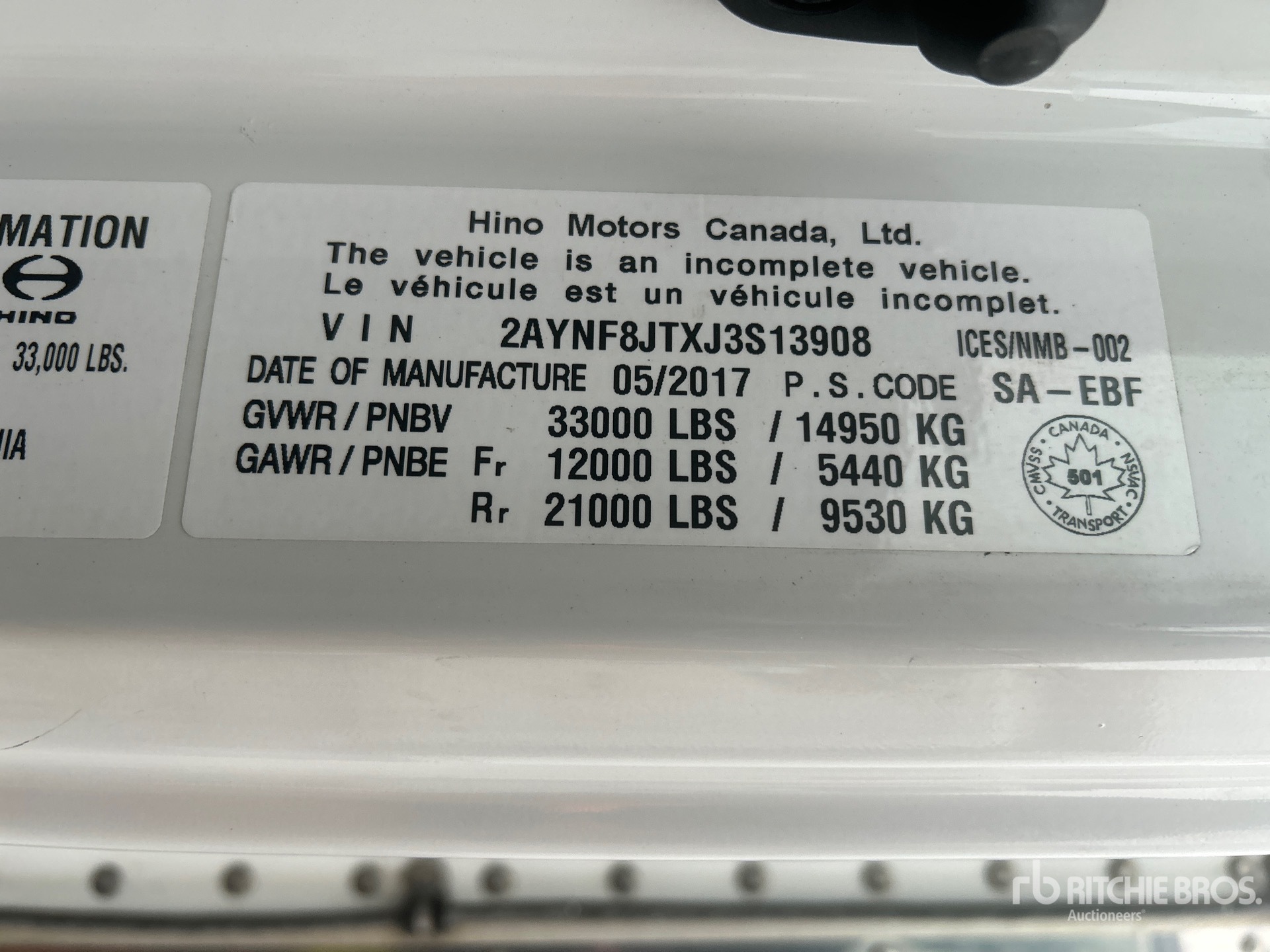 Les Informations détaillées de l’équipement sont d’une portée limitée, et les Encans Ritchie Bros. n’ont inspecté aucun autre aspect ou composant de l’équipement que ceux présentés expressément. Sauf indication précise, nous n’offrons aucune représentation ou garantie, officielle ou implicite, sur l’équipement ou ses composants, sans aucune limite de représentation ou de garantie en ce qui concerne la fonctionnalité, la conformité à toute norme de sécurité ou l’exigence de toute autorité ou agence de régulation en vigueur, l’adaptation à un quelconque usage, ou la valeur commerciale. Il vous est fortement conseillé d’effectuer votre propre inspection détaillée de l’équipement avant d’enchérir.