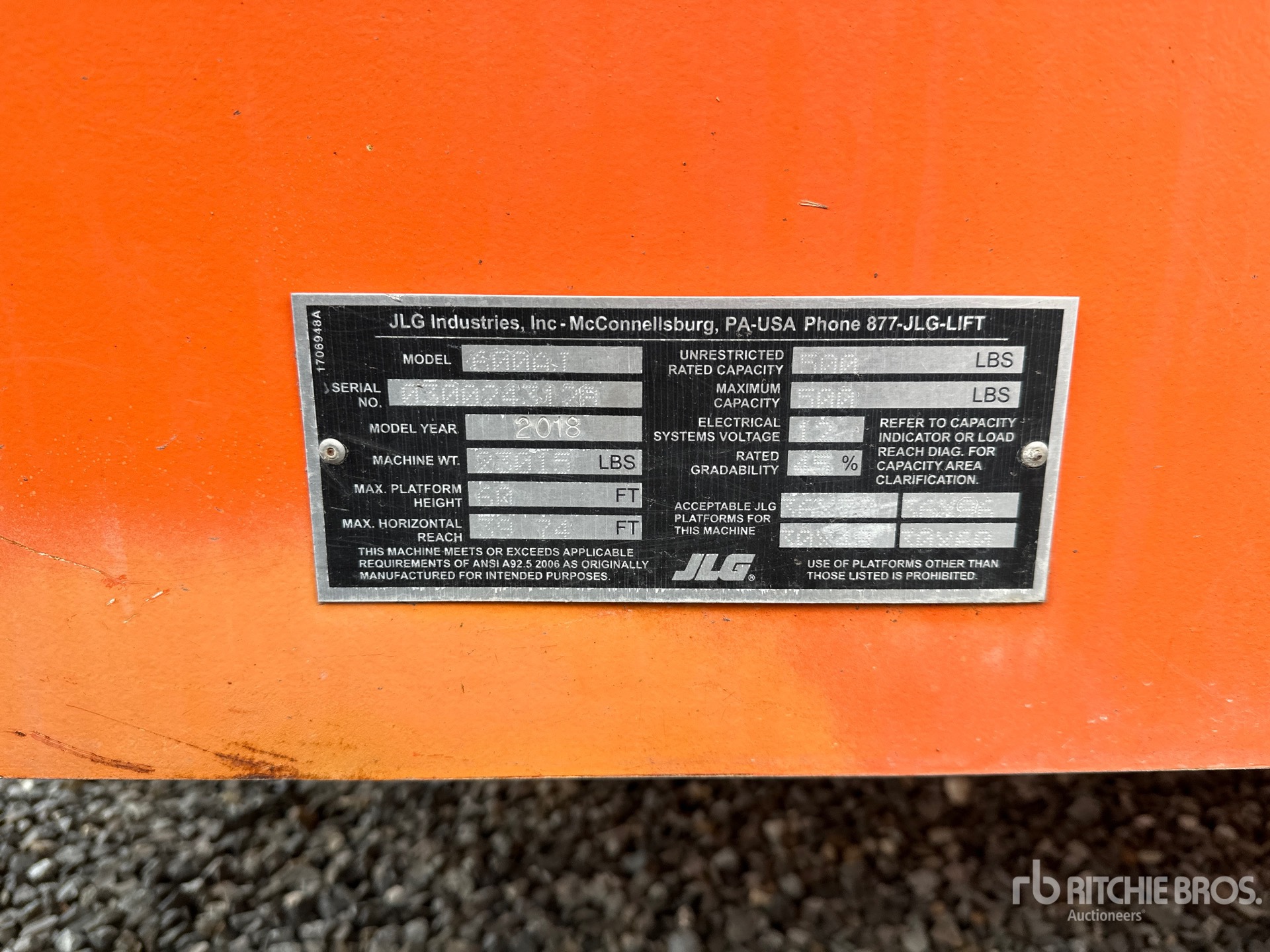 Hauteur maximale de la plateforme : 18,3 m (60 pi), capacité de charge maximale : 227 kg (500 lb), flèche, alimentation électrique de la plateforme, homologation EPA américaine 2017, moteur diesel Deutz TD 2.9 L4 à 4 cylindres de 50 kW (2,9 L), pneus 355/55D625