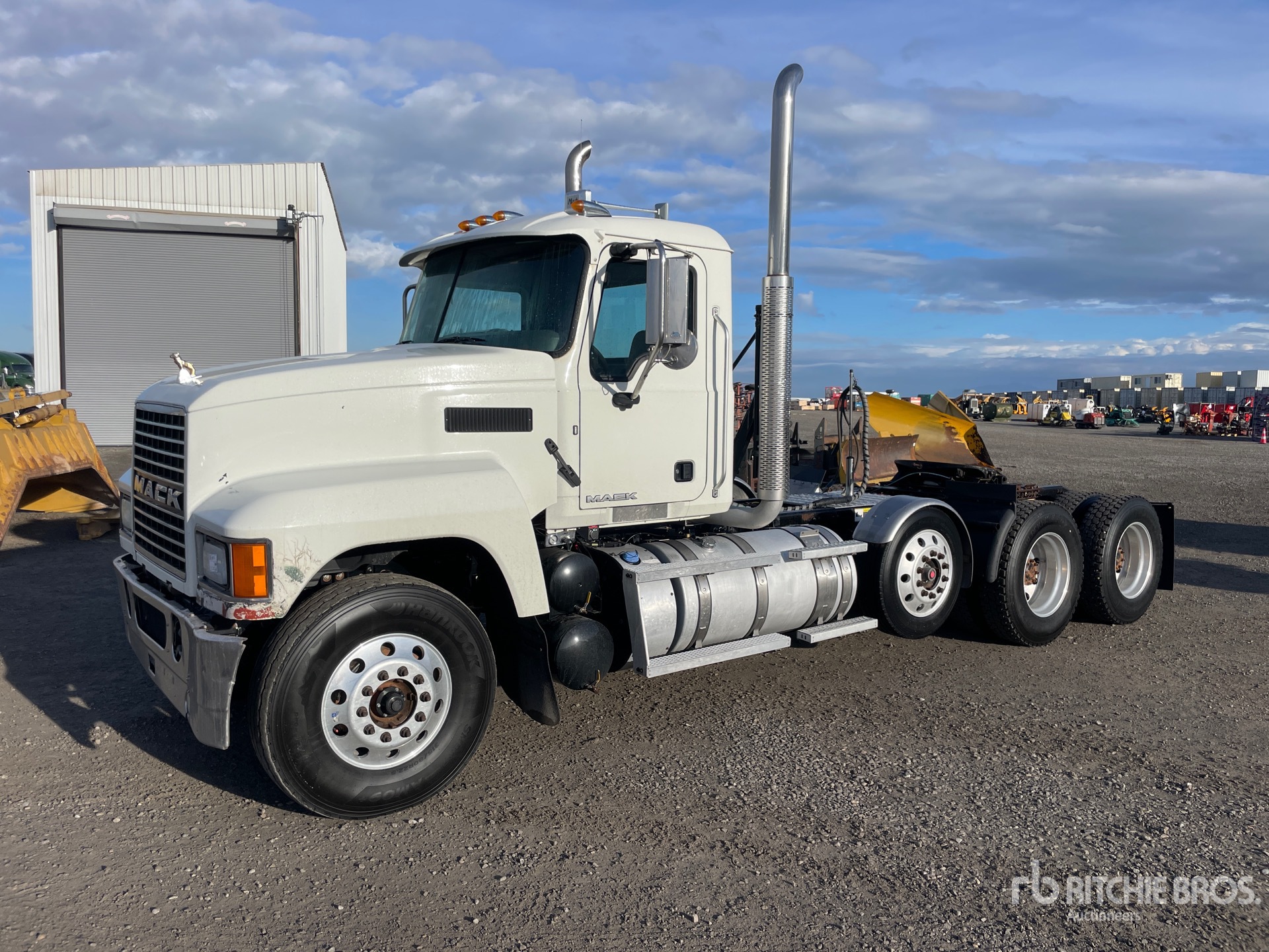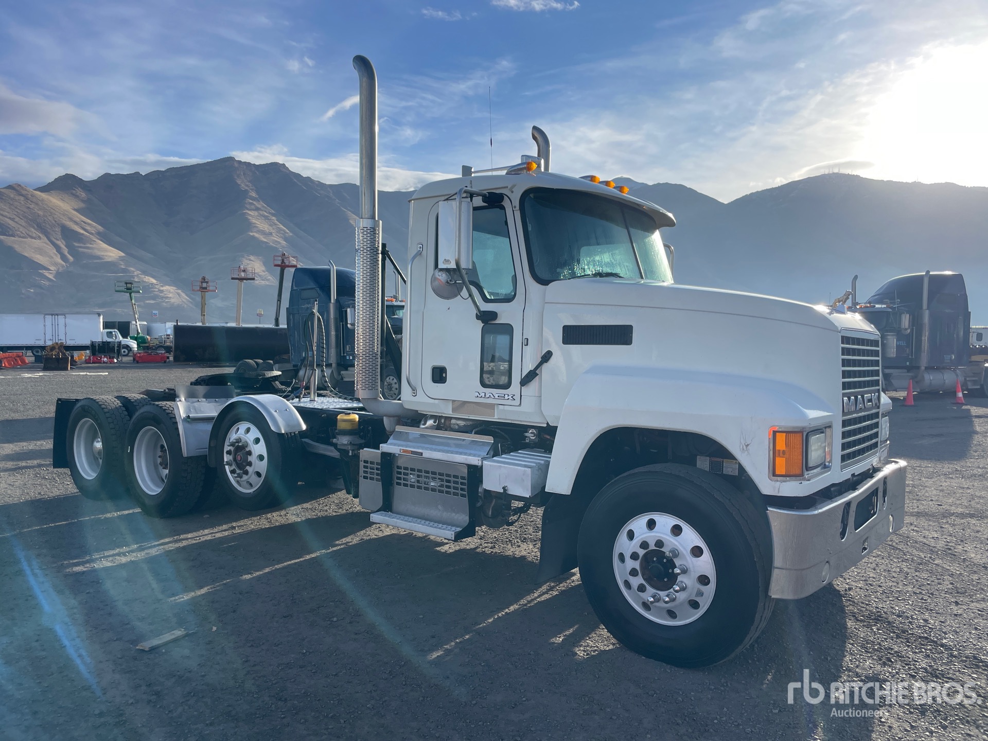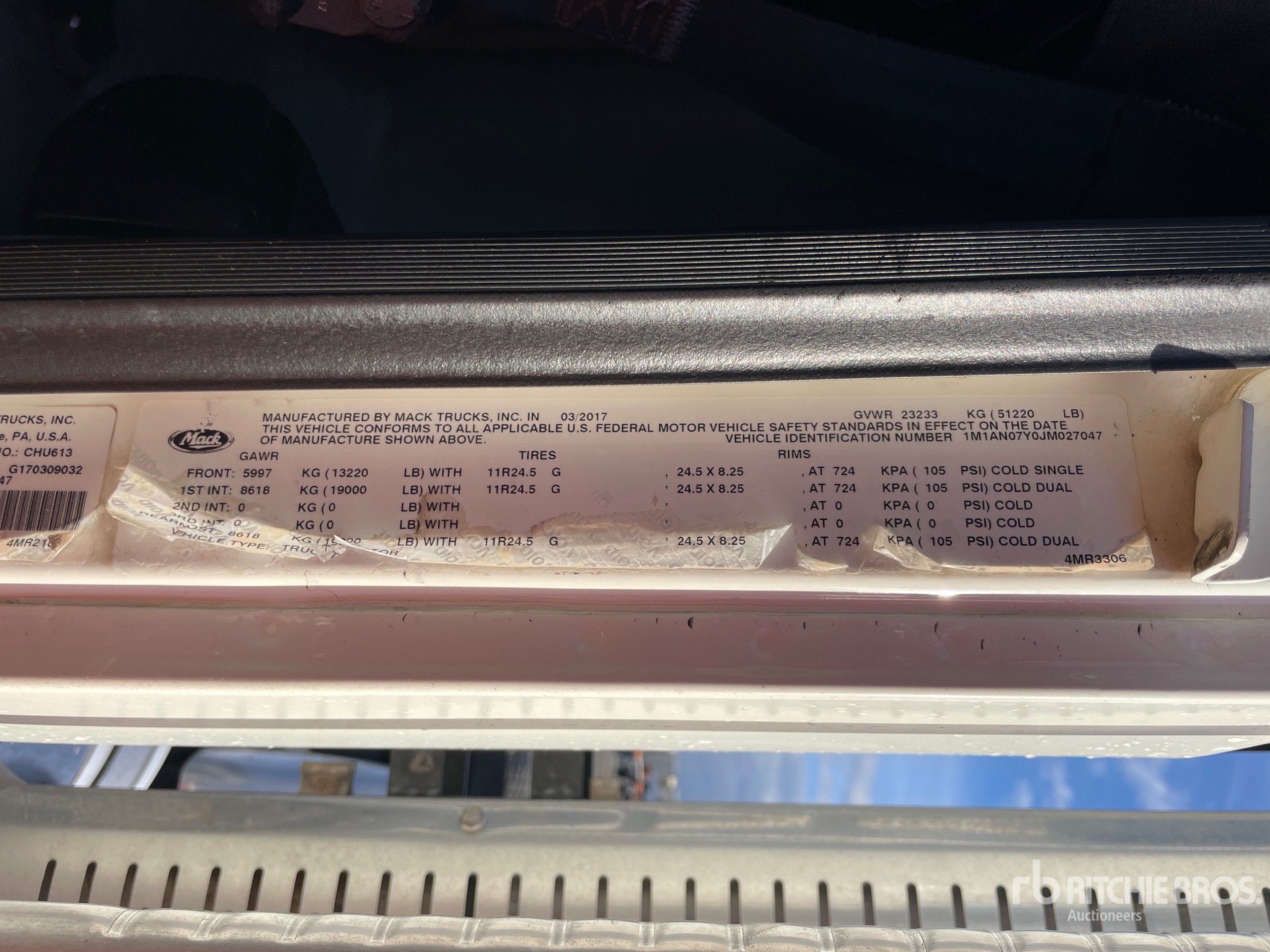 Moteur Mack MP8 de 505 ch, homologué EPA (États-Unis) 2017, transmission manuelle Mack Maxtourque à 18 vitesses, essieu avant de 5 987 kg, essieux arrière de 17 137 kg, PTAC de 23 250 kg, frein moteur, empattement de 592 cm, suspension pneumatique, essieu porteur relevable pneumatique, jantes en aluminium, pneus avant 315/80R22.5, pneus arrière 11R22.5, sellette d'attelage coulissante pneumatique