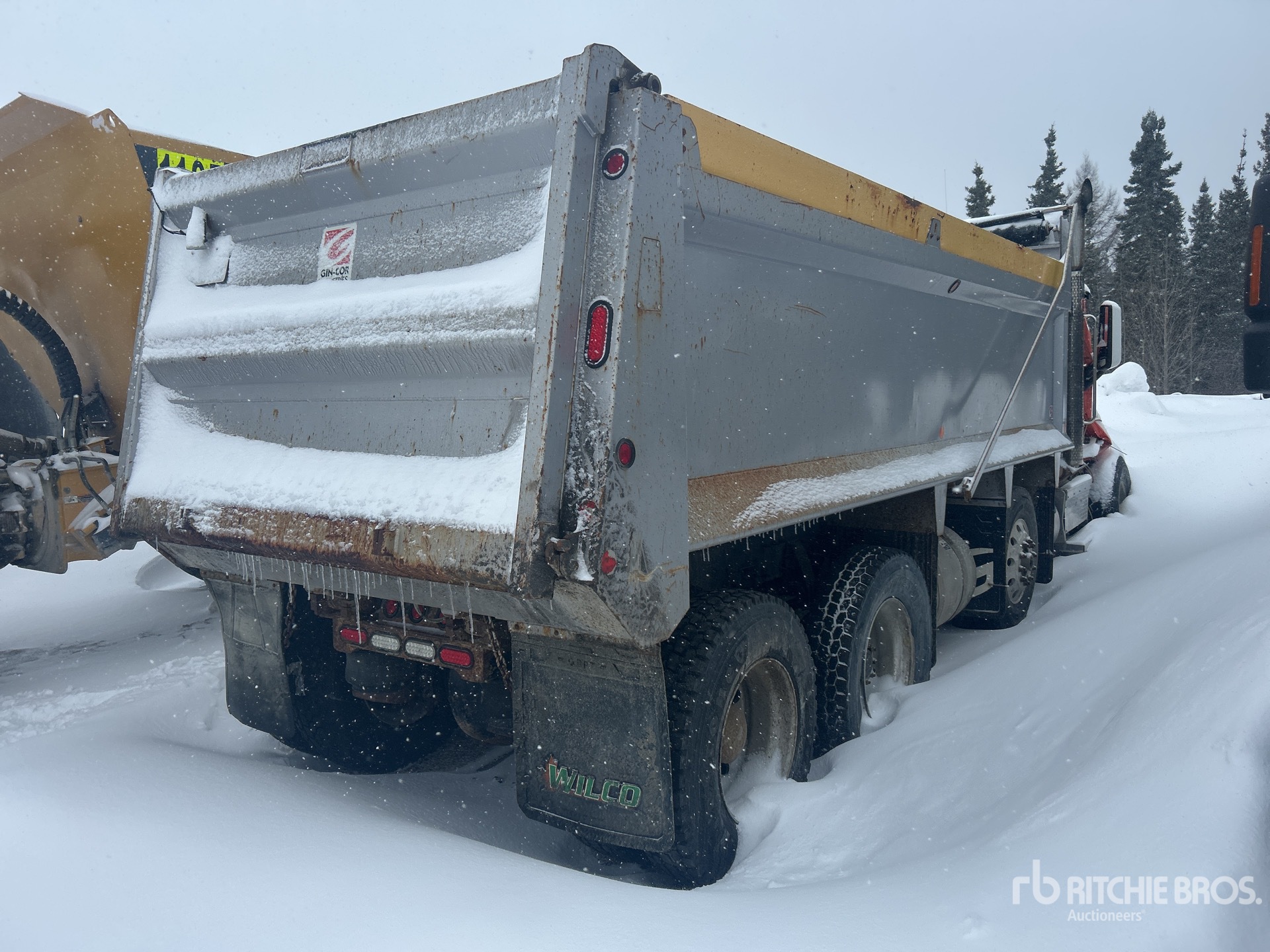 Camion Paccar MX-13, moteur diesel 6 cylindres 12,9 L 510 ch, frein moteur, transmission automatique Eaton Fuller, double blocage de différentiel, essieu avant 9 072 kg, essieu arrière 20 867 kg, cabine à suspension pneumatique, jantes en aluminium, pneus avant 425/65R22.5, pneus arrière 11R22.5, essieu porteur relevable pneumatique directionnel, double boîtier de direction, châssis double, suspension pneumatique à lames, prise de force, kit hydraulique, caisse Bibeau en acier 6,10 m de long x 1,83 m de haut, caisse chauffée, bâche enroulable pneumatique, deux réservoirs de carburant côté conducteur, protection de cabine sur la caisse.