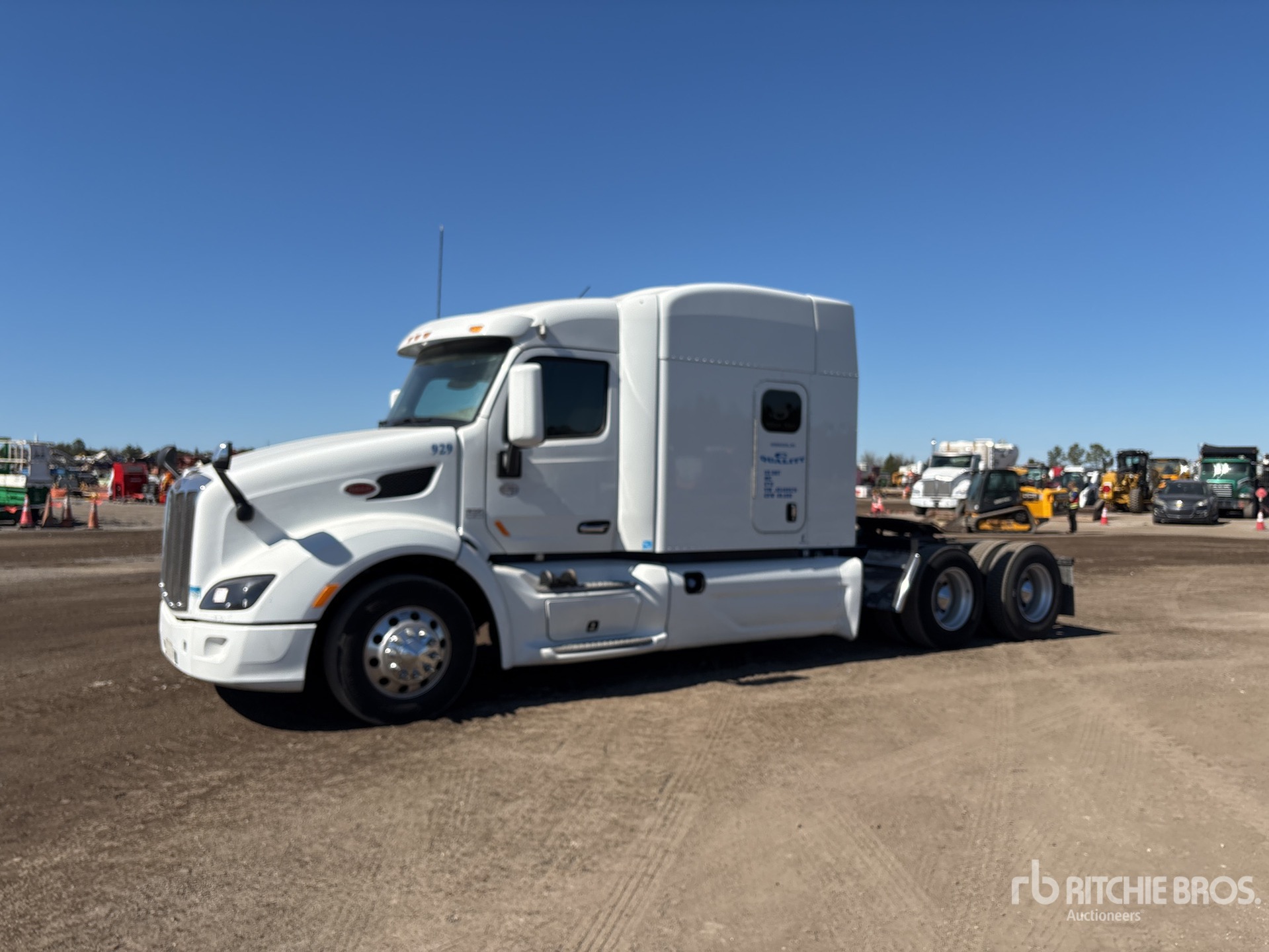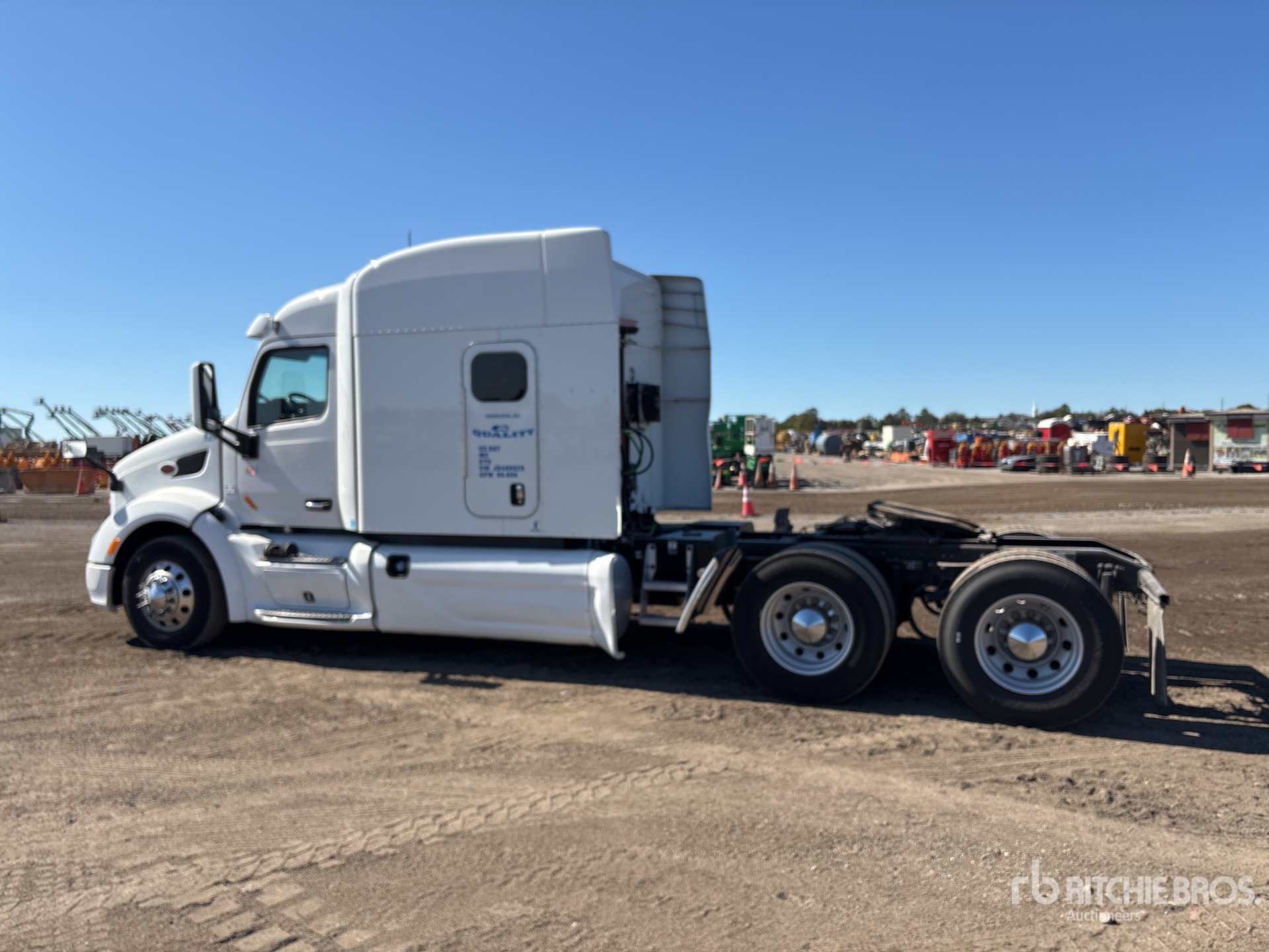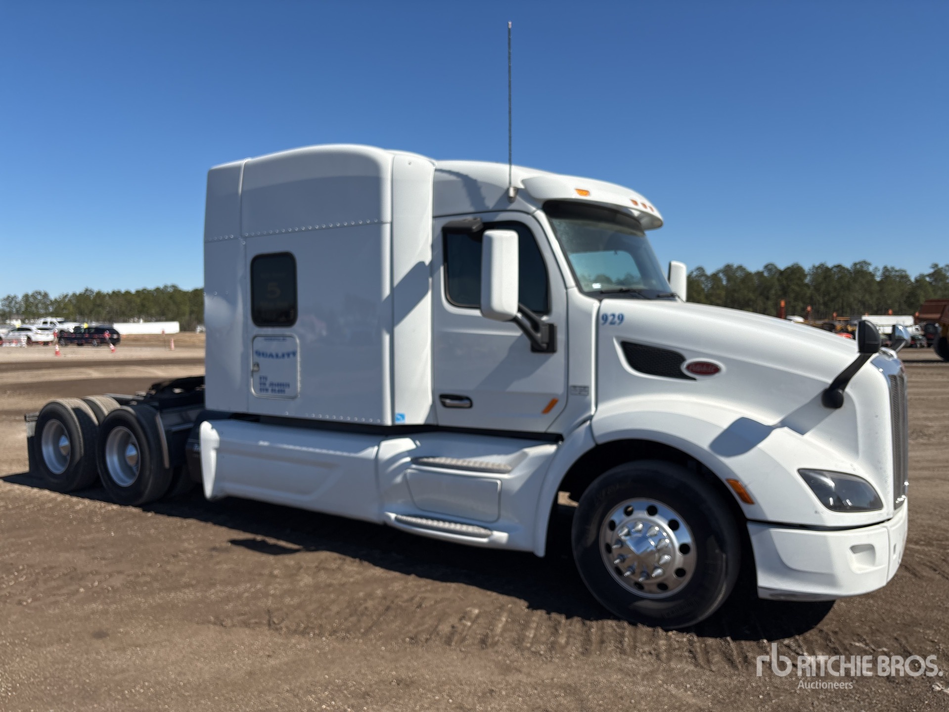 Situé à l'emplacement 35, moteur Cummins X15, étiquette EPA américaine 2017, 29 935 heures moteur, transmission automatique Eaton Fuller, essieu avant de 13 200 lb, essieux arrière de 38 000 lb, PTAC de 51 200 lb, frein moteur, blocage de différentiel, cabine couchette à toit surélevé de 70 po, lits superposés, chauffage de couchette, groupe auxiliaire de puissance, climatiseur de couchette Thermo King, empattement de 240 po, suspension pneumatique, jantes en aluminium, pneus 295/75R22.5, sellette d'attelage coulissante pneumatique, deux réservoirs de carburant.