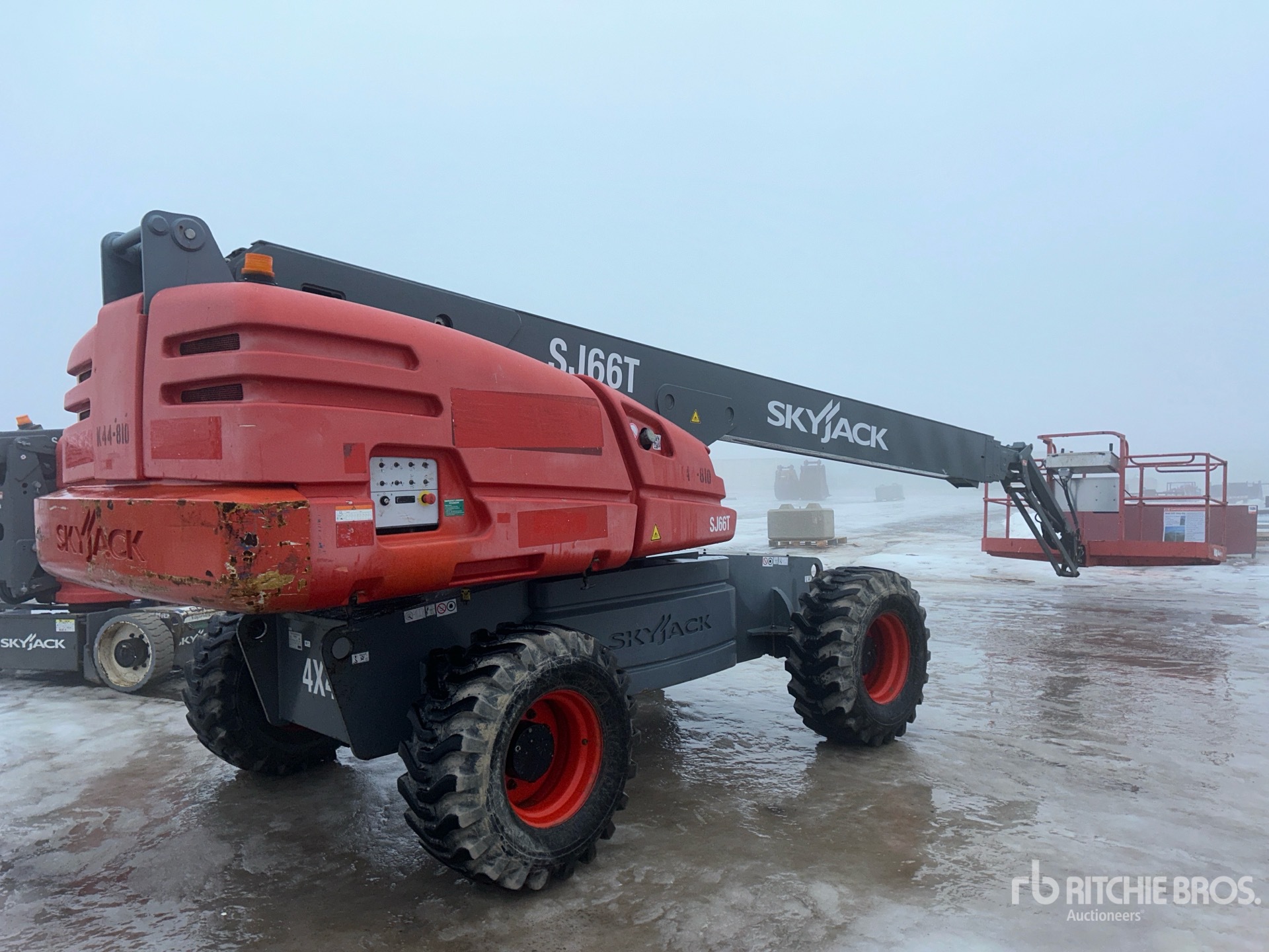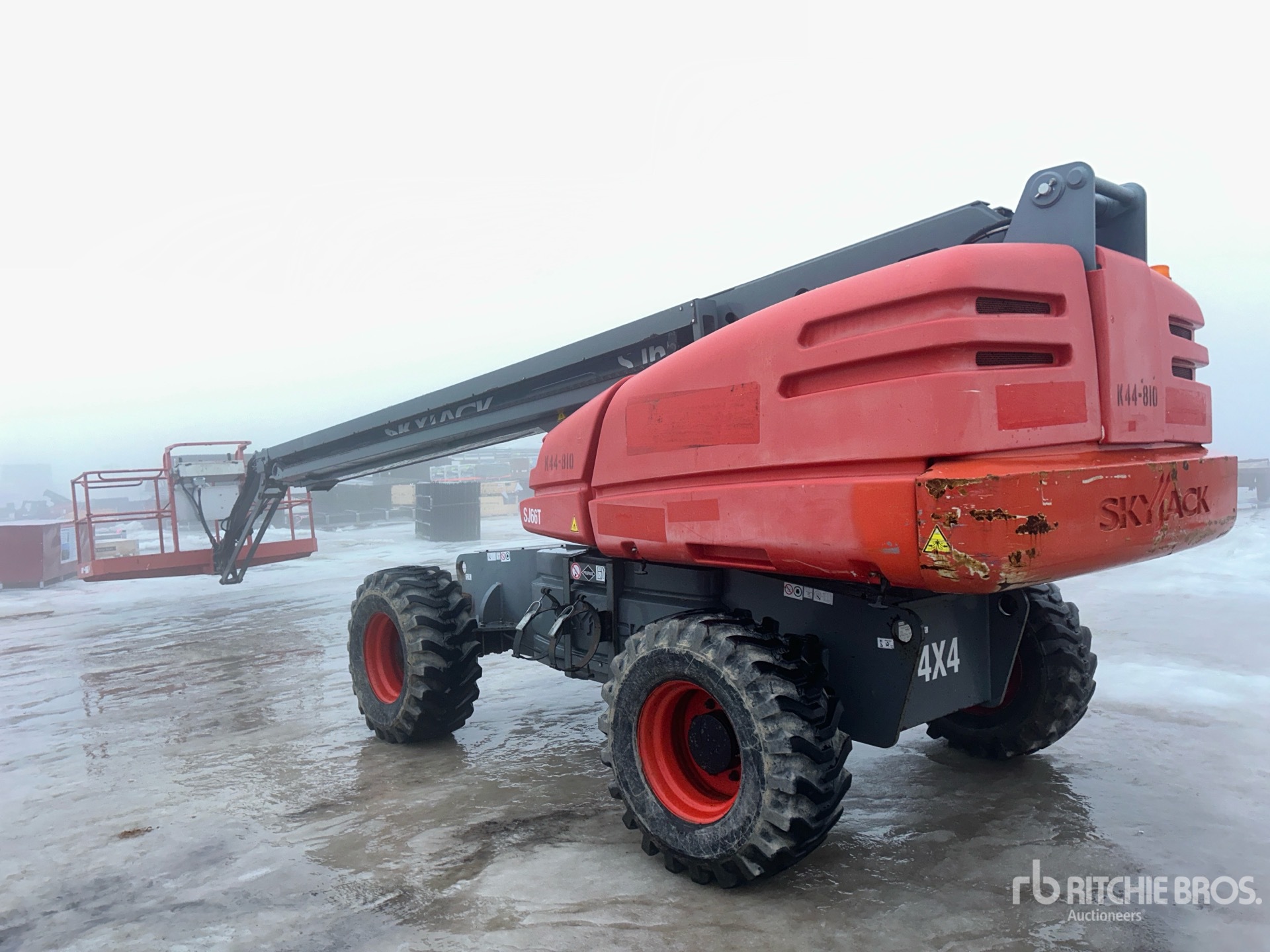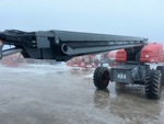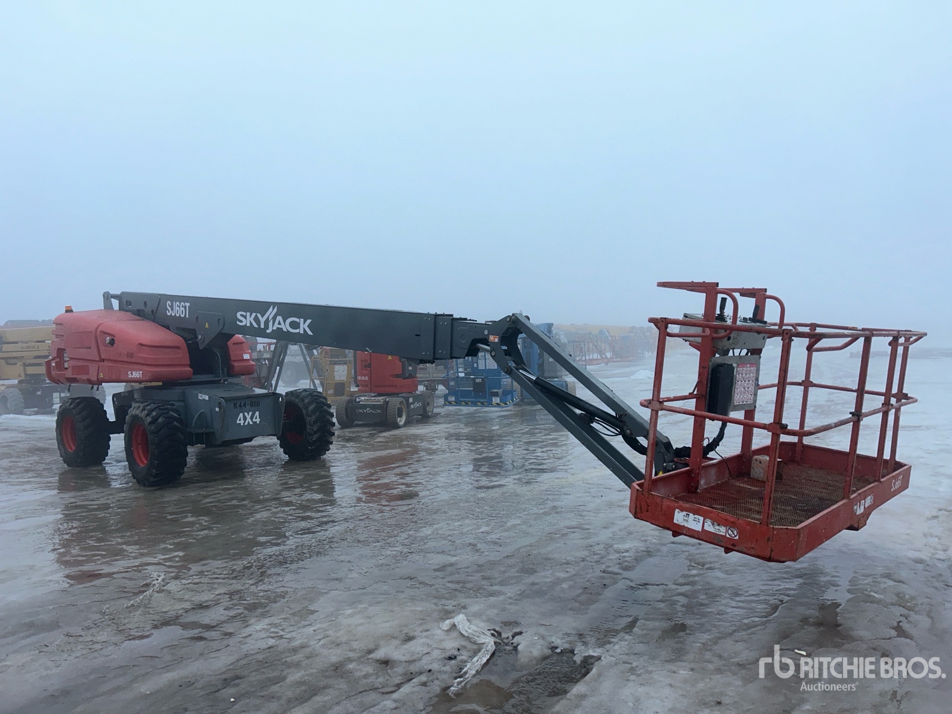 Hauteur maximale de la plateforme : 20 m (66 pi), capacité de charge maximale : 227 kg (500 lb), essieux extensibles, alimentation électrique de la plateforme, moteur à 4 cylindres, pneus 385/65D19.5