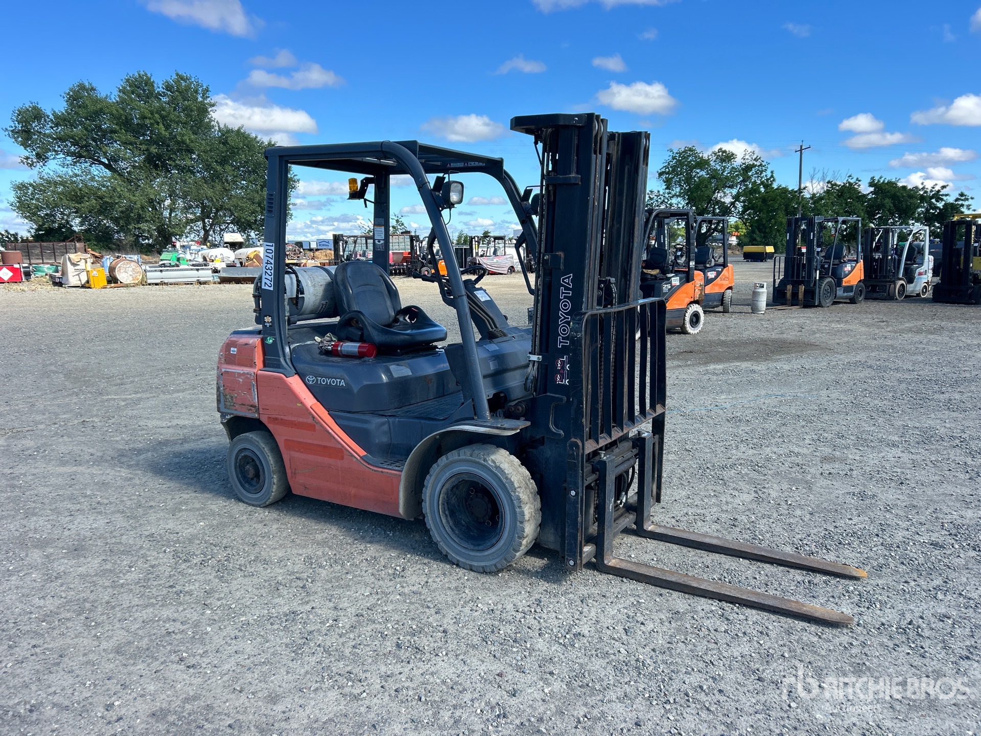 Mât à 3 sections, levage libre total, hauteur de levage maximale de 4,80 m (189 po), hauteur de mât abaissée de 1,96 m (77 po), fourches de 1,04 m (41 po), positionneur de fourches, pneus pleins, homologation EPA américaine 2018, moteur Toyota 2,237 L à double carburant