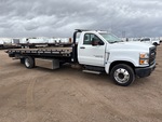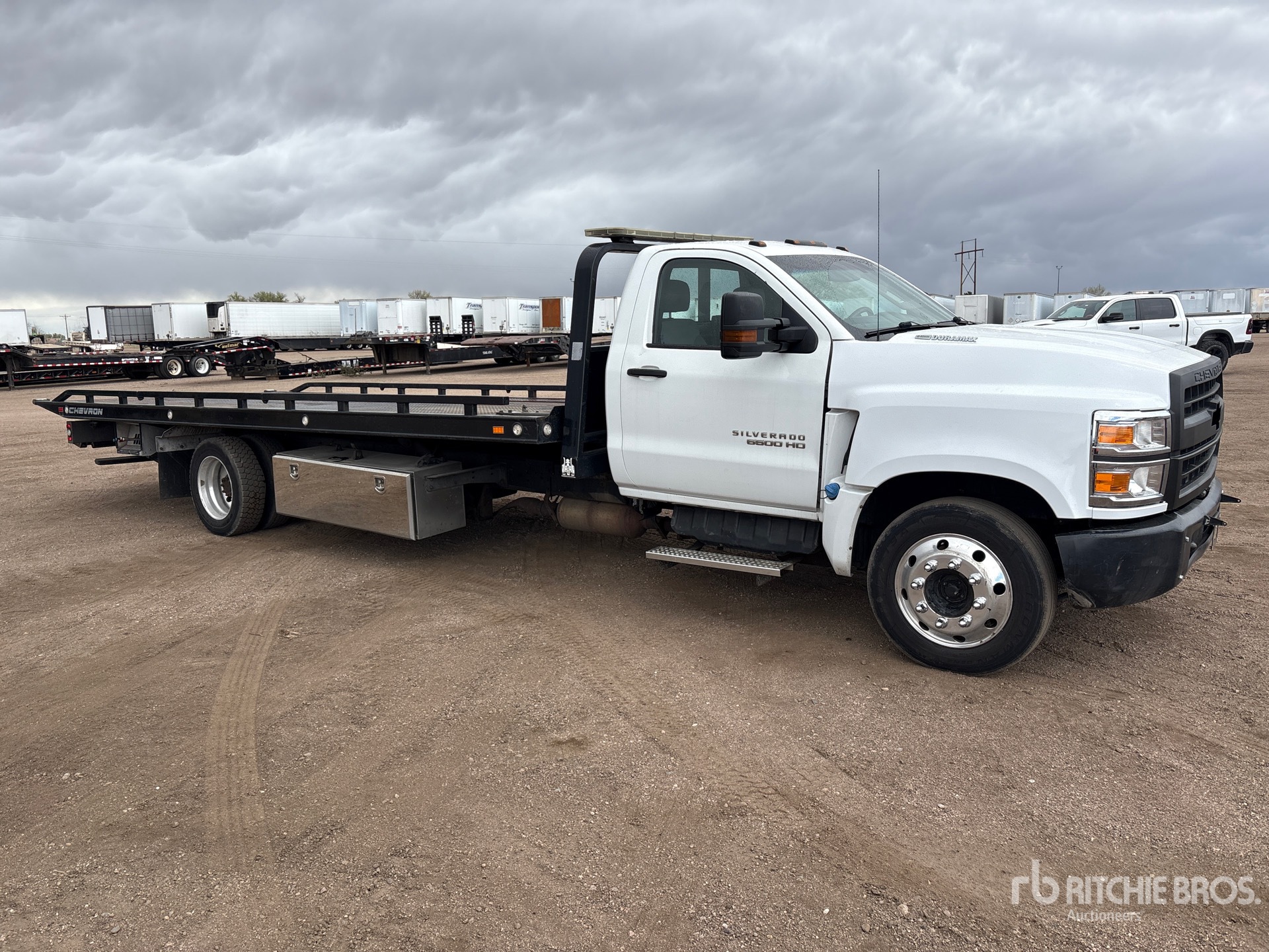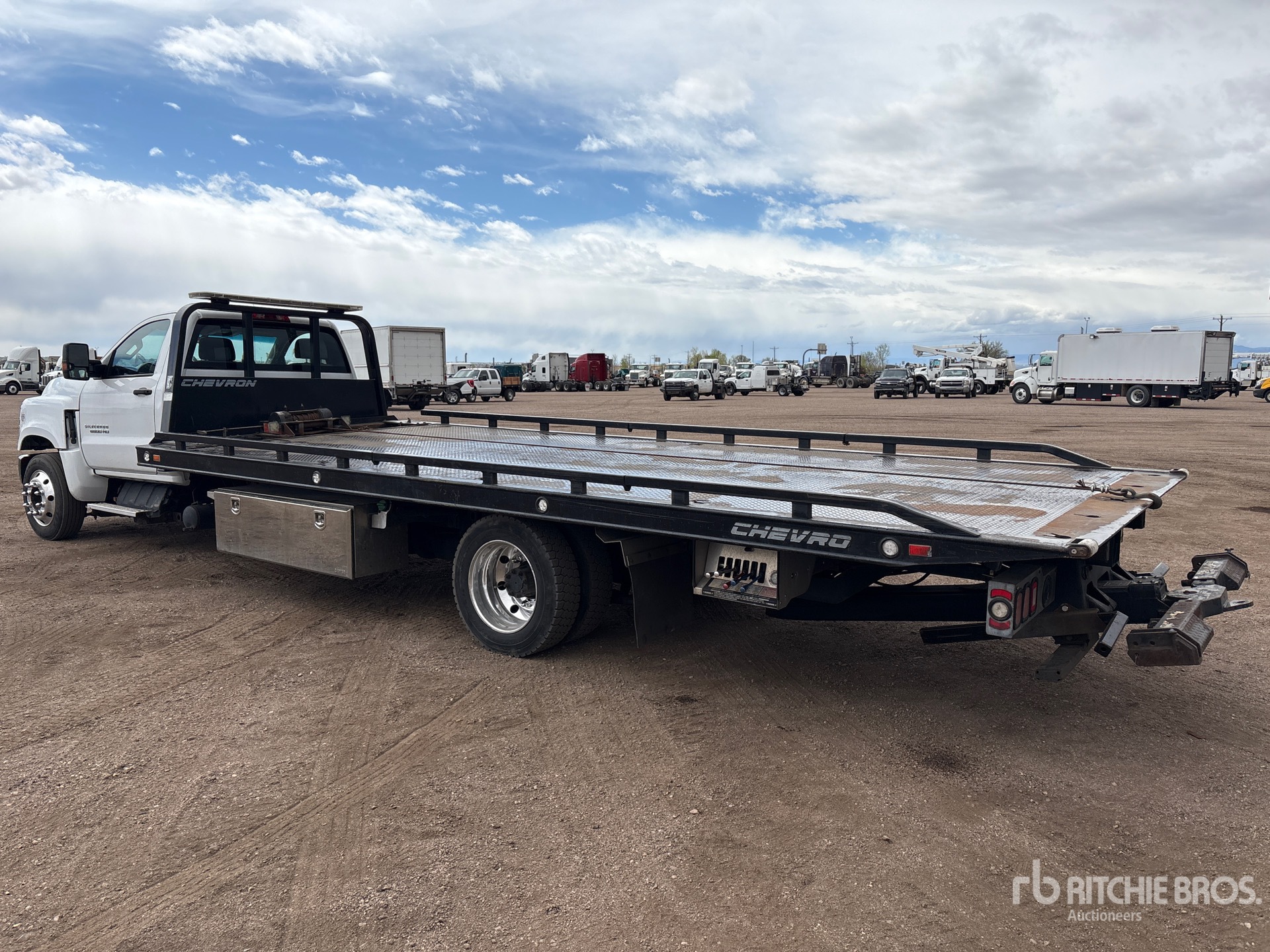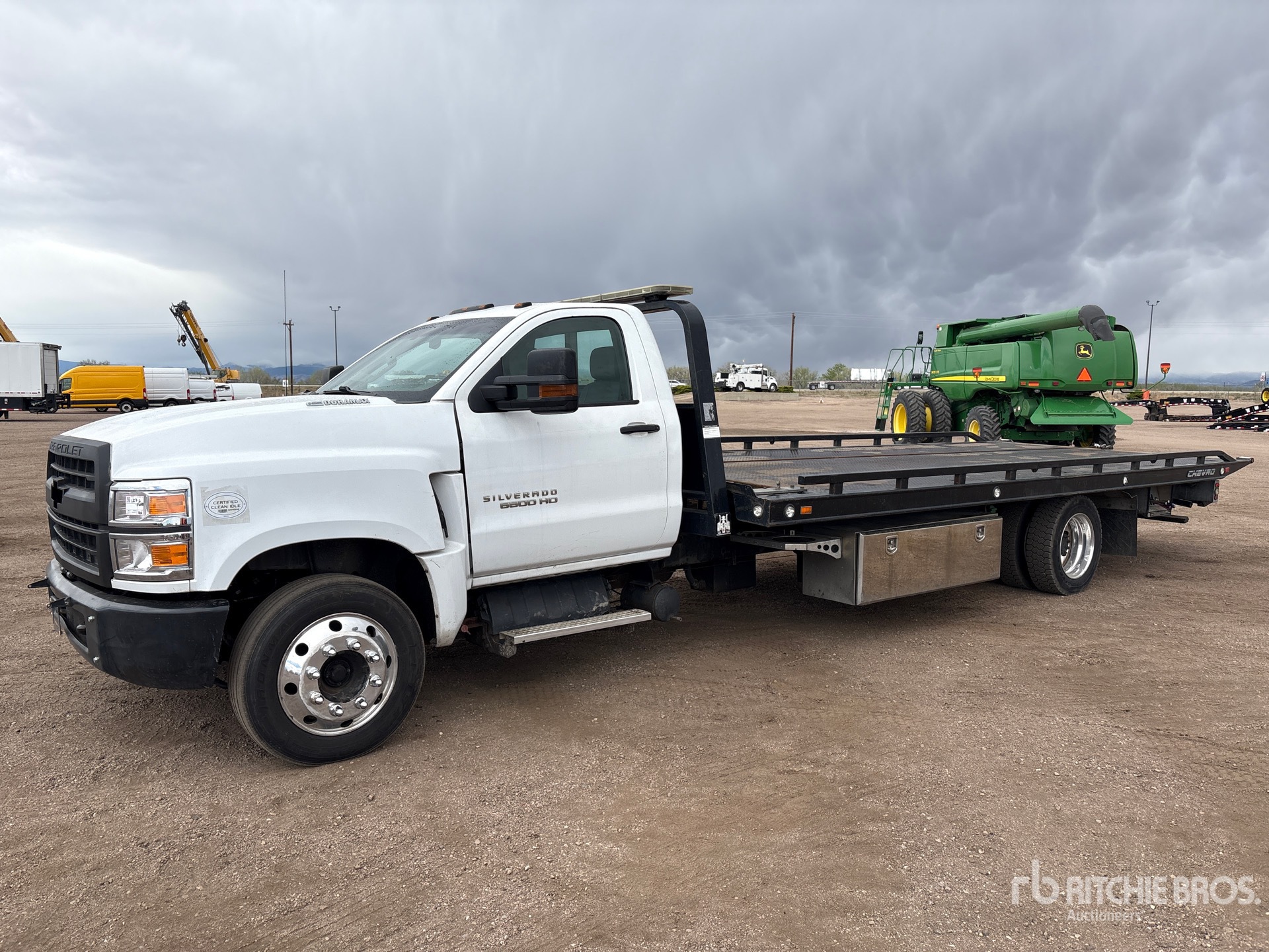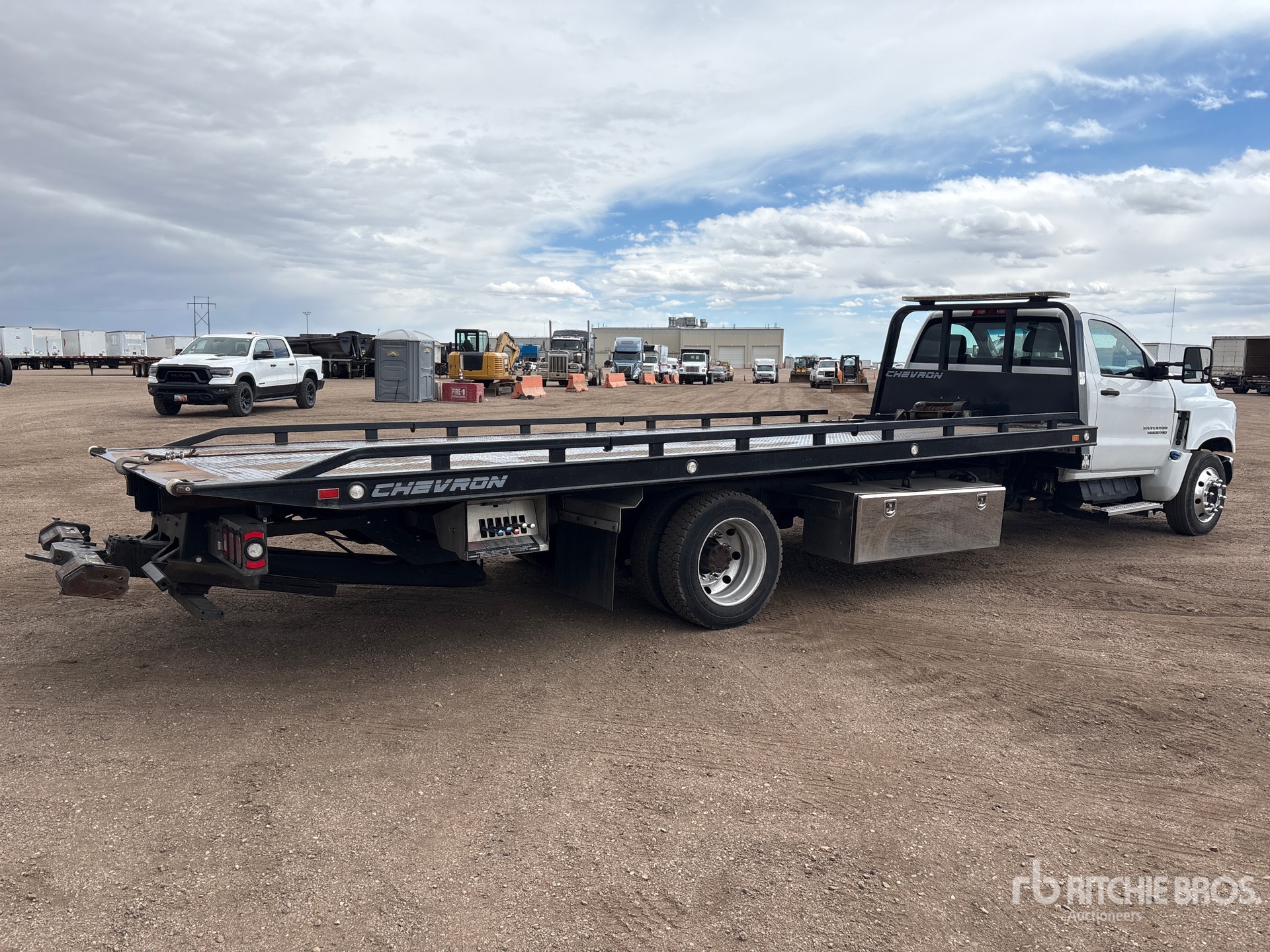 Moteur diesel V8 6,6 L de 350 ch, homologué EPA 2019, nécessite un additif pour carburant diesel, 8 881 heures de fonctionnement, frein moteur, transmission automatique Allison, essieu avant de 3 600 kg, essieu arrière de 6 800 kg, PTAC de 10 400 kg, jantes en aluminium, pneus 225/70R19.5, suspension pneumatique, empattement de 5,82 m, prise de force, plateau basculant Chevron Carrier, plateau de 6,4 m x 2,59 m, treuil Ramsey HD234 de 3 629 kg, système de levage hydraulique des roues