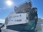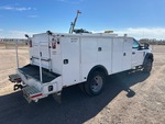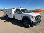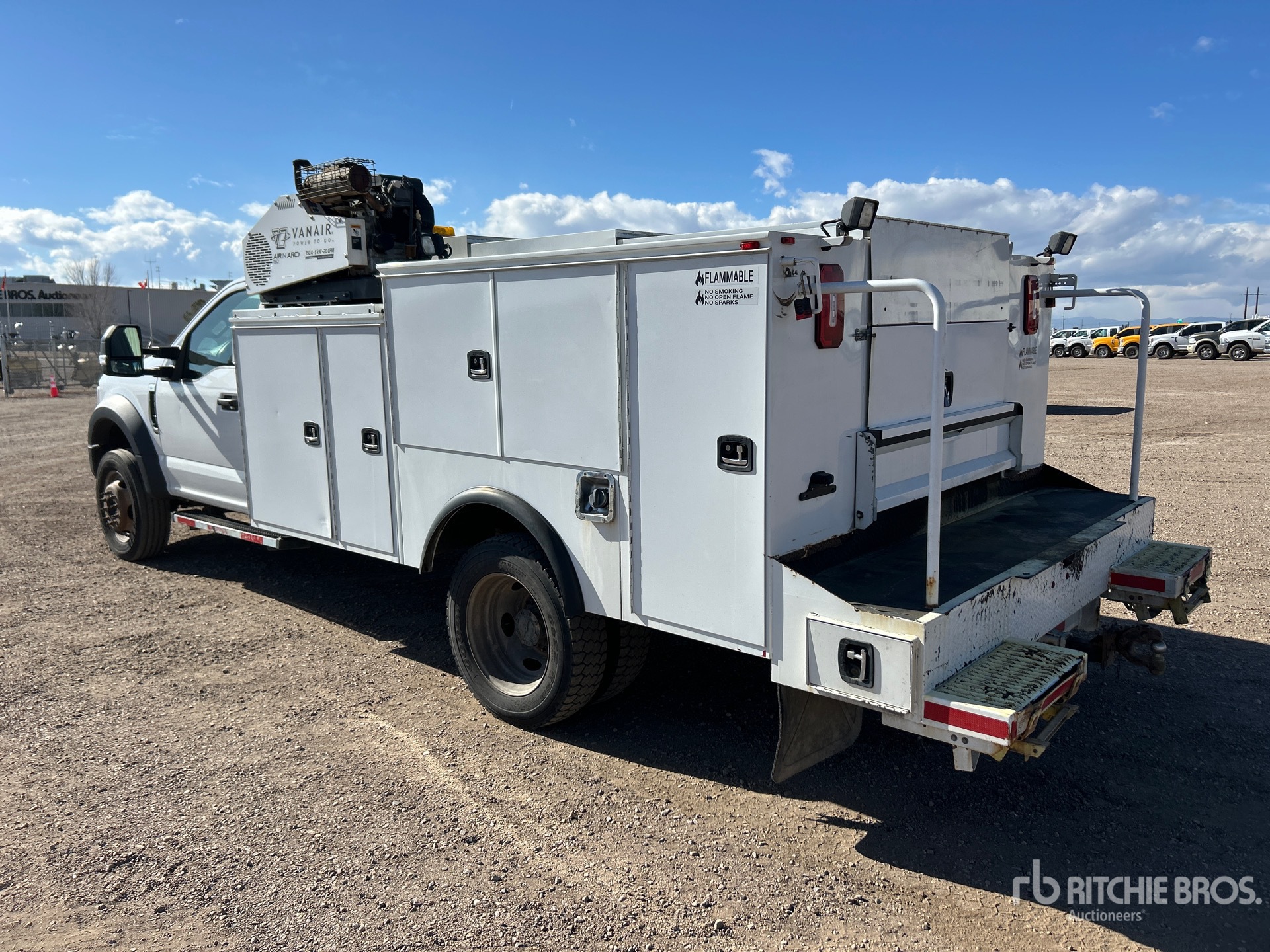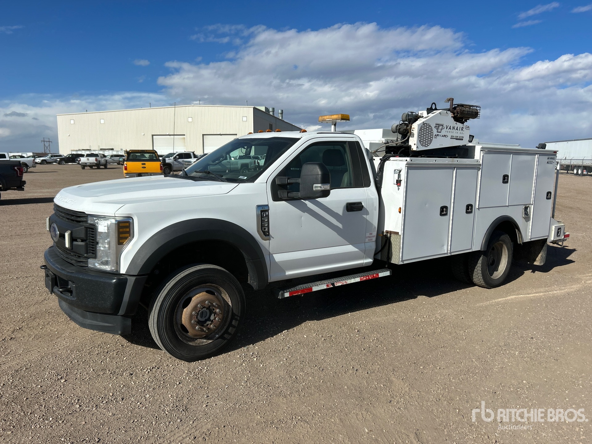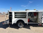 Moteur à essence V10 6,8 L, homologué EPA 2019, transmission automatique, essieu avant 2 540 kg, essieux arrière 6 670 kg, PTAC 8 845 kg, pneus 225/70R19.5, suspension à ressorts, empattement 4,30 m, benne Knapheide 3,35 m, compresseur d'air essence 566 m³/min, poste à souder essence 3 en 1 Vanair Airnarc 150 5 kW 150 A