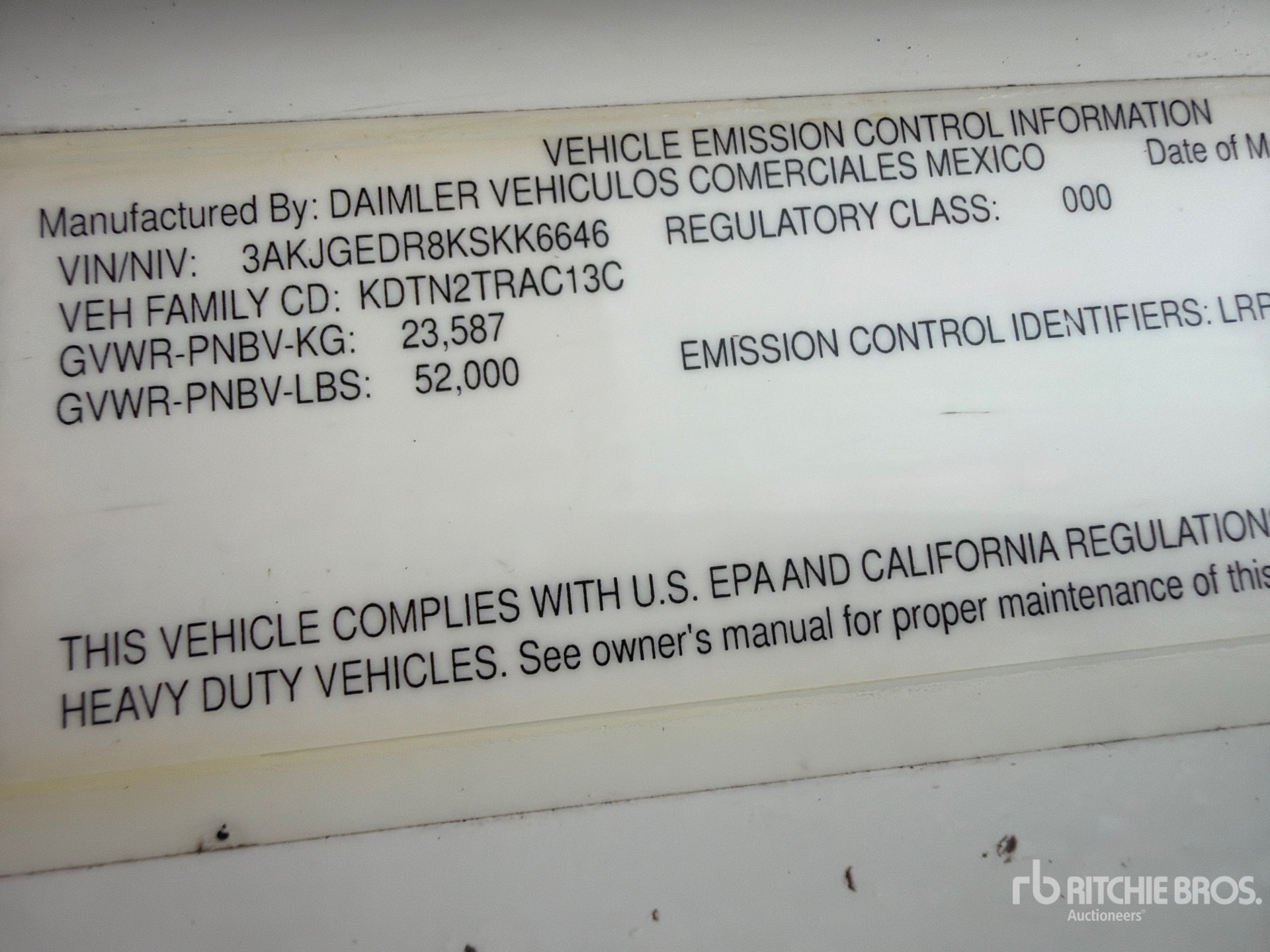 Moteur Detroit DD15 de 455 ch, transmission automatisée Detroit DT12-1650-OH1 à 12 rapports, essieu avant de 5443 kg (12 000 lb), essieu arrière de 1814 kg (40 000 lb), PTAC de 23 590 kg (52 000 lb), frein moteur, empattement de 4,52 m (178 po), suspension pneumatique, jantes en aluminium, pneus 11R22.5