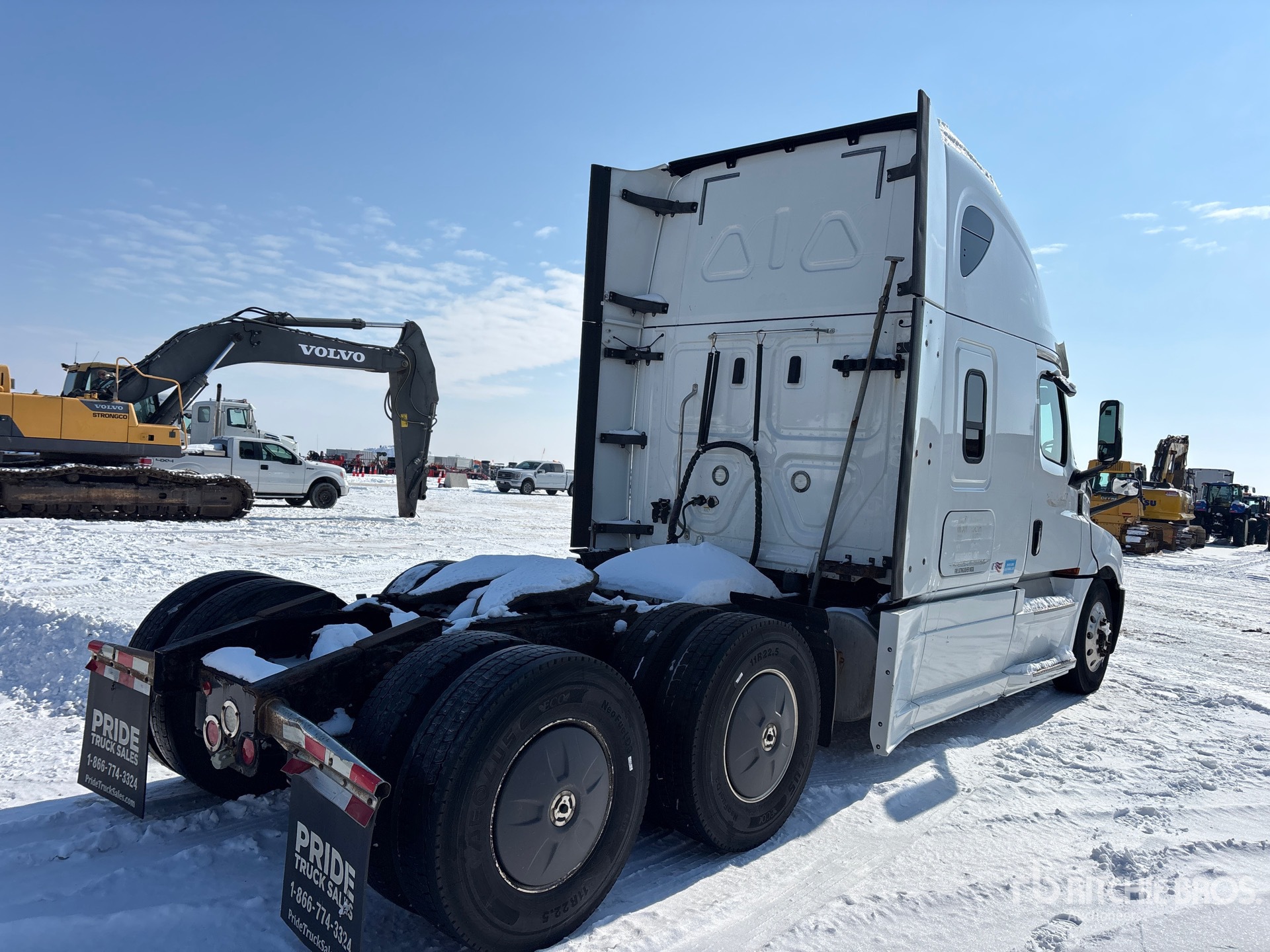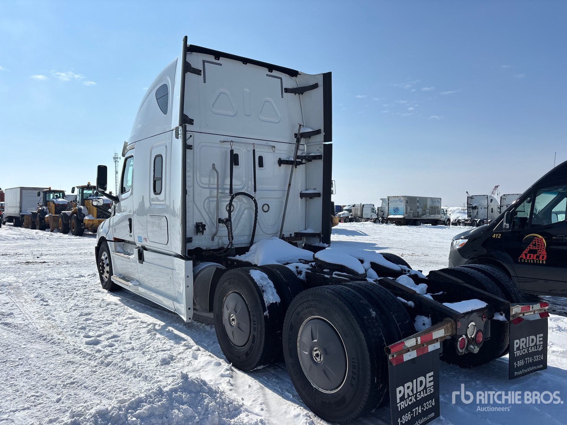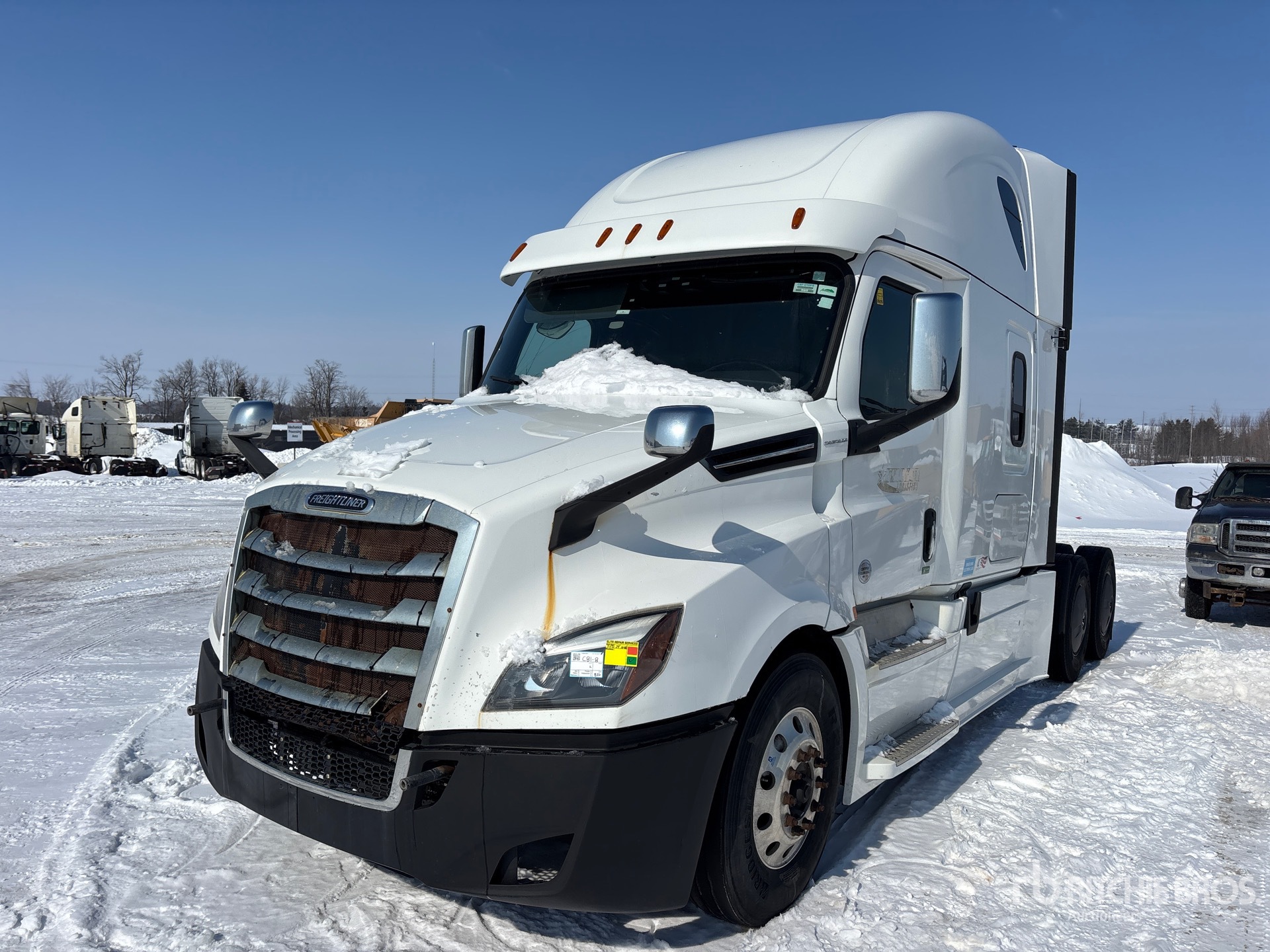 Situé sur la voie 9, emplacement 17, moteur Detroit DD15 de 505 ch, homologué EPA 2018, 20 871 heures de fonctionnement, transmission automatisée Detroit DT12-1650-OH1 à 12 vitesses, essieu avant de 13 220 lb, essieux arrière de 40 000 lb, PTAC de 53 220 lb, frein moteur, double blocage de différentiel, cabine couchette surélevée de 72 po, lits superposés, empattement de 229 po, suspension pneumatique, jantes en aluminium, pneus 11R22.5, sellette d'attelage coulissante pneumatique, double réservoir de carburant.
