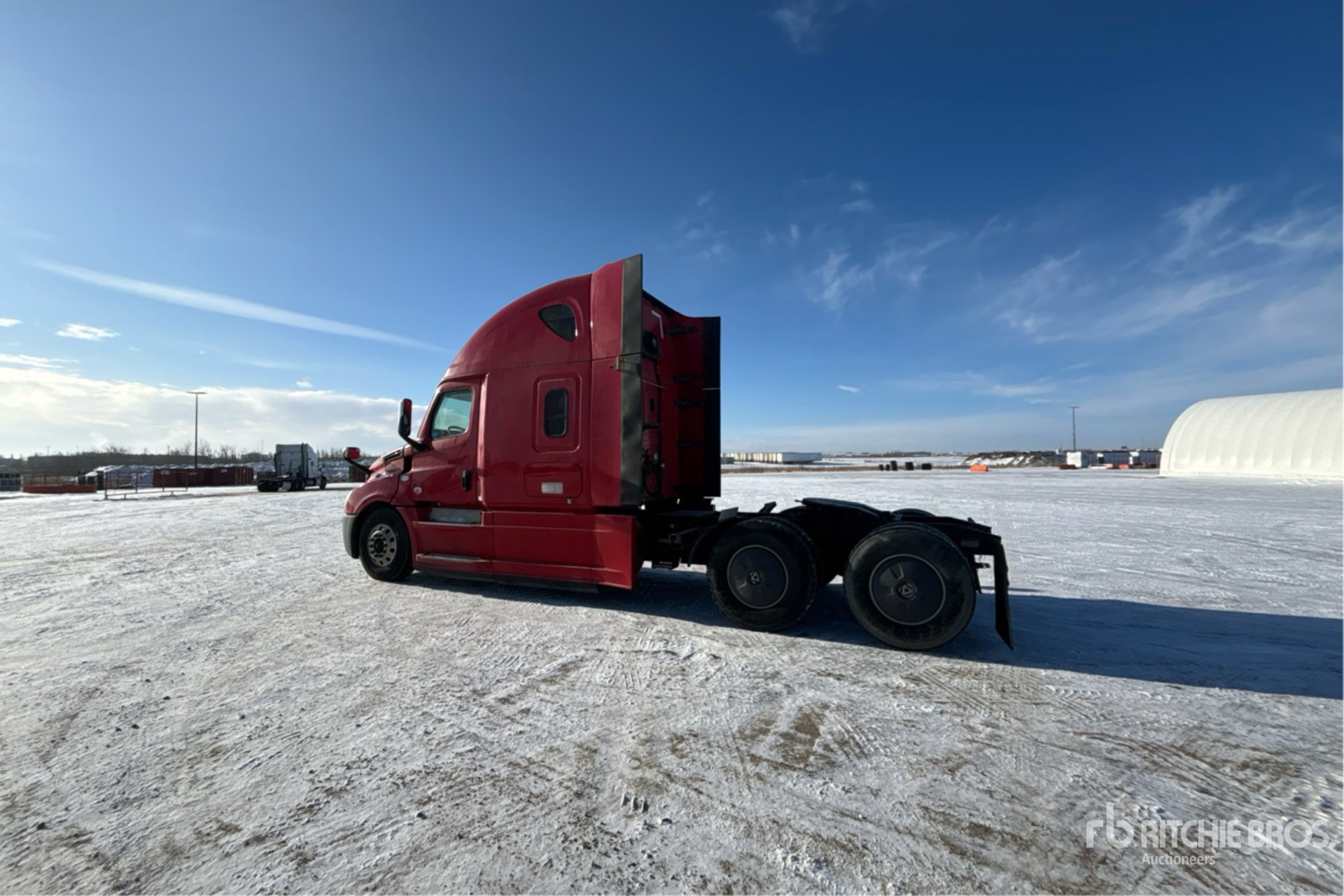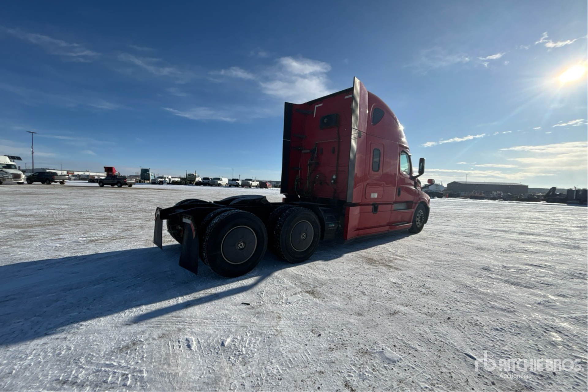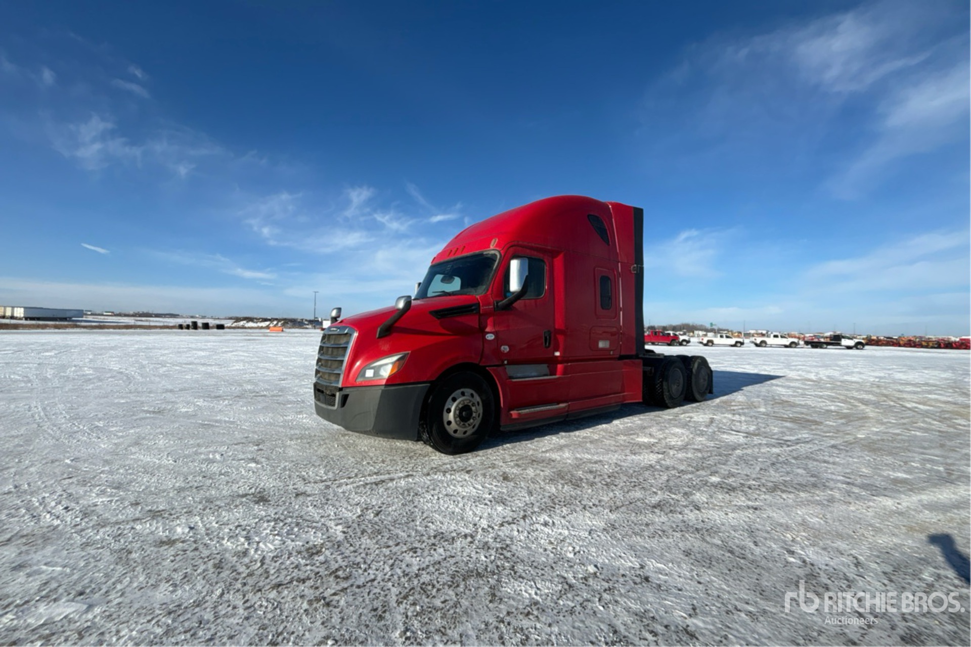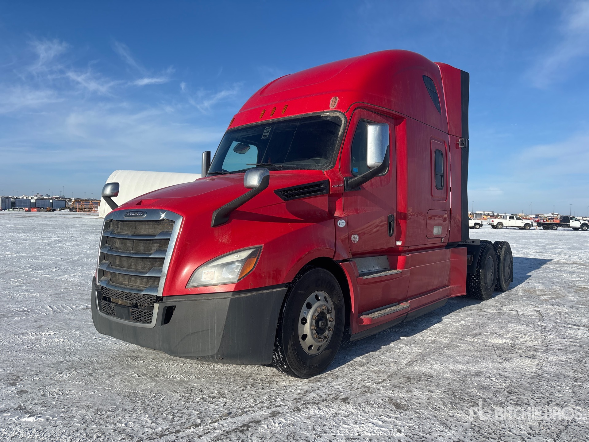 Situé sur la voie 33, emplacement 4, moteur Detroit DD15 de 505 ch, étiquette EPA américaine 2018, 14 368 heures de fonctionnement, transmission automatisée Detroit DT12-1750-OH1 à 12 vitesses, essieu avant de 13 200 lb, essieux arrière de 40 000 lb, PTAC de 53 200 lb, frein moteur, double blocage de différentiel, couchette de 60 po, lits superposés, groupe auxiliaire de puissance, empattement de 237 po, suspension pneumatique, pneus 11R22.5, sellette d'attelage coulissante pneumatique, deux réservoirs de carburant.
